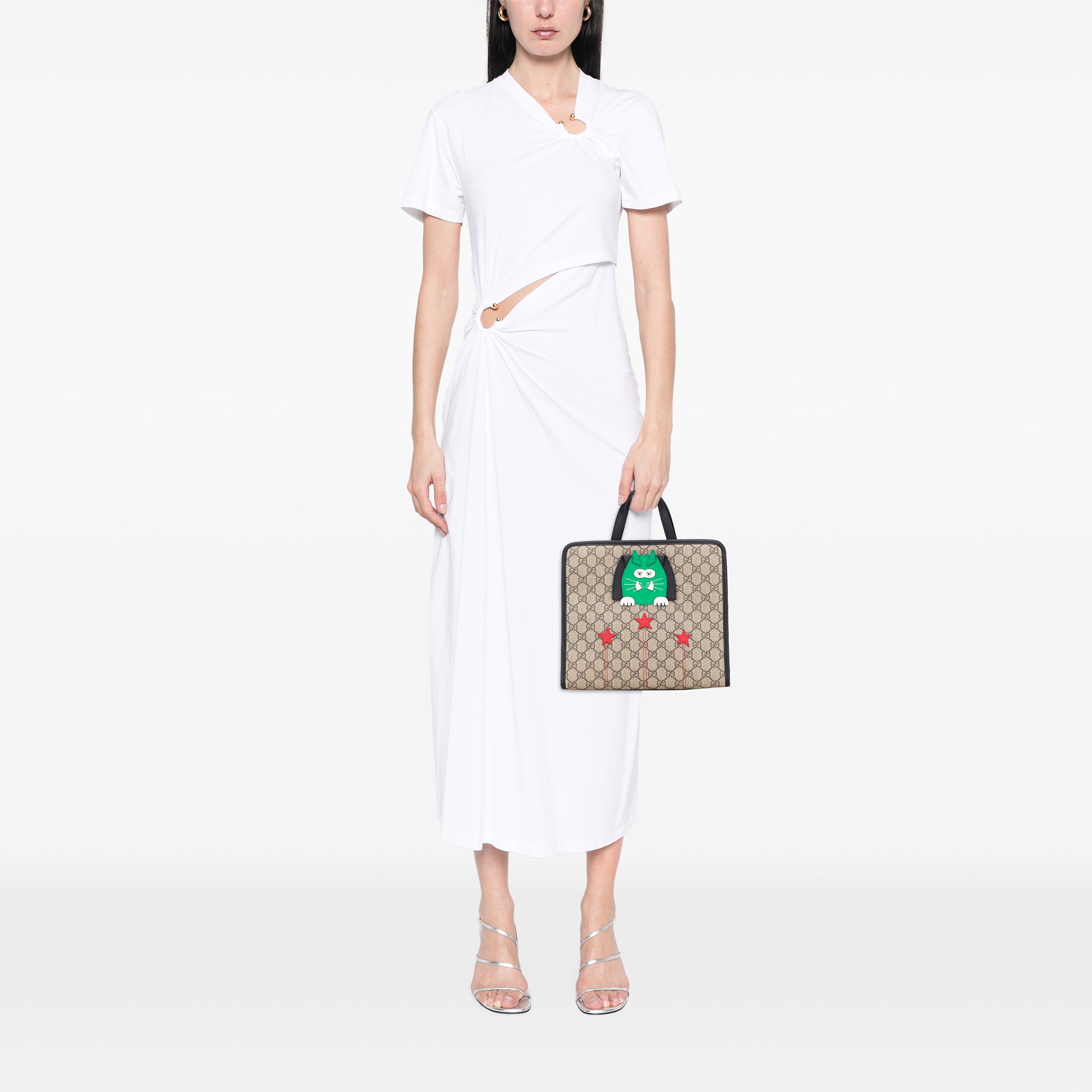 Product Details: Beige Gucci Childrens GG Supreme Cat Tote. This tote bag features a coated canvas body, flat leather handles, an open top with magnetic snap closure, and an interior slip pocket. 9.8" L x 11.2" W x 3.9" D, 3.5" drop. Serial number 645290 527066.
