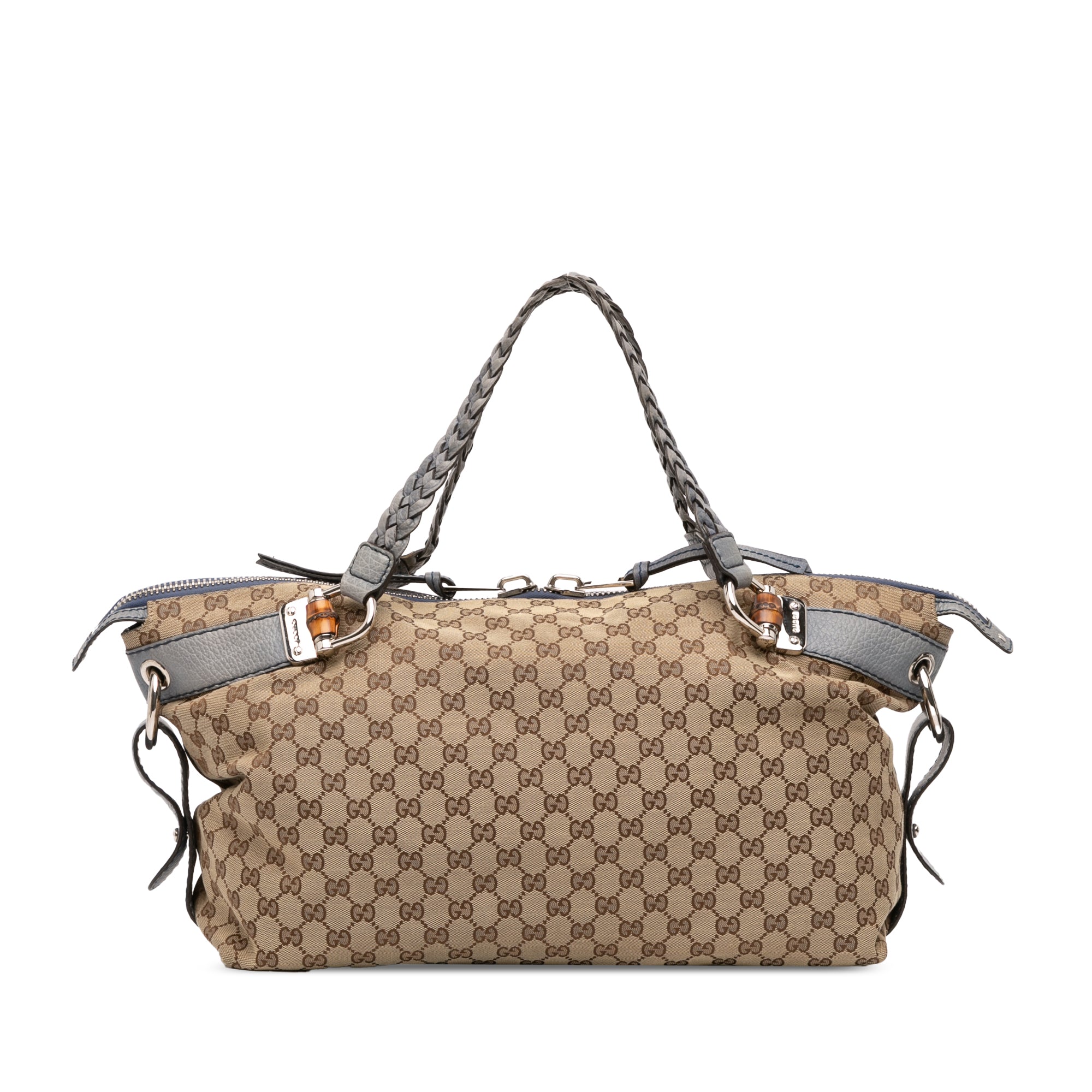 Product Details: Beige Gucci Medium GG Canvas Bamboo Bar Tote. This tote features a canvas body with leather trim, braided leather straps, a top zip closure, and interior zip and slip pockets. 11.4" L x 16.1" W x 5.7" D. Serial number 232959 467891.