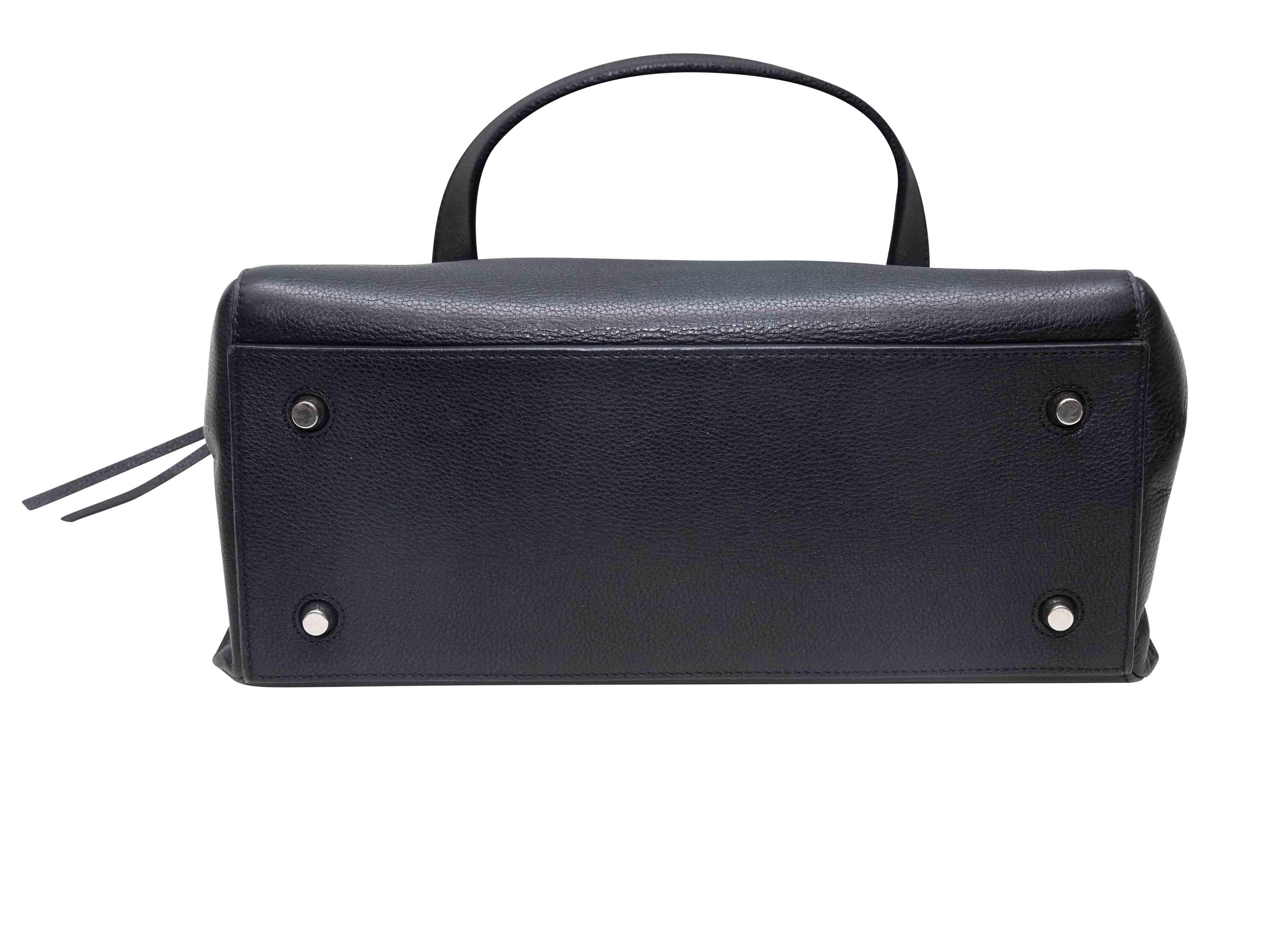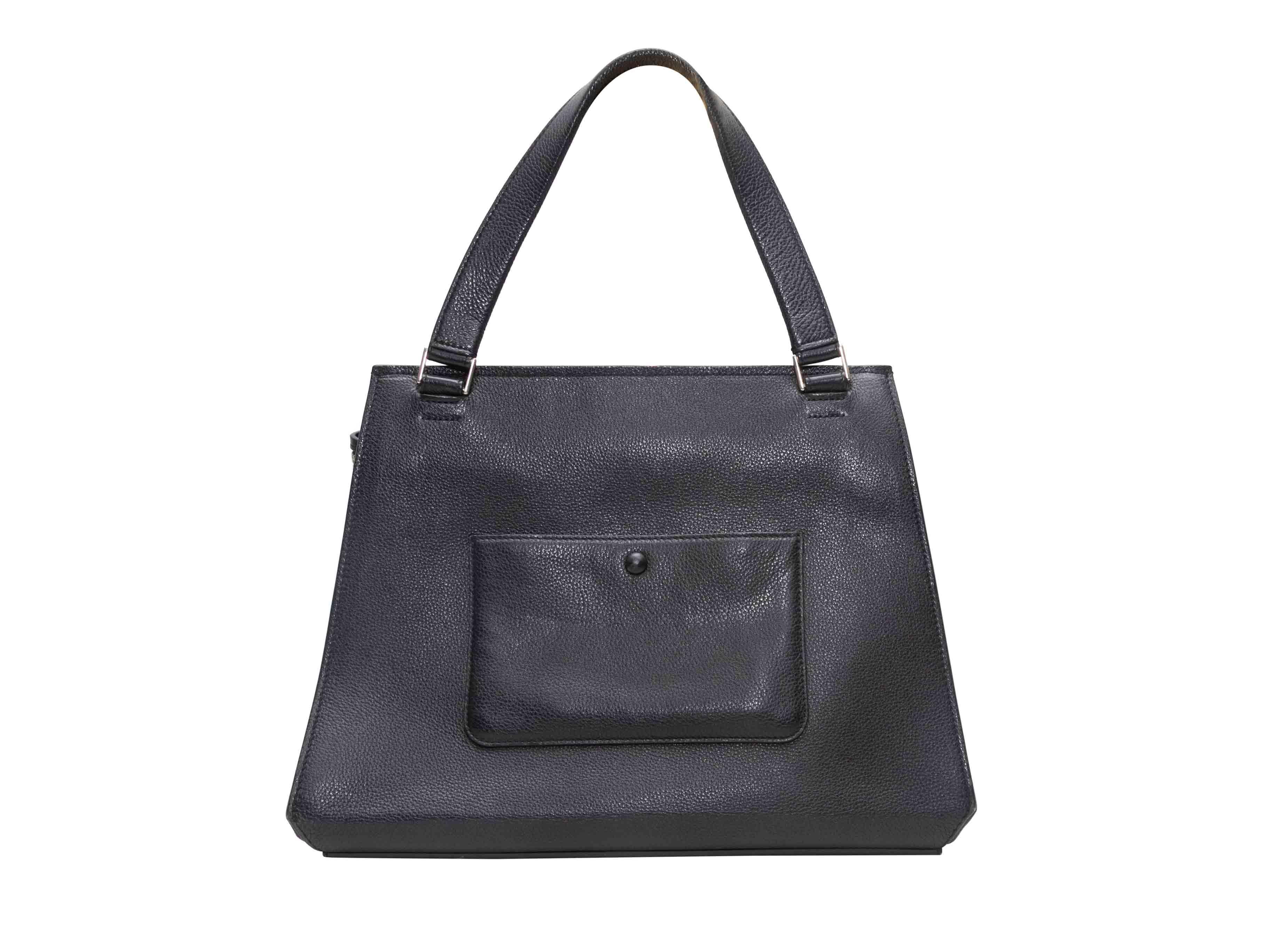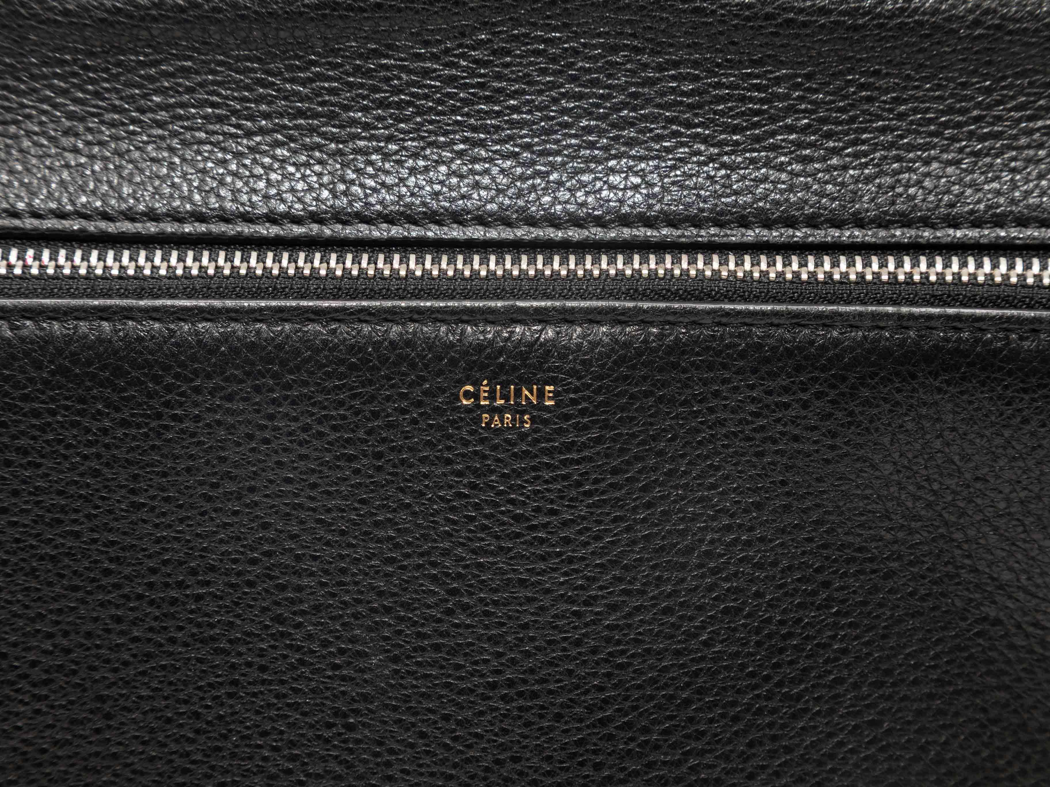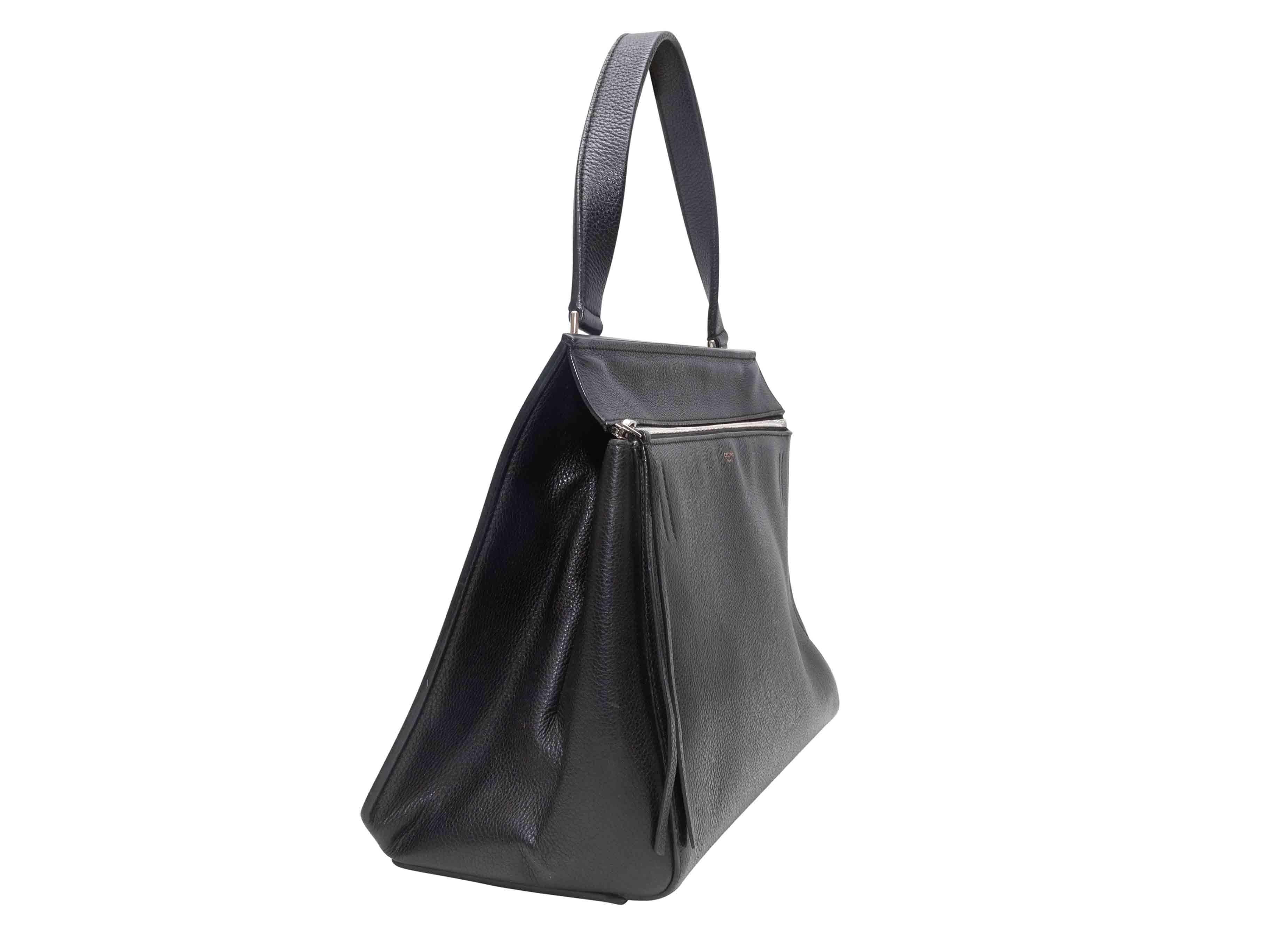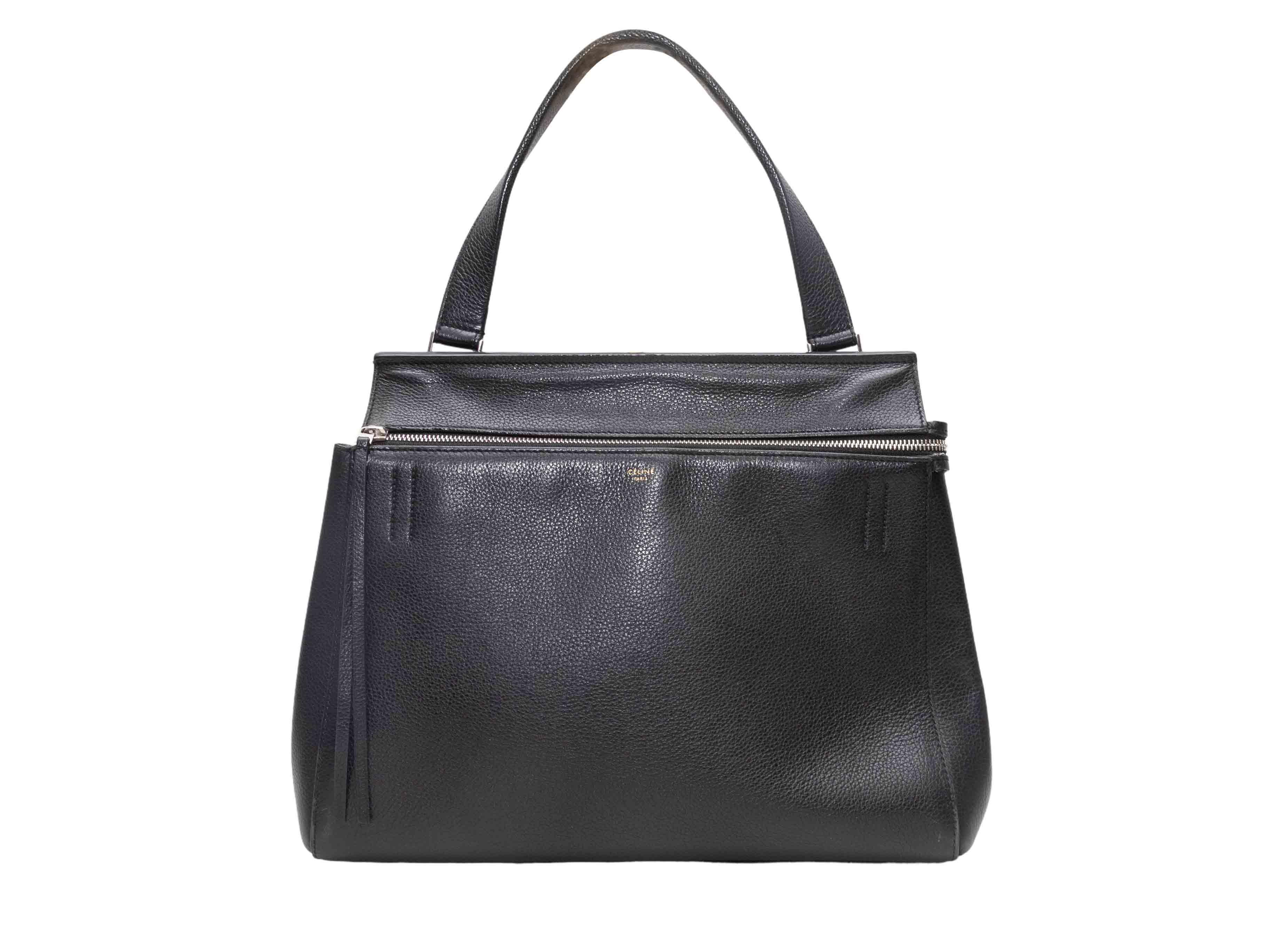 Product Details: Black Celine Edge Leather Handbag. The Edge Handbag features a leather body, silver-tone hardware, a single flat top handle, an external back pocket, and a top zip closure. 14" L x 10.5" H x 5" D, 6.5" handle drop.