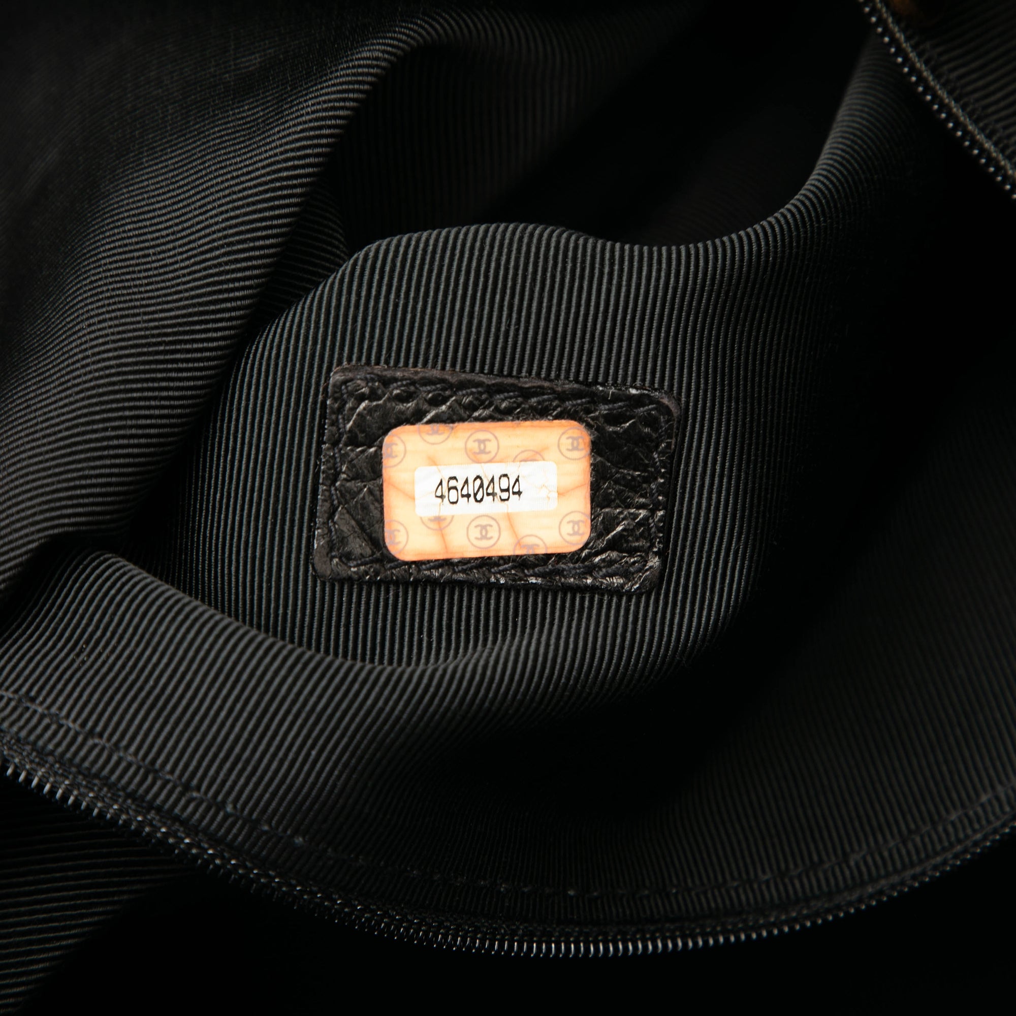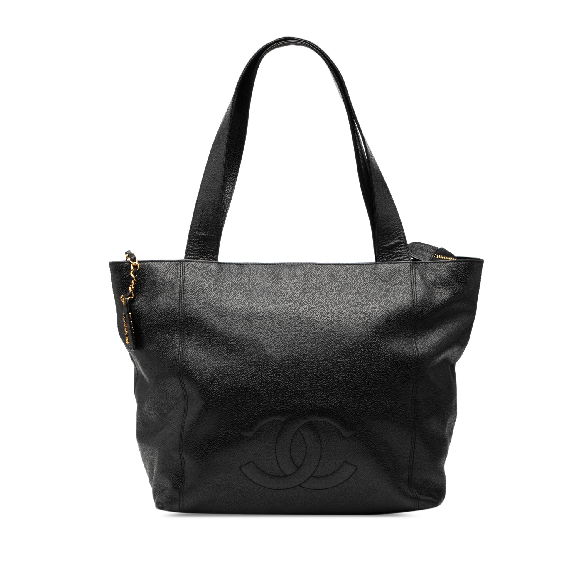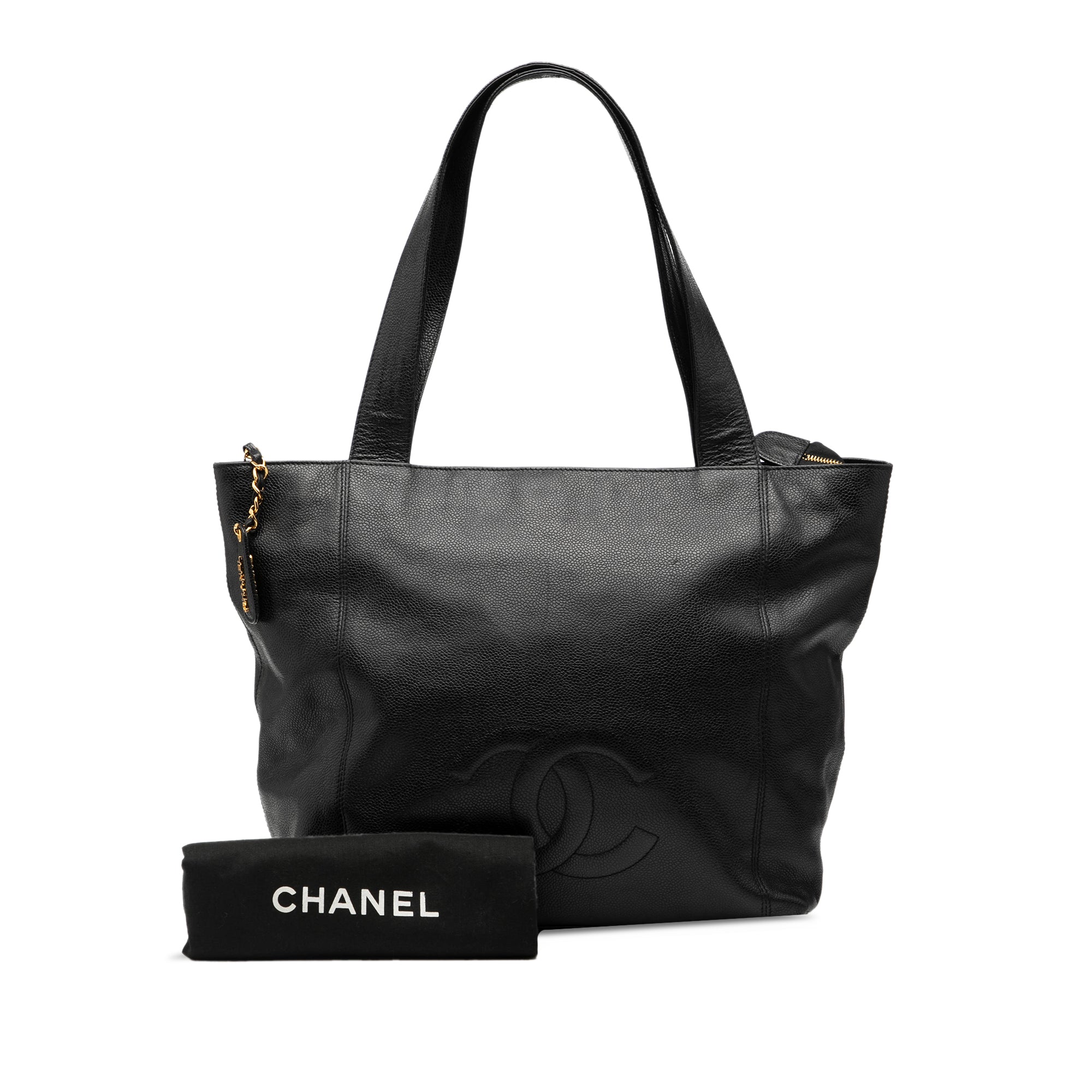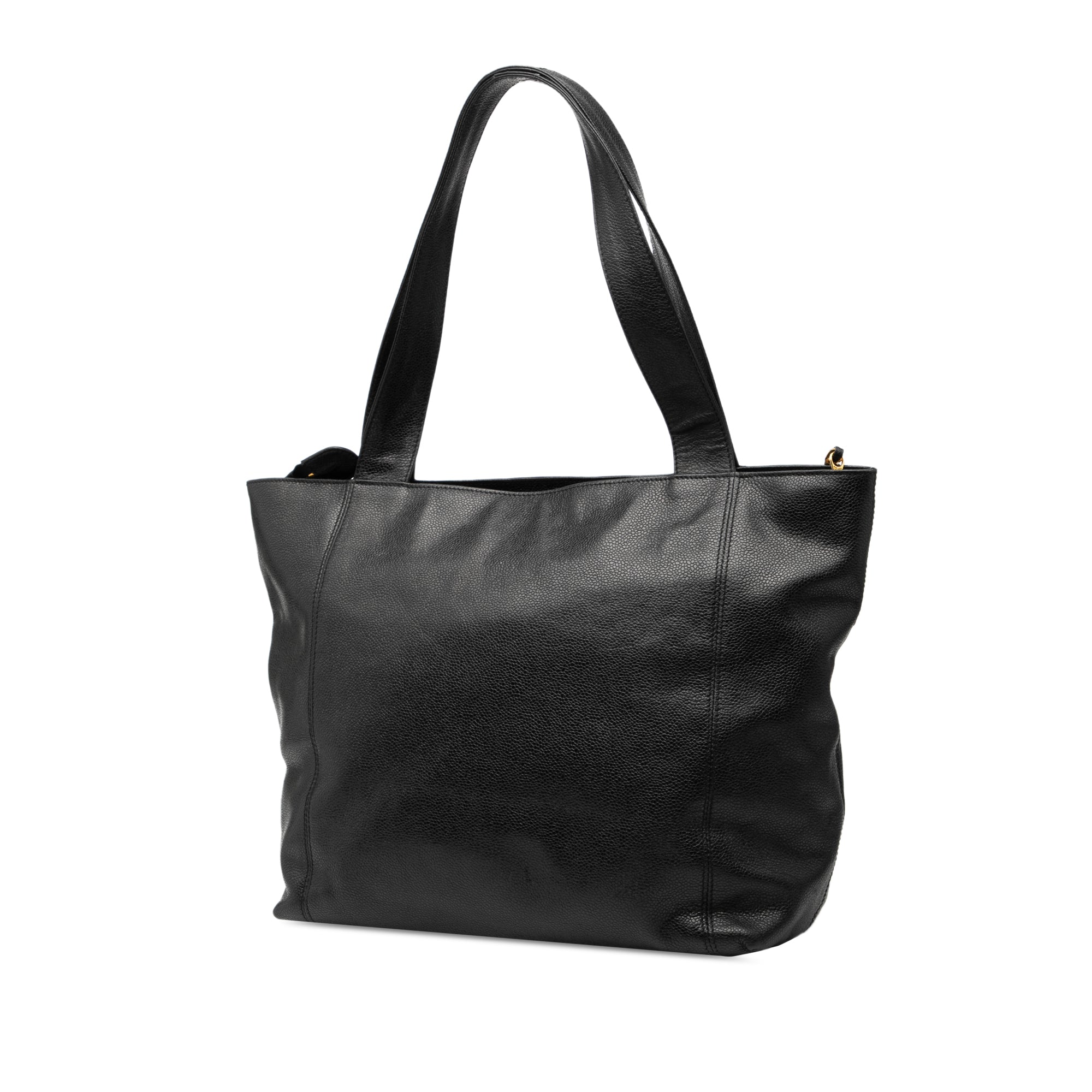 Product Details: Black Chanel CC Caviar Tote. This tote bag features a caviar leather body, flat leather straps, a top zip closure, and an interior zip pocket. 11.8" L x 13" W x 6.7" D, 9.8" drop. Serial number 4640494.