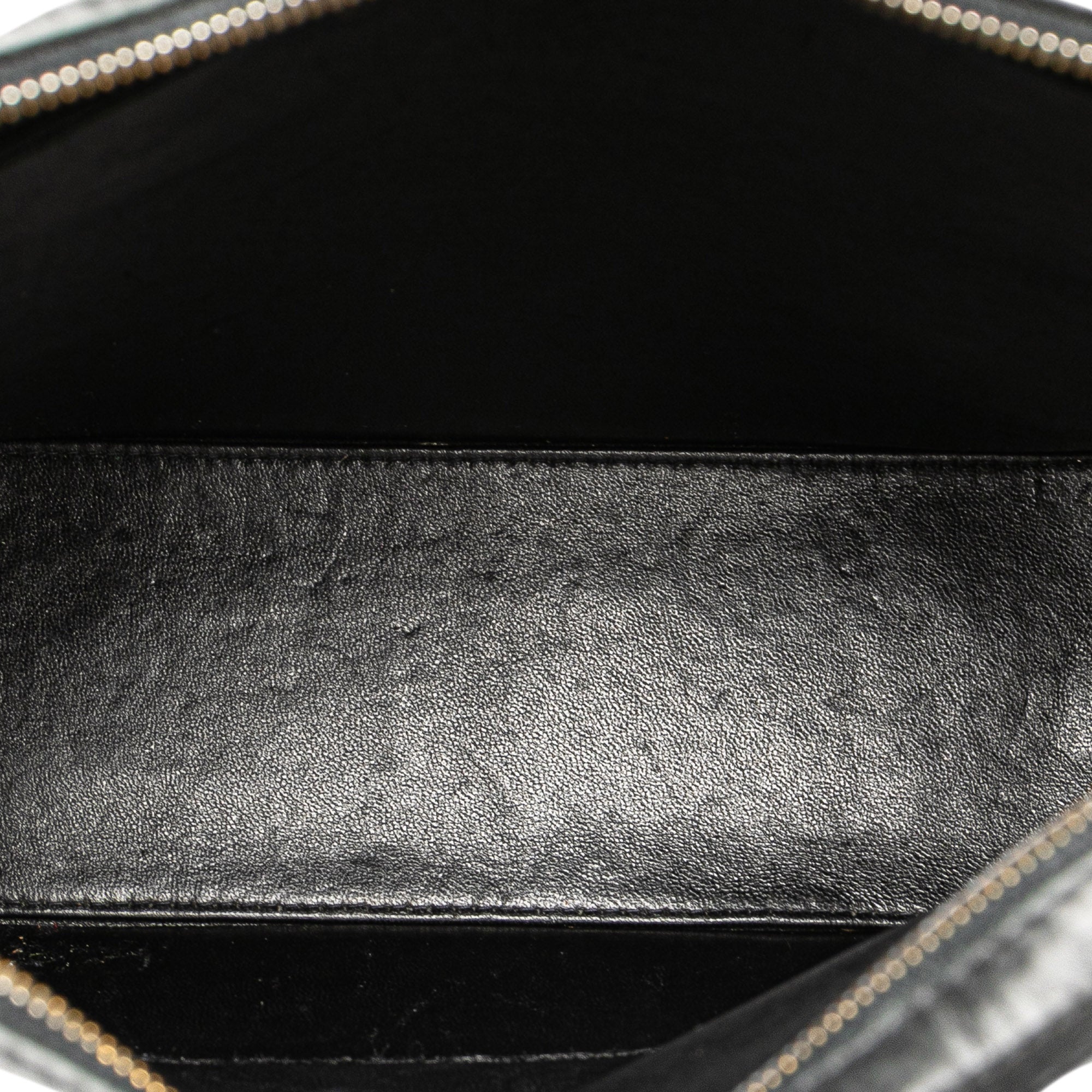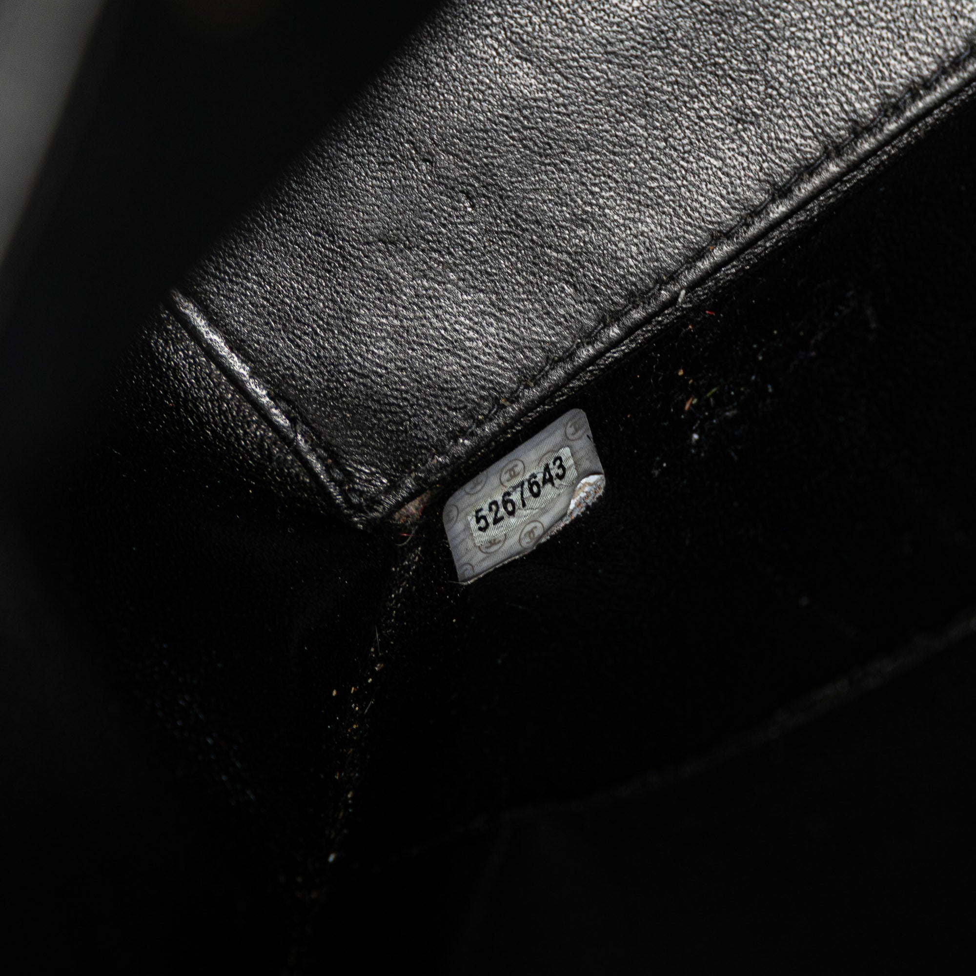 Product Details: Black Chanel Lambskin Embroidered Logo Tote. This tote features a lambskin leather body with embroidered logo, flat leather straps, a top zip closure, an exterior slip pocket, and interior zip and slip pockets. 10.6" L x 10.4" W x 3.9" D, 7.1" drop. Serial number 5267643.