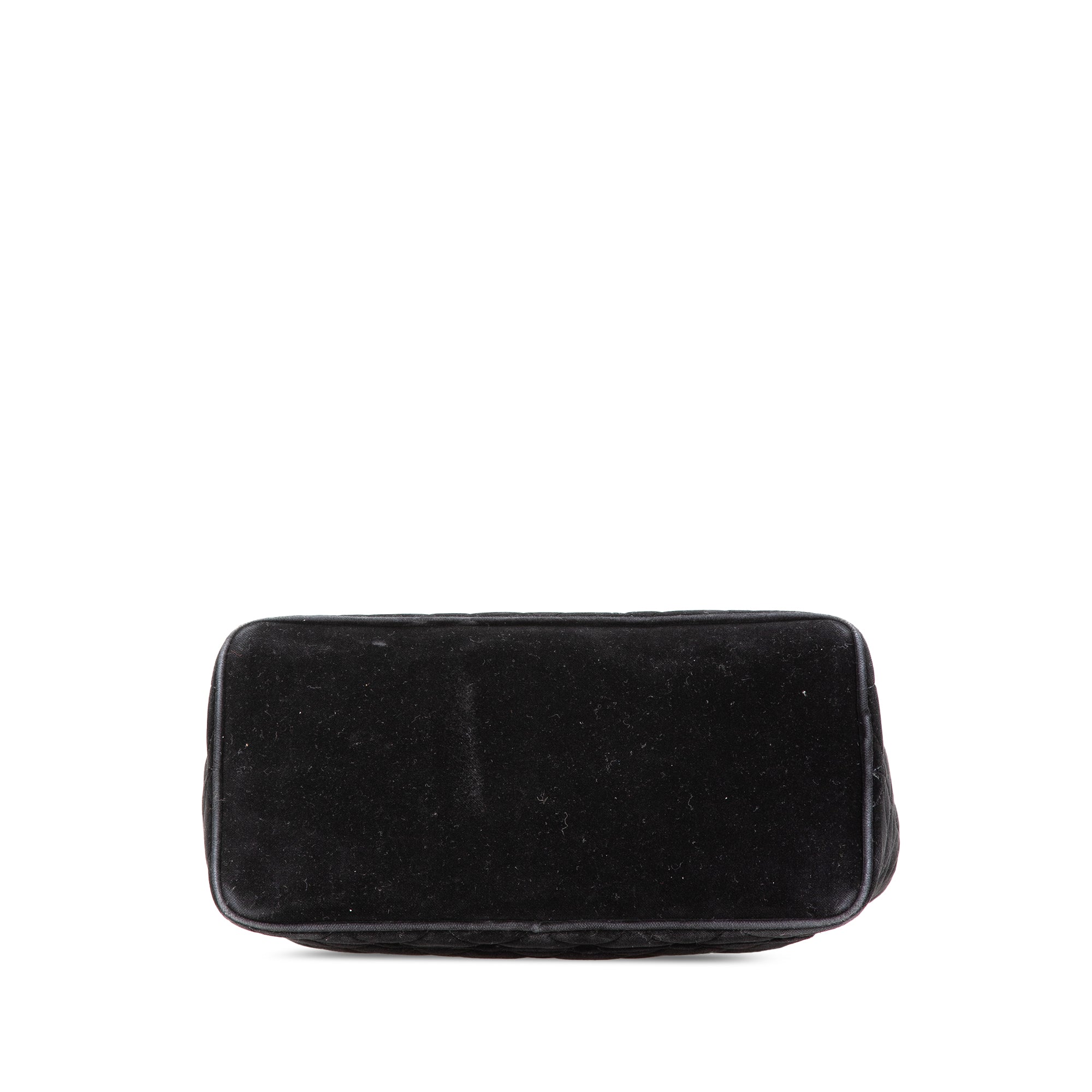 Product Details: Black Chanel Velvet Medallion Tote. The Medallion tote bag features a quilted velvet body, rolled handles, a top zip closure, an exterior back slip pocket, and interior zip and slip pockets. 9.4" L x 11.8" W x 5.7" D, 6.3" drop. Serial number 5412063.