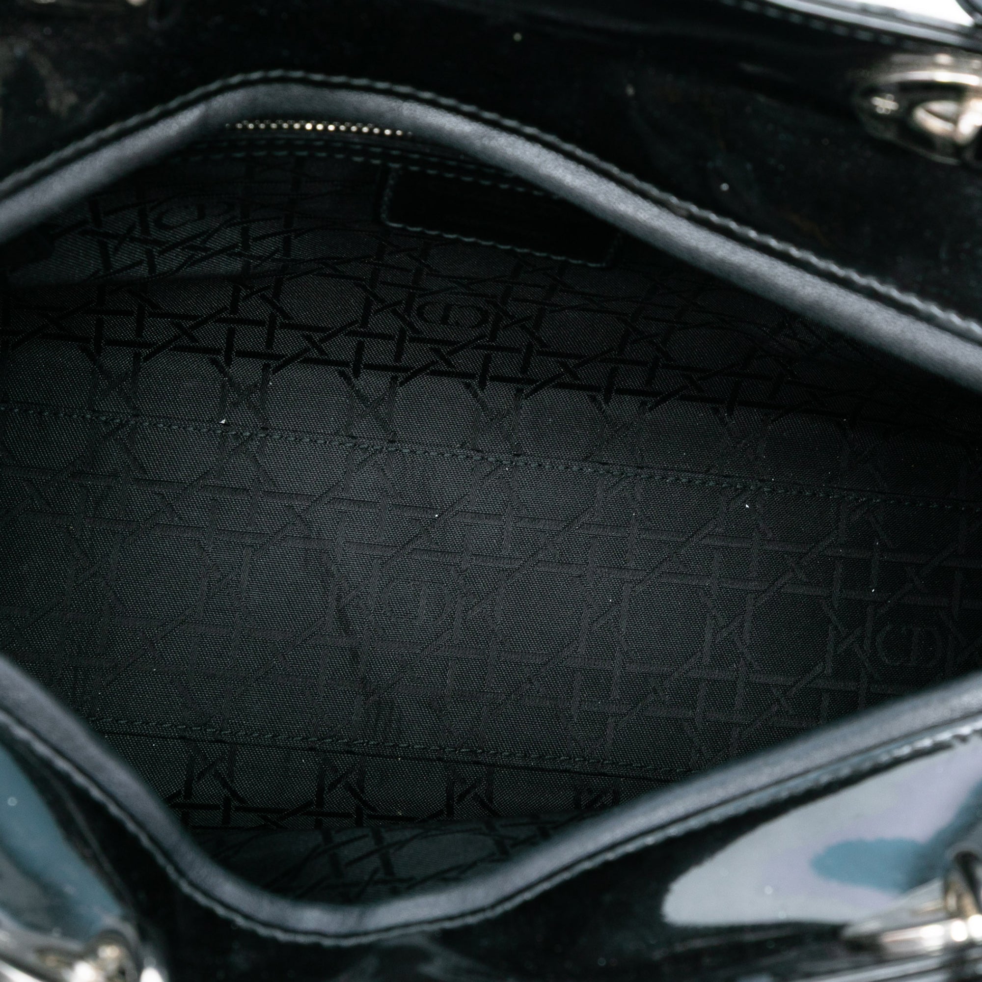 Product Details: Black Dior Large Patent Cannage Lady Dior Satchel. The Lady Dior features a quilted patent leather body, flat leather top handles, a detachable flat strap, a top zip closure, and an interior zip pocket. 10.2" L x 12.6" W x 3.5" D, 3.9" drop. Serial number 16-BO-0114.