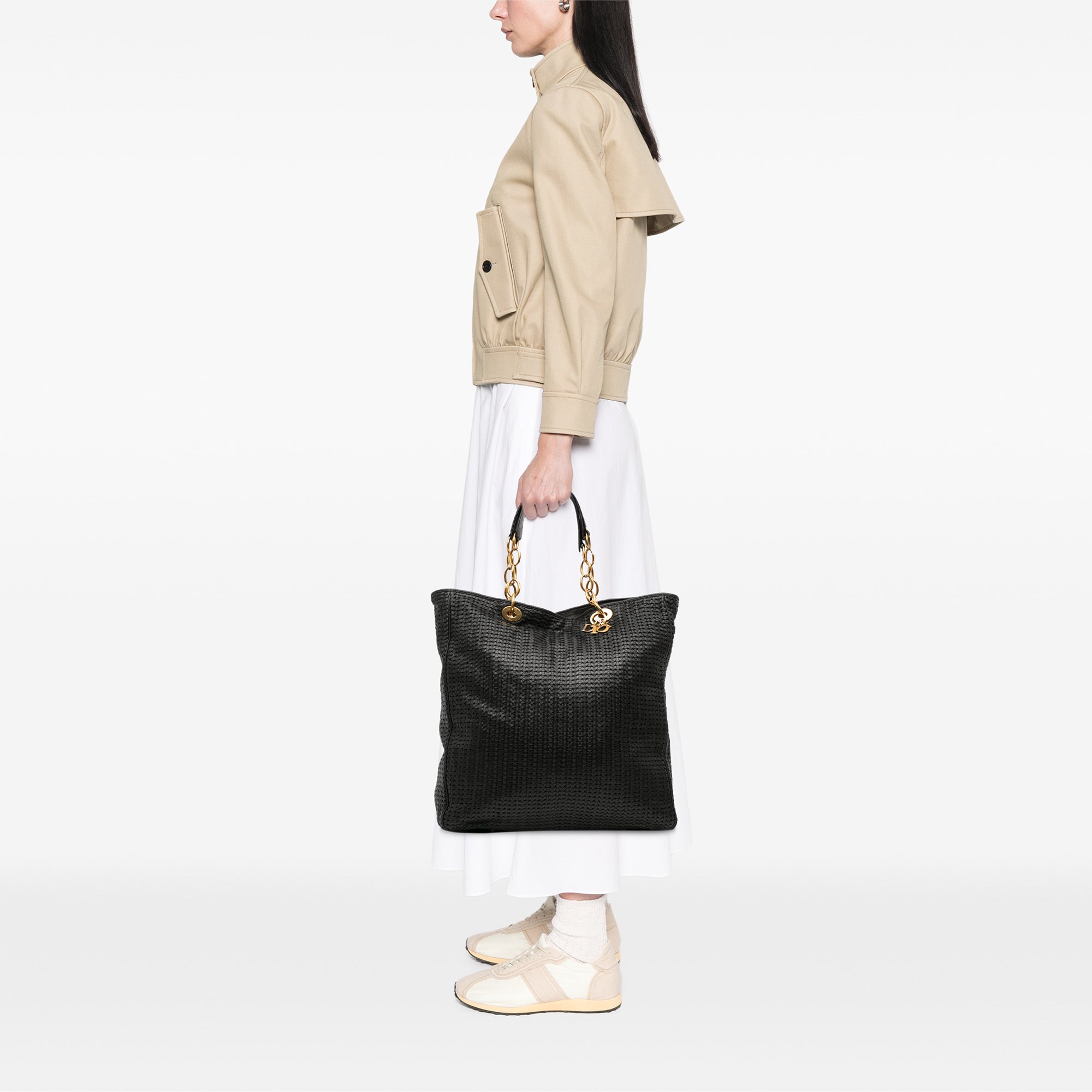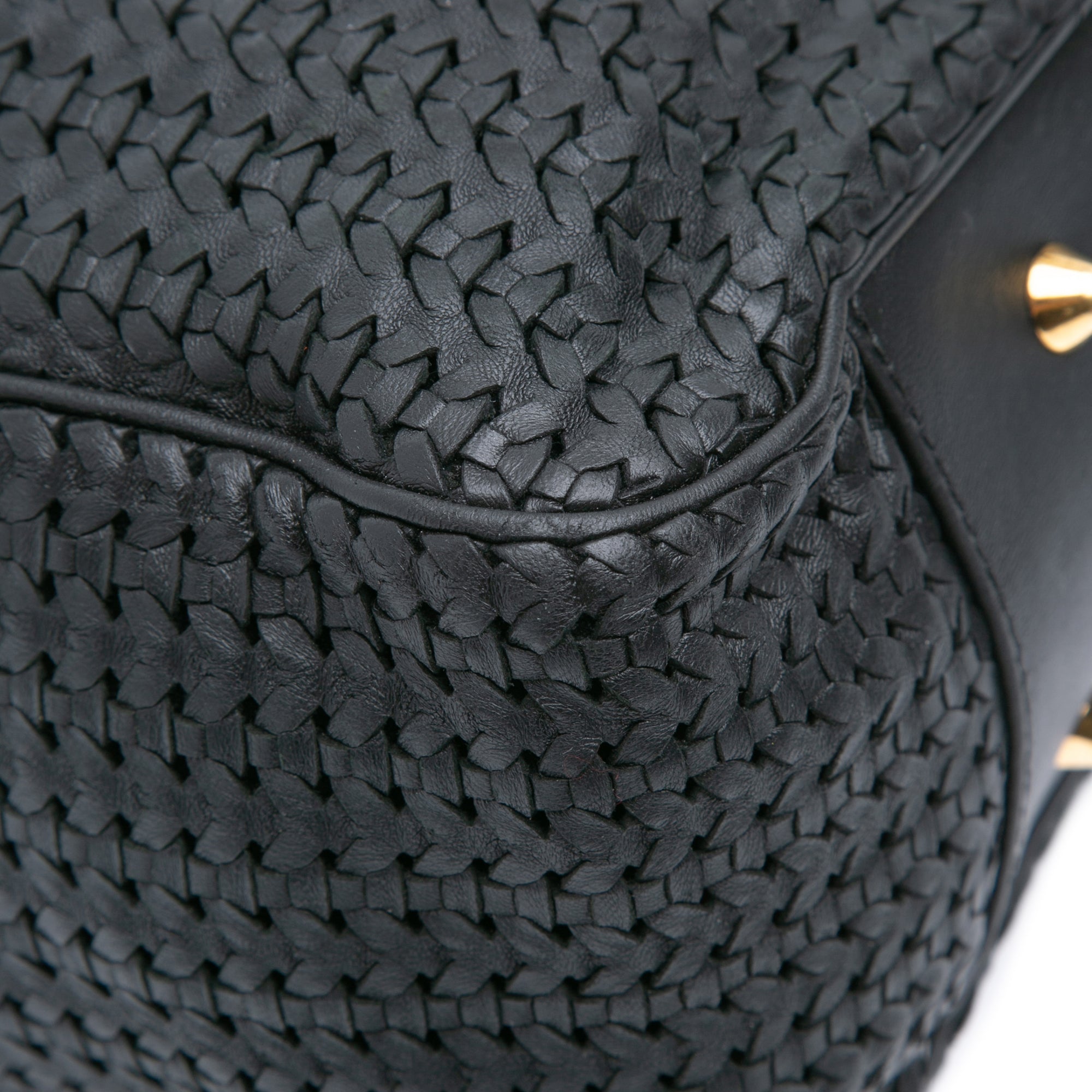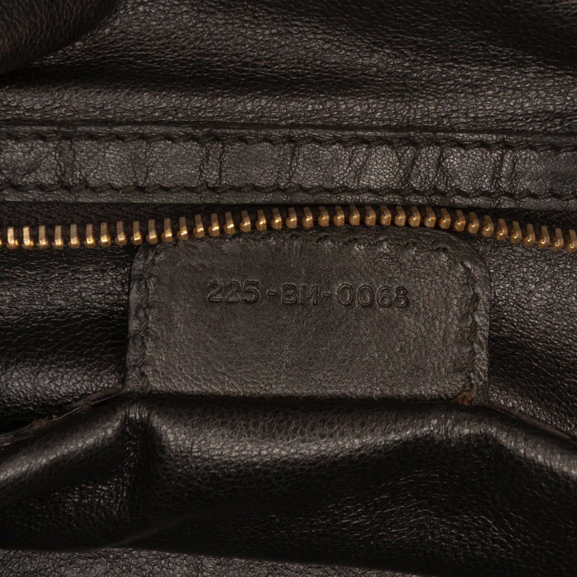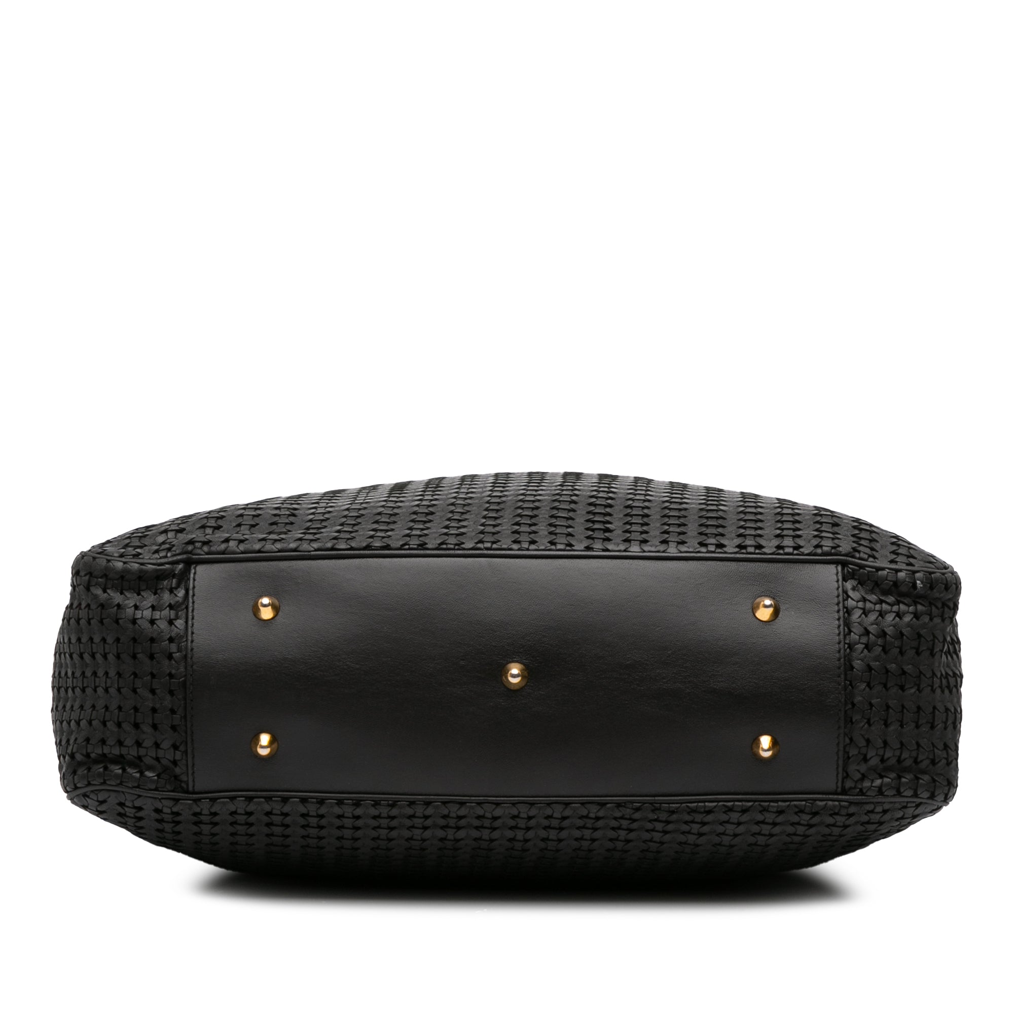 Product Details: Black Dior Large Woven Lambskin Lady Dior Soft Shopping Tote. This tote bag features a woven leather body, chain link and flat leather handles, an open top with magnetic snap closure, and interior zip and slip pockets. Exterior bottom has been repainted. 16.5" L x 15.4" W x 4.3" D. Serial number 225-BM-0068.
