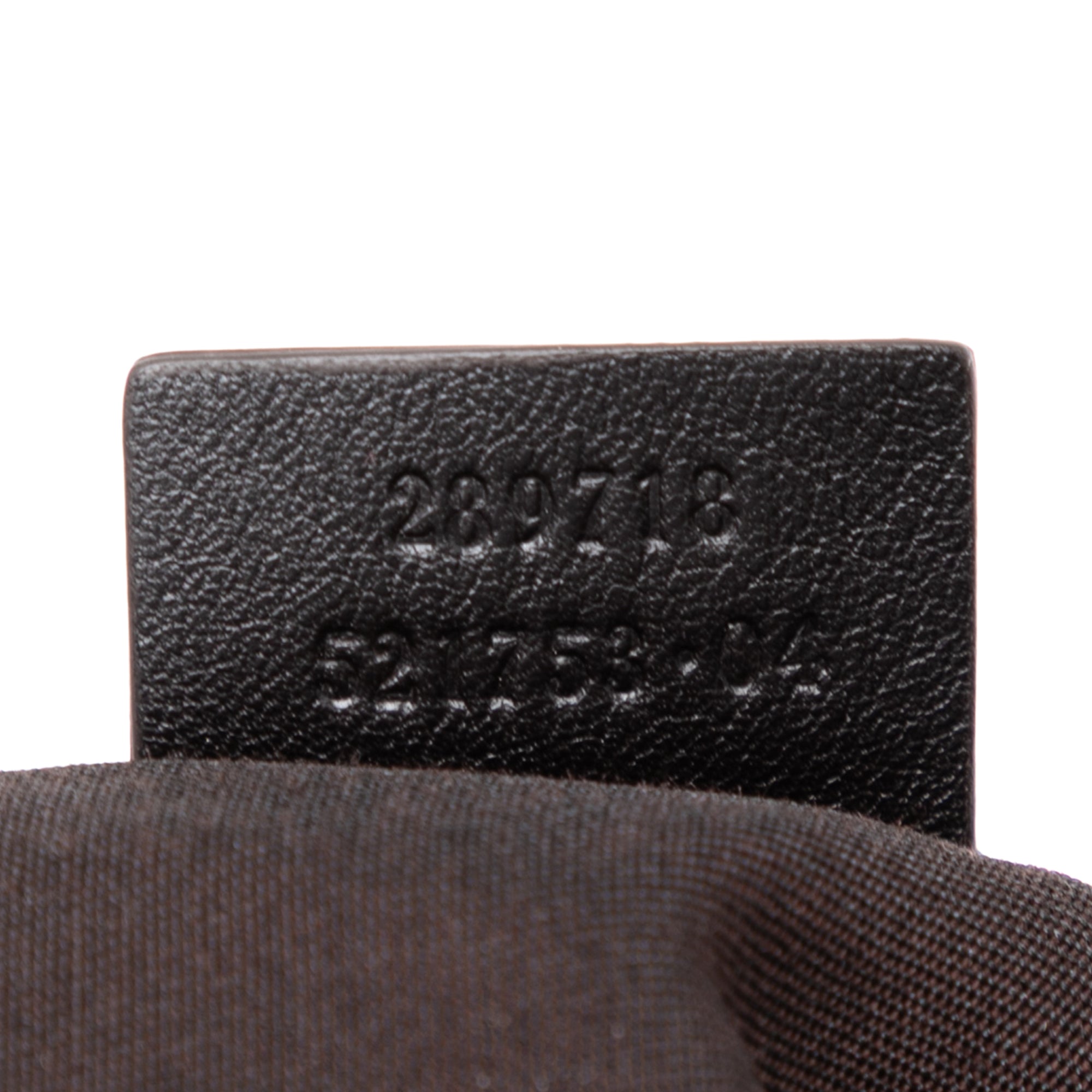Product Details: Black Gucci Embossed Leather Horsebit Satchel. This satchel bag features a leather body, rolled leather handles, a top zip closure, and an interior zip pocket. 11.8" L x 13.4" W x 6.3" D, 3.7" drop. Serial number 289718 521753・04.