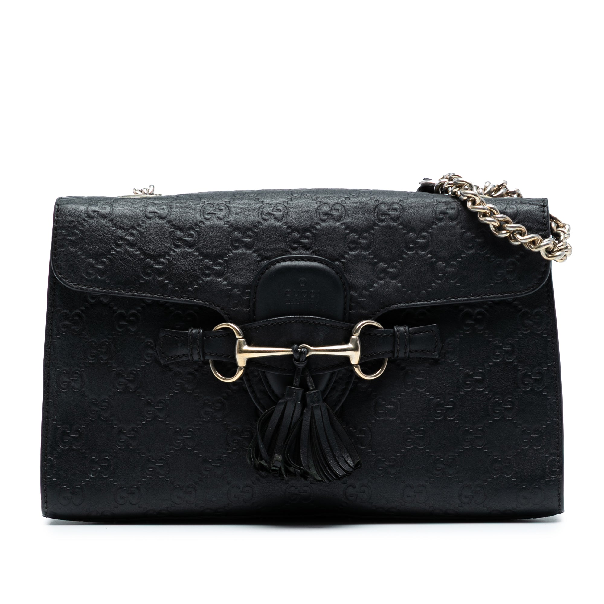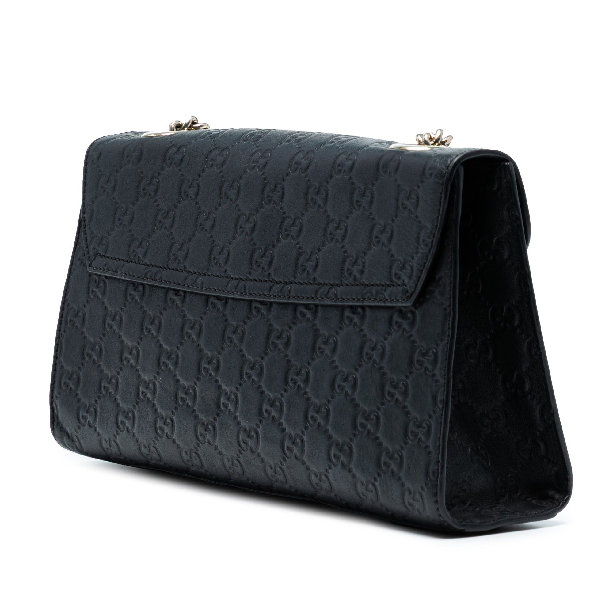 Product Details: Black Gucci Medium Guccissima Emily Shoulder Bag. The Emily features an embossed leather body, a chain link shoulder strap, a front flap with pull-through closure, and interior slip pockets. Strap has been repainted. 7.5" L x 11.4" W x 2.4" D. Serial number 295402 21331.