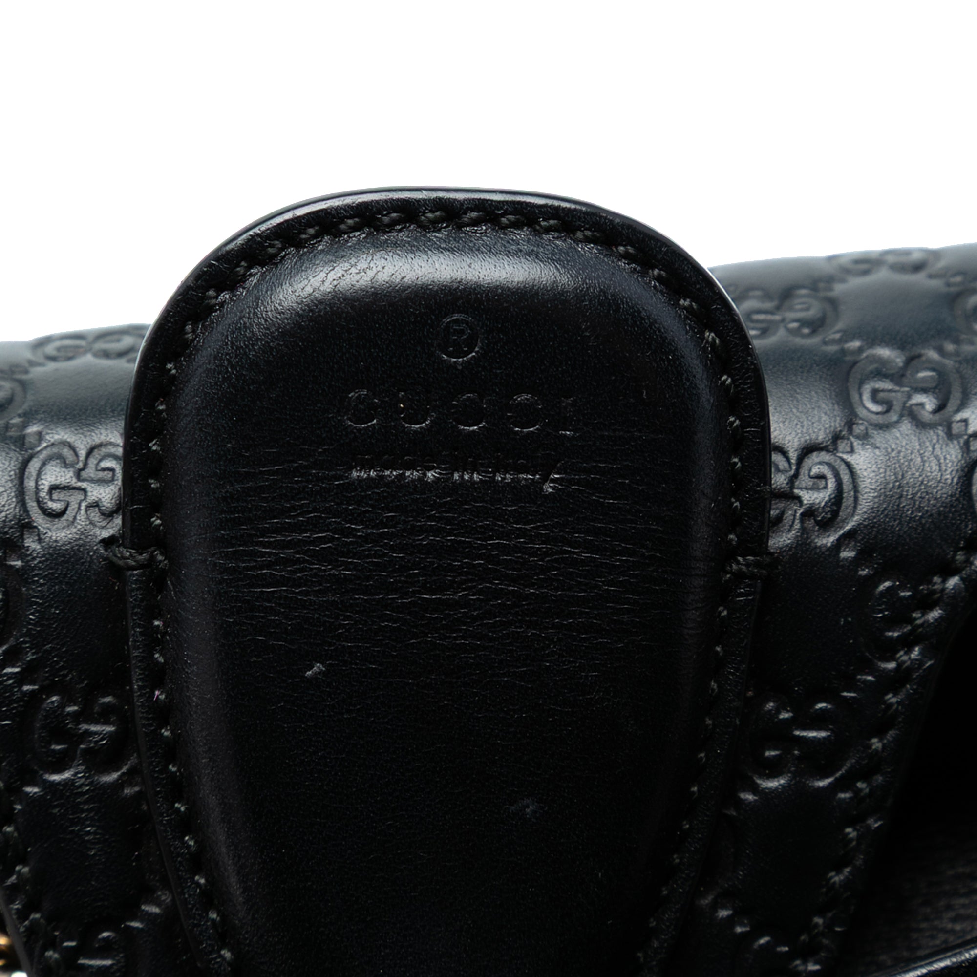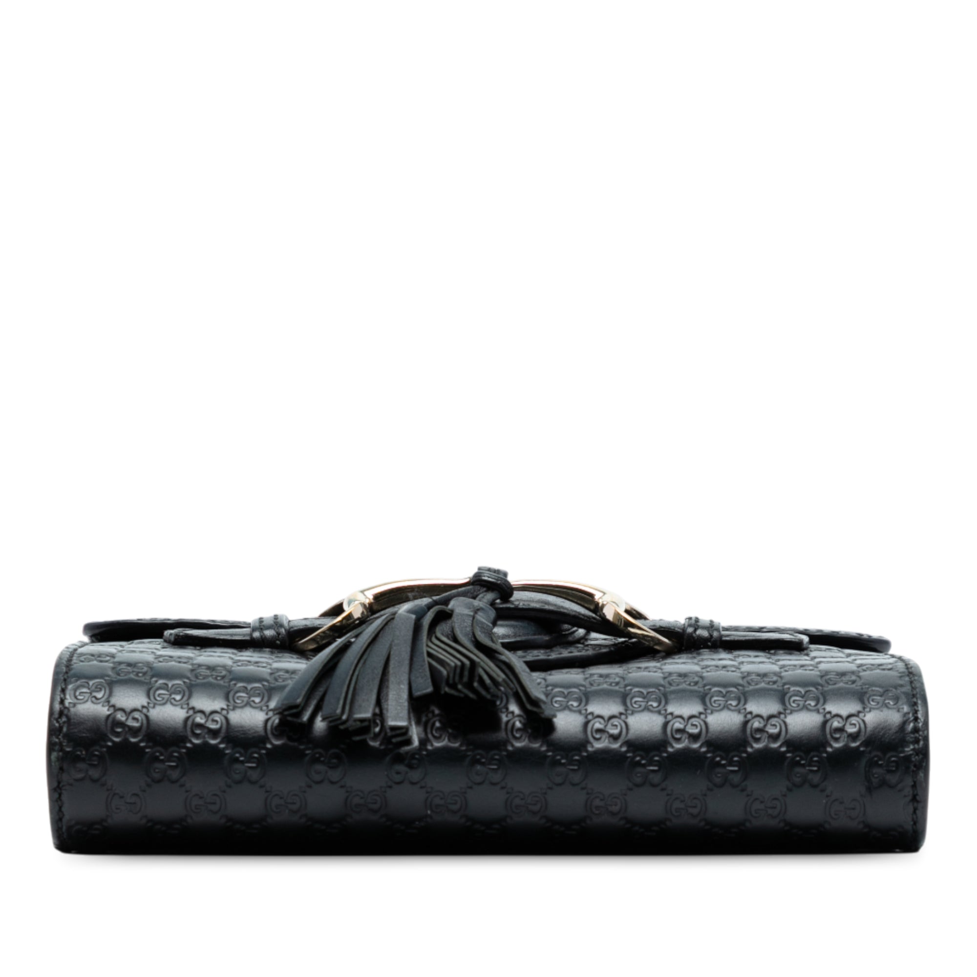 Product Details: Black Gucci Mini Microguccissima Emily Crossbody. The Mini Emily features an embossed leather body, curb chain strap, a front flap with a slip through closure and a tassel detail, and an interior slip pocket. 5.5" L x 7.1" W x 1.6" D. Serial number 449636 527620.