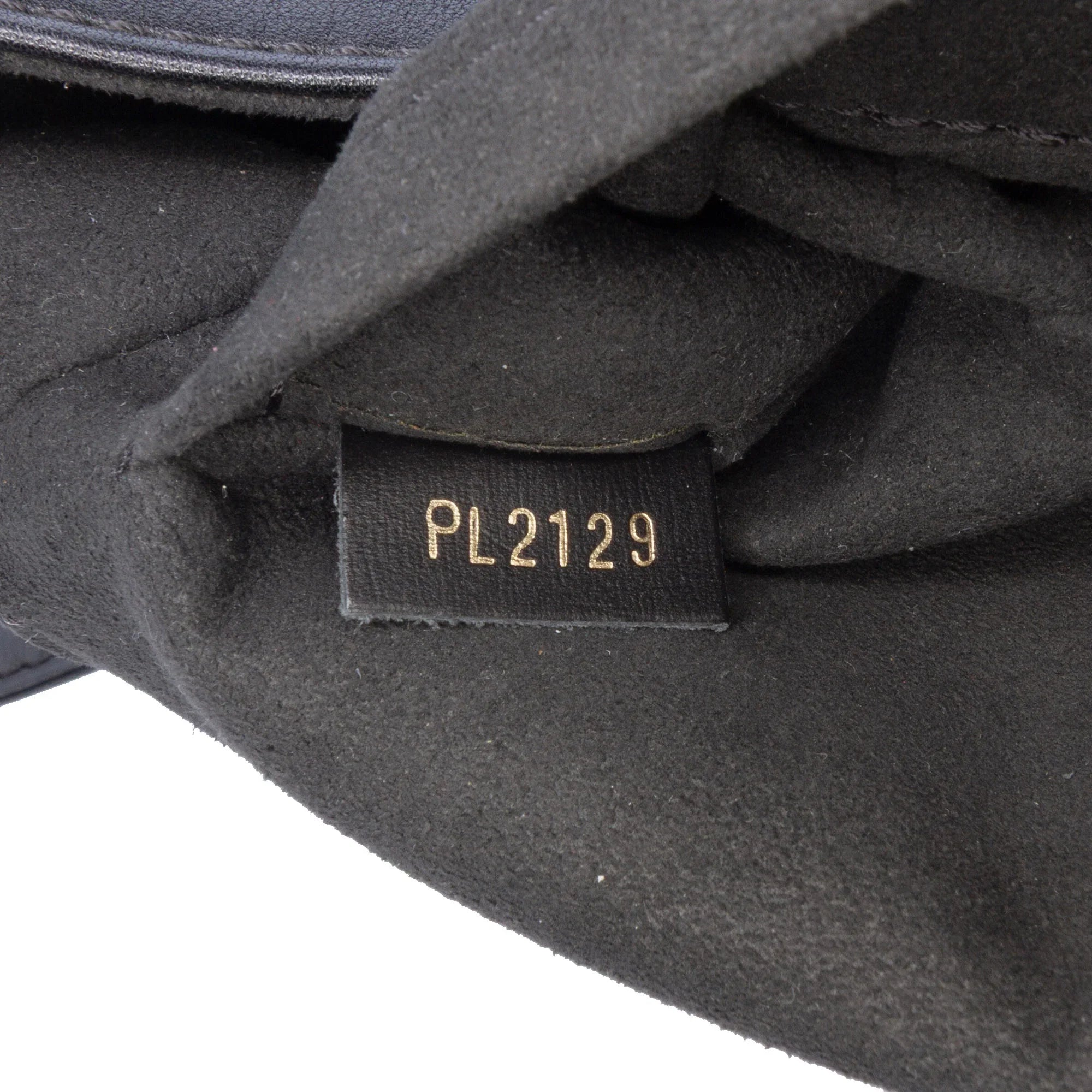 Product Details: Black Louis Vuitton Calfskin Tambourin Crossbody Bag. The Tambourin features a leather body, an adjustable flat leather shoulder strap, a front flap with buckle closure, and an interior slip pocket. 6.7" L x 7.1" W x 3.5" D. Serial number PL2129.