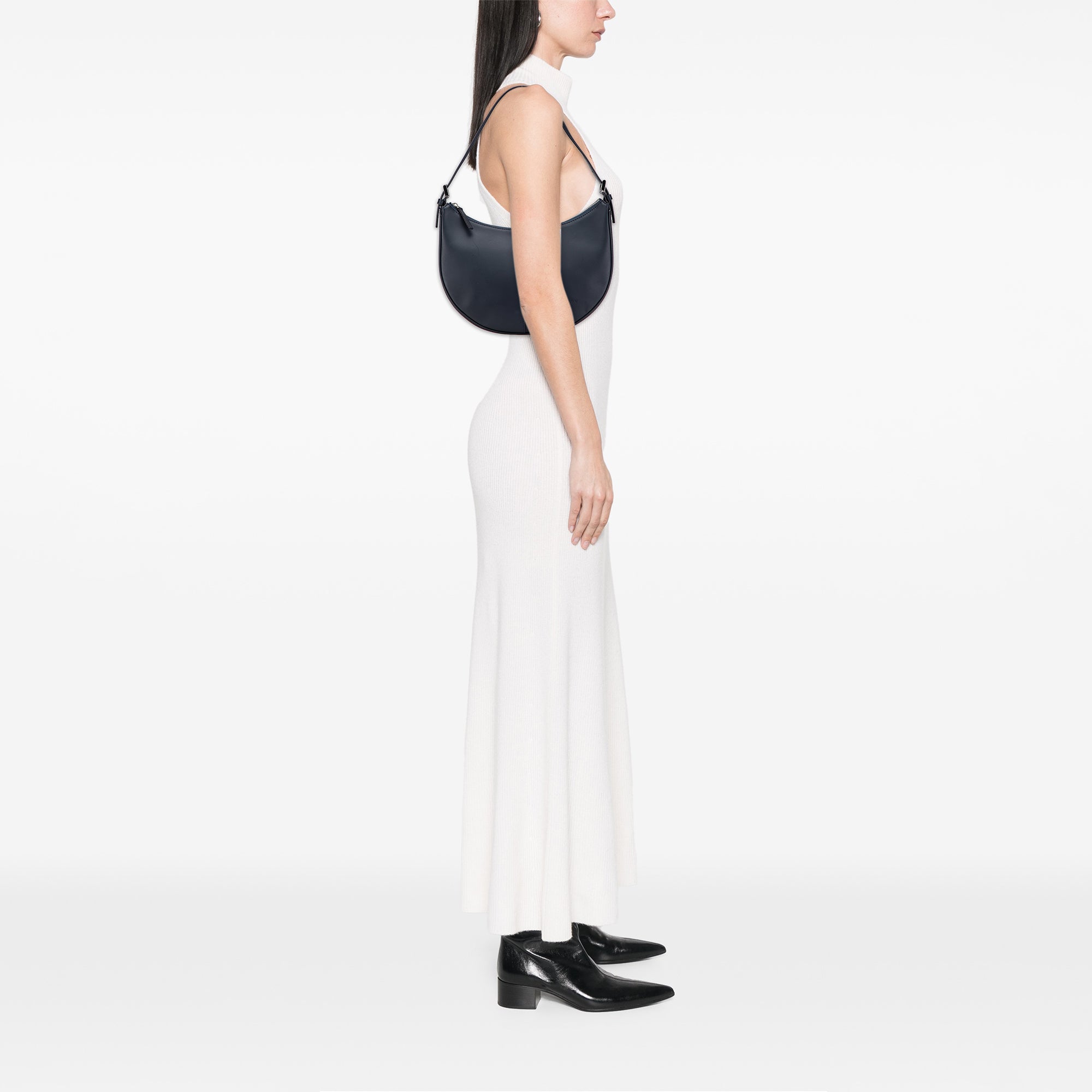 Product Details: Blue Burberry Leather Hobo Shoulder Bag. This hobo bag features a leather body, a flat leather strap, a top zip closure, and interior zip and slip pockets. 7.5" L x 10.6" W x 2.8" D.