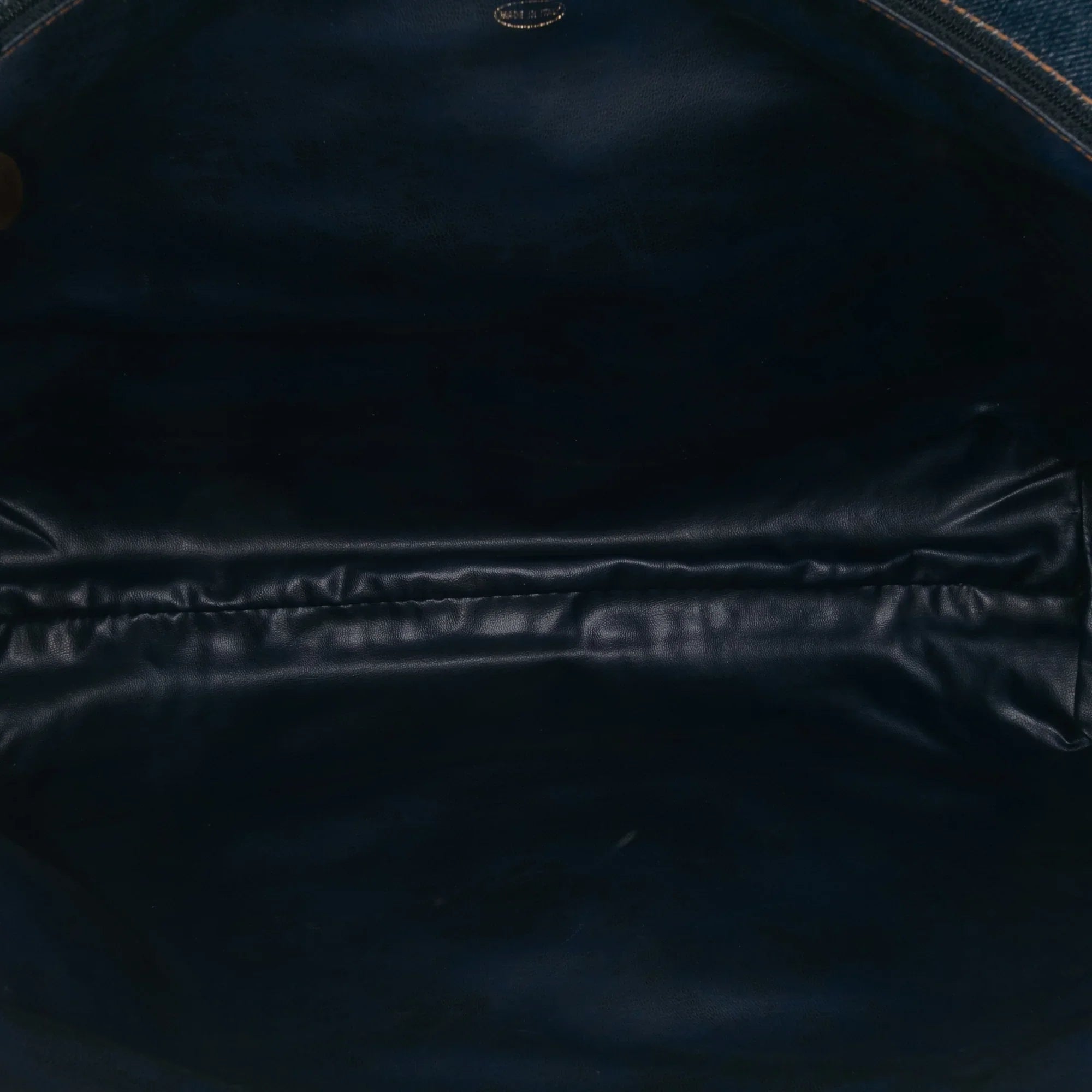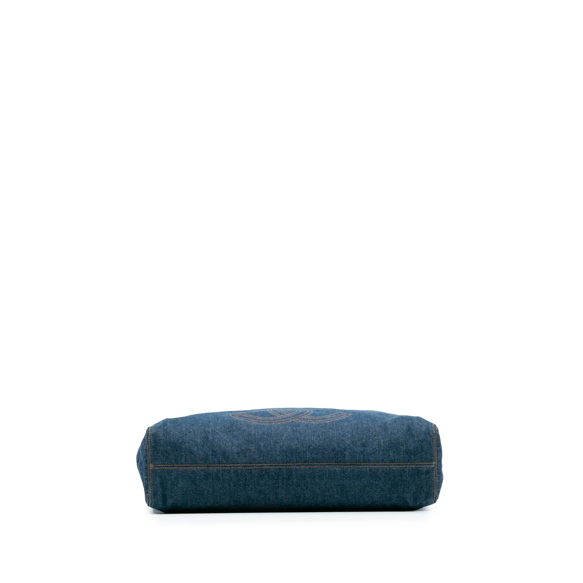 Product Details: Blue Chanel CC Denim Chain Tote. This tote bag features a denim body, denim-woven chain straps with denim guard, an open top, and interior zip pockets. 13.6" L x 17.3" W x 4.3" D. Serial number 4680500.