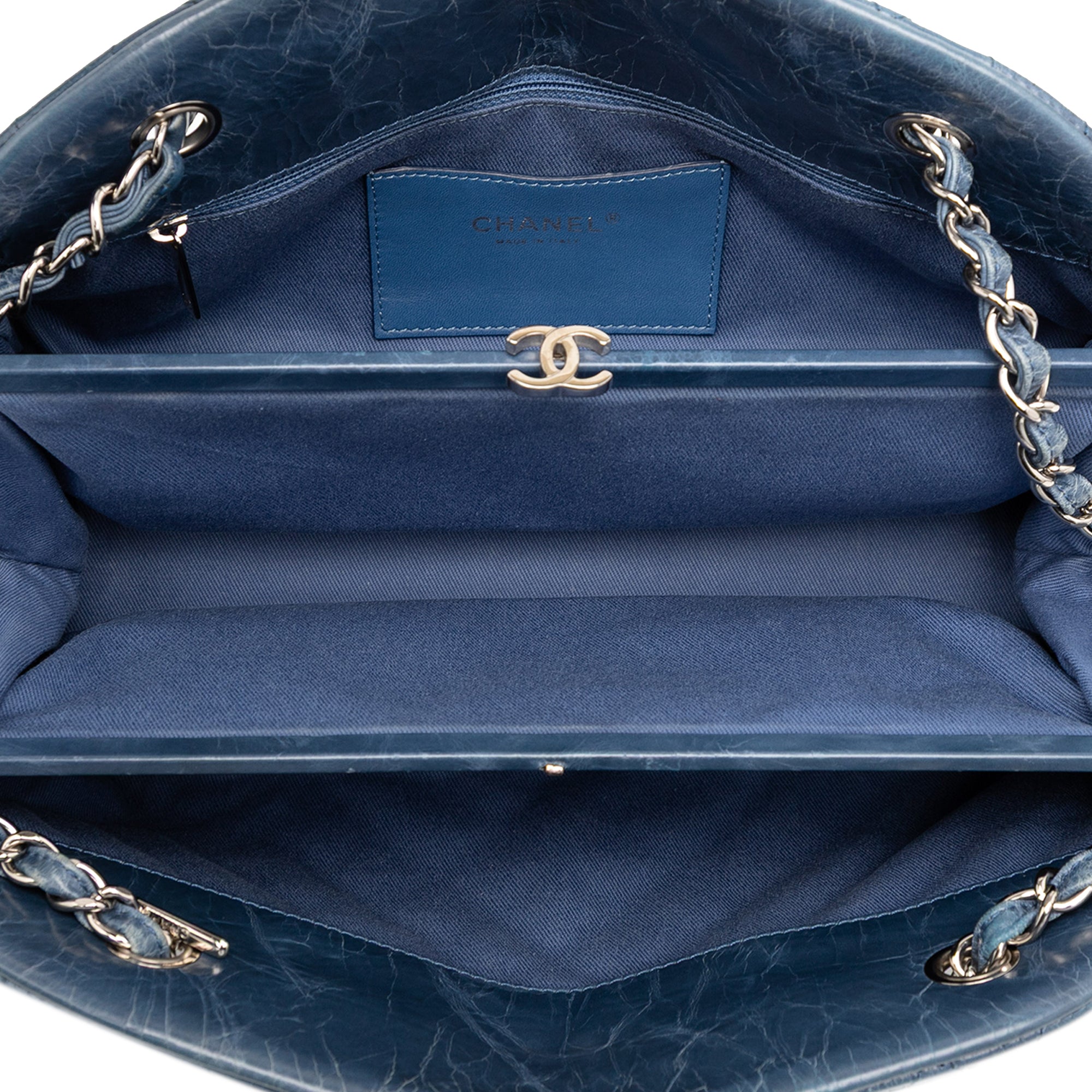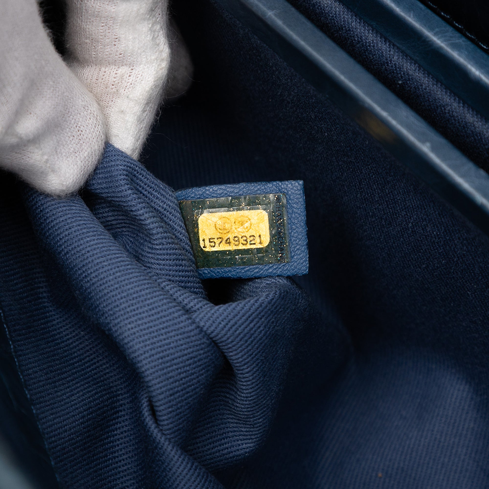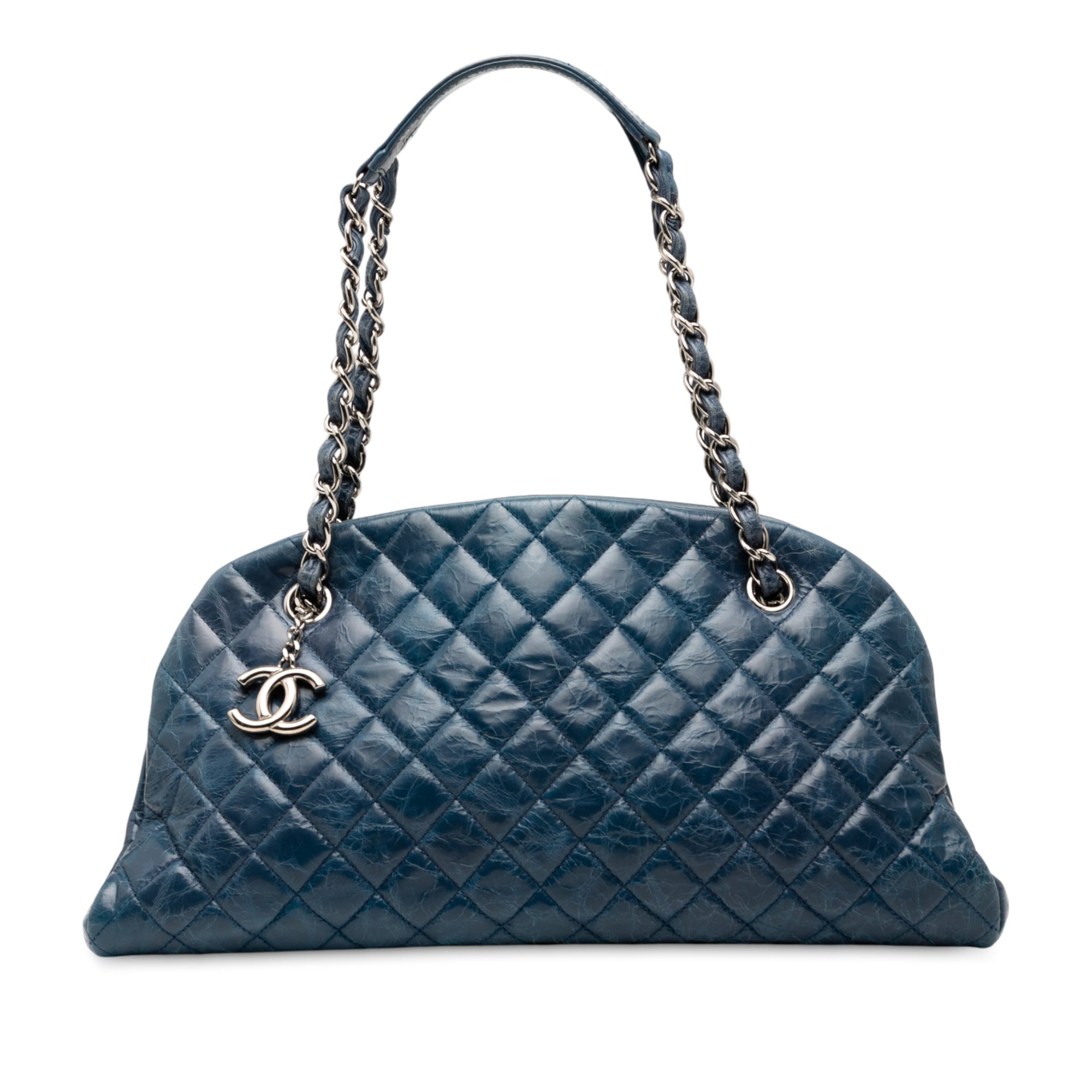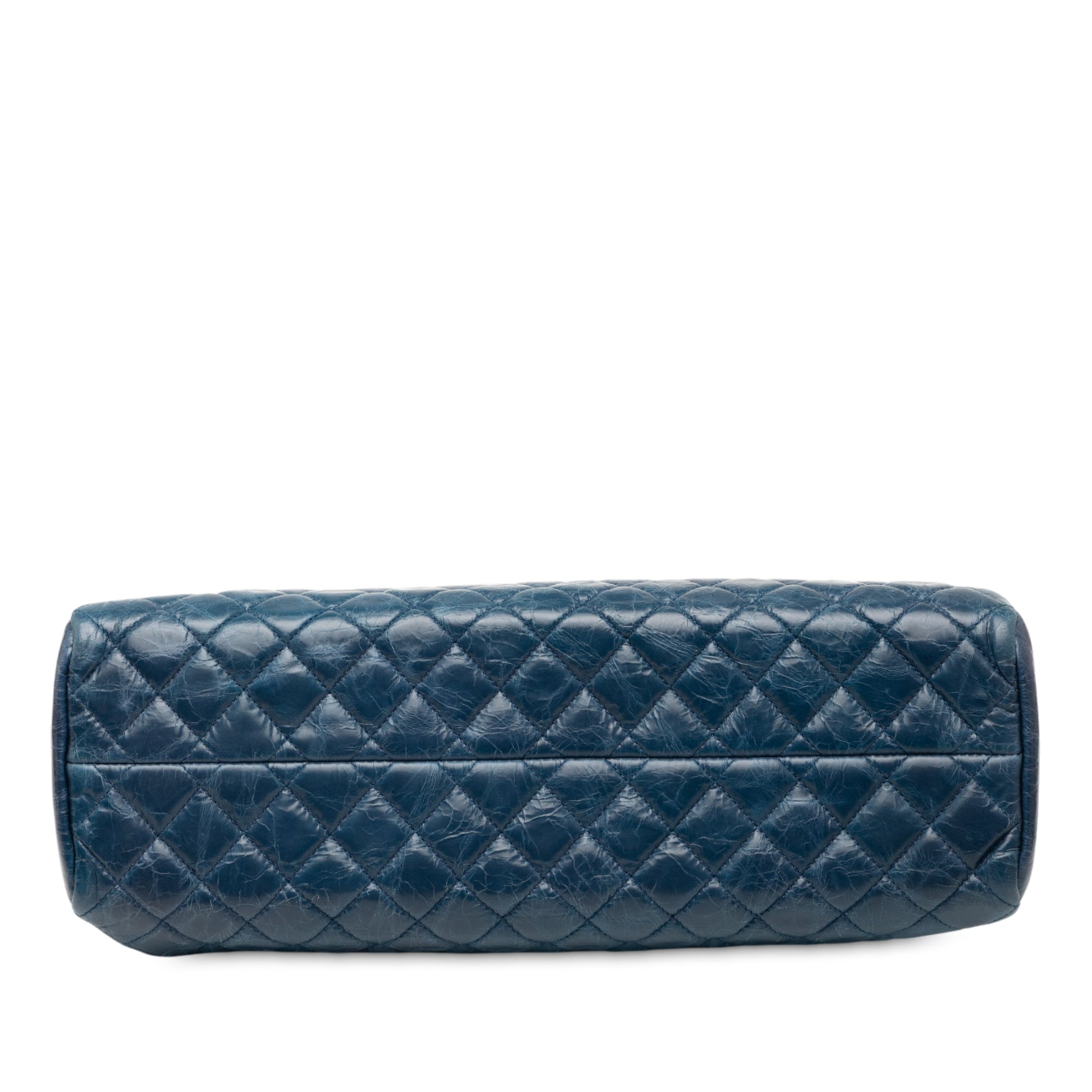 Product Details: Blue Chanel Medium Aged Calfskin Just Mademoiselle Bowling Bag. This shoulder bag features a quilted aged calfskin body, leather woven chain link straps with leather shoulder guards, an open top, an interior compartment with kiss lock closure, and interior zip and slip pockets. 7.5" L x 14.2" W x 4.7" D. Serial number 15749321.