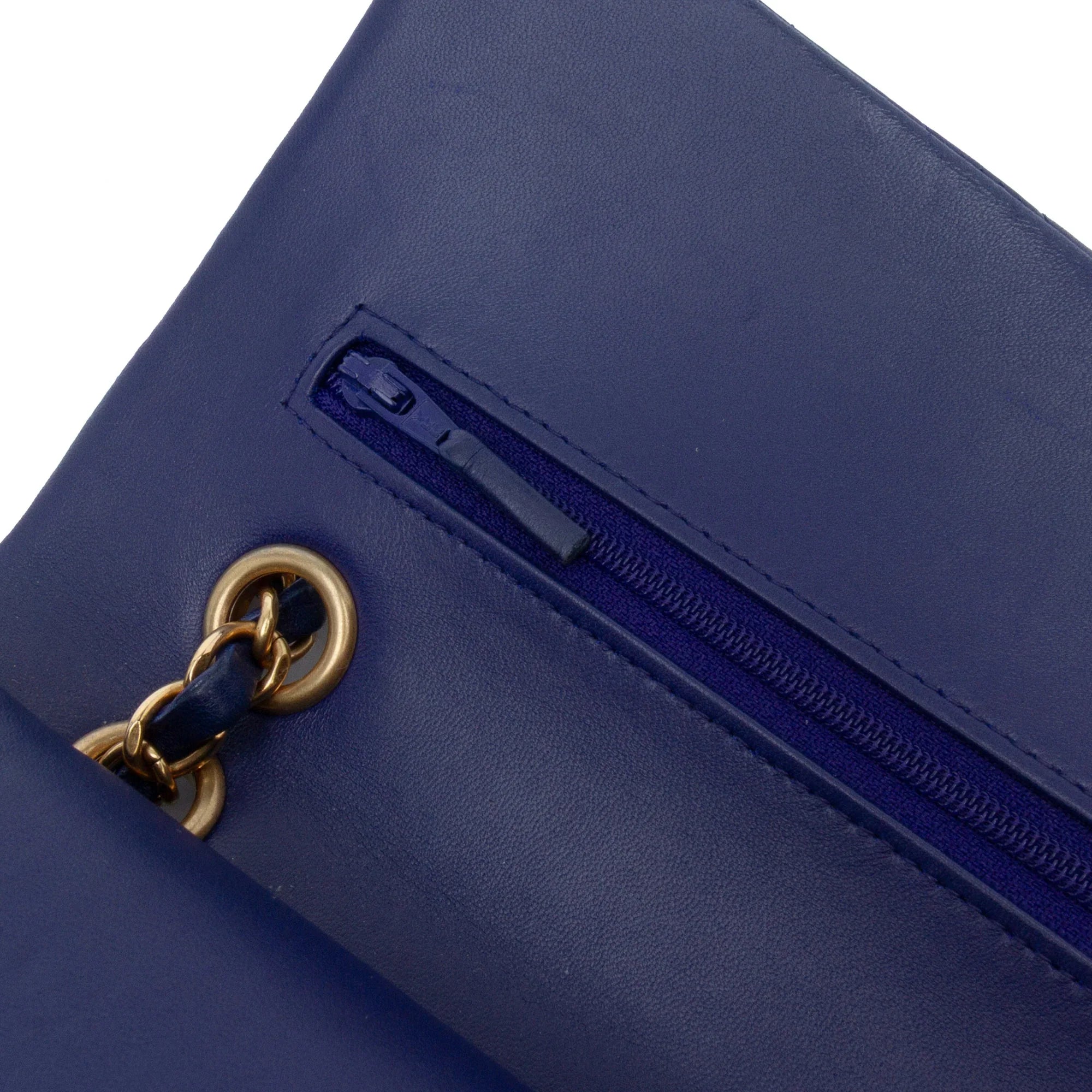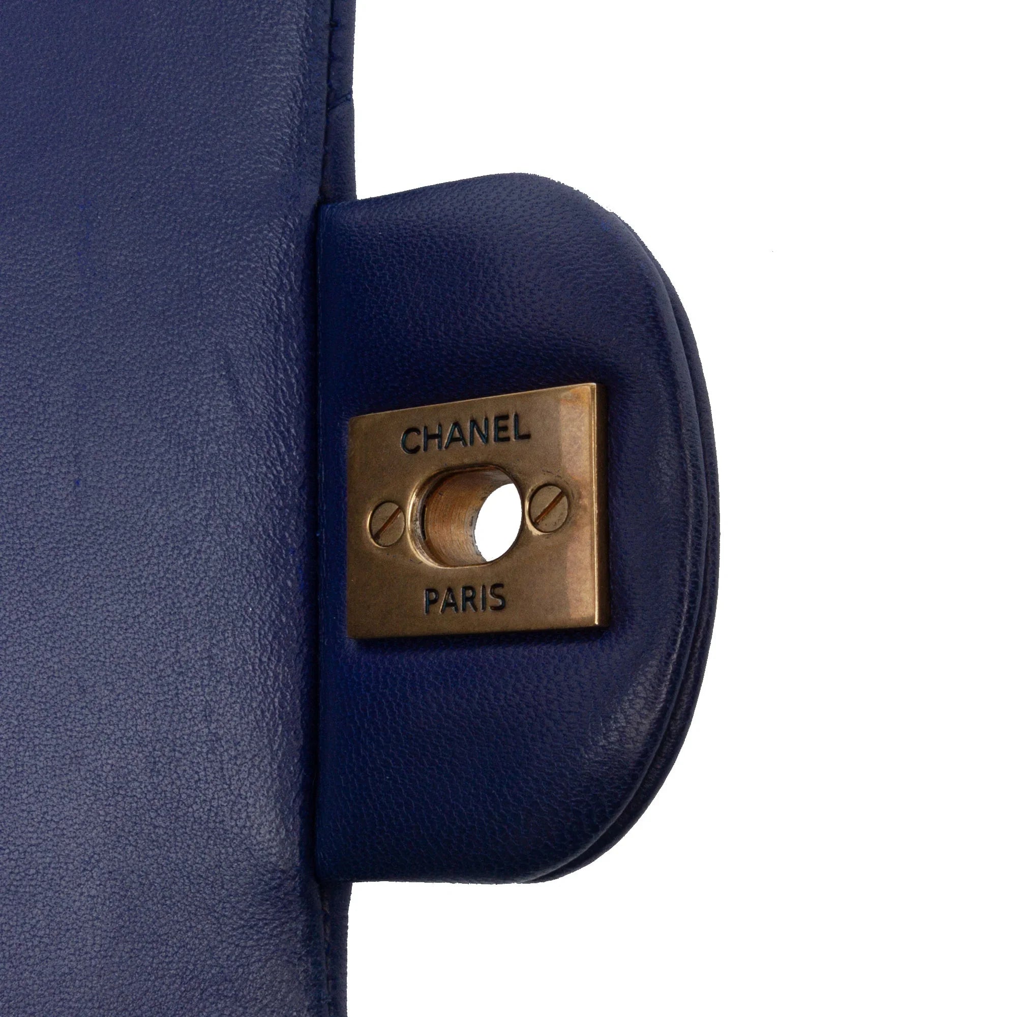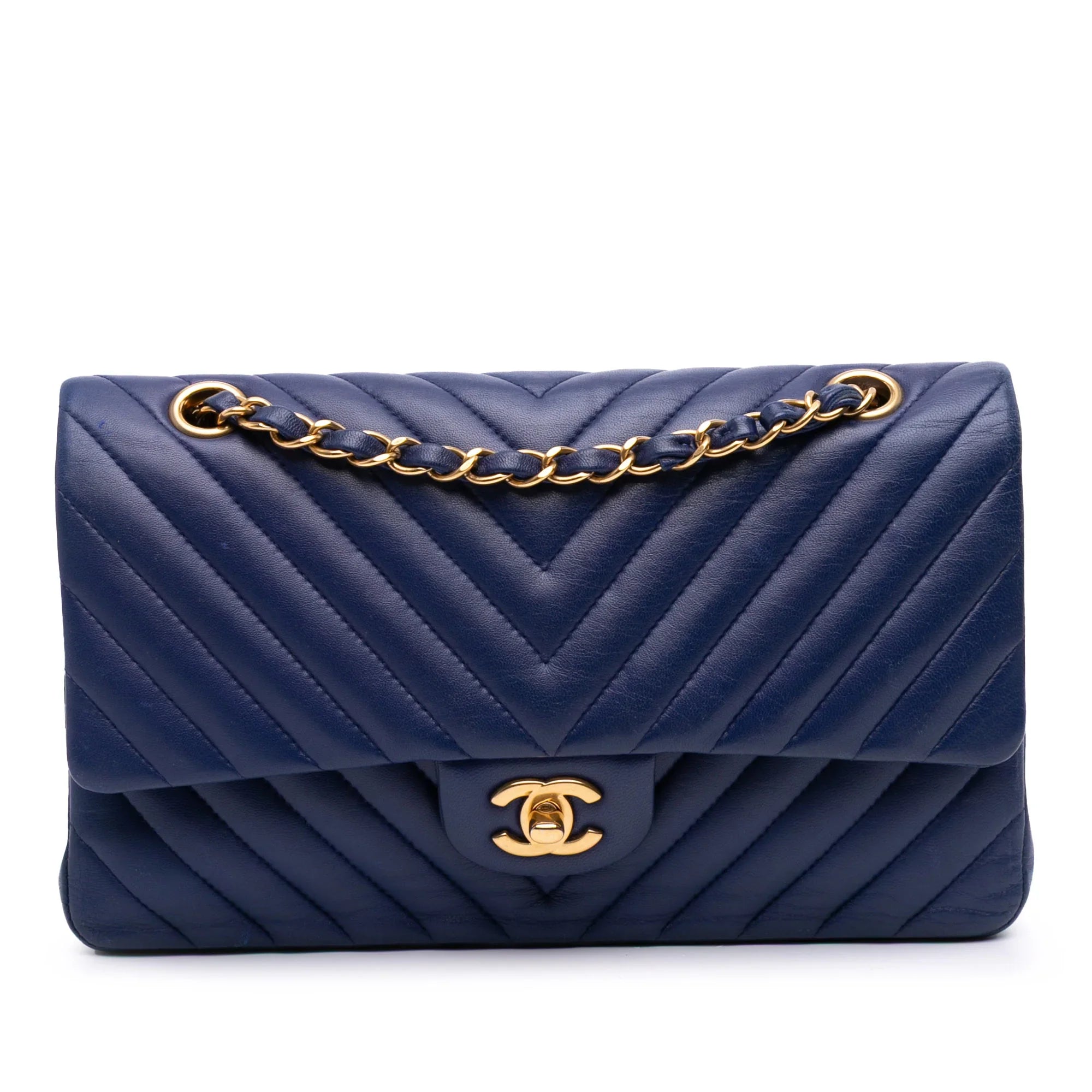 Product Details: Blue Chanel Medium Classic Chevron Lambskin Double Flap Shoulder Bag. This shoulder bag features a quilted lambskin leather body, a leather woven chain shoulder strap, front flaps with interlocking Cs and twist lock closure, an exterior back slip pocket, and interior zip and slip pockets. 6.5" L x 9.8" W x 2.6" D, 7.9" drop. Serial number 21267159.