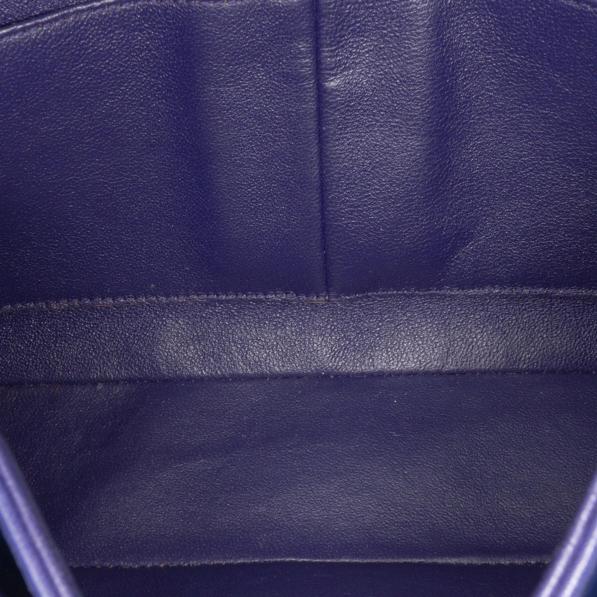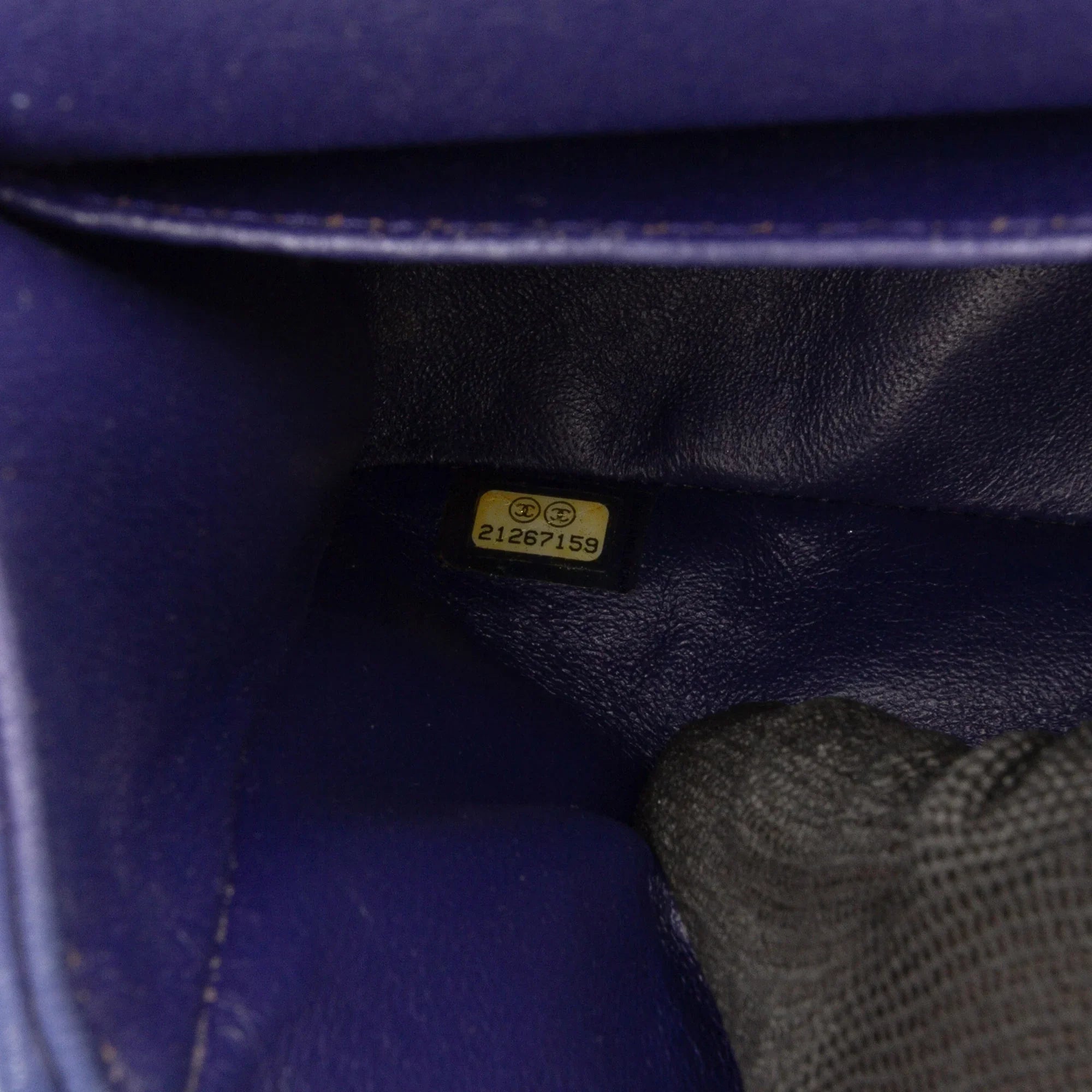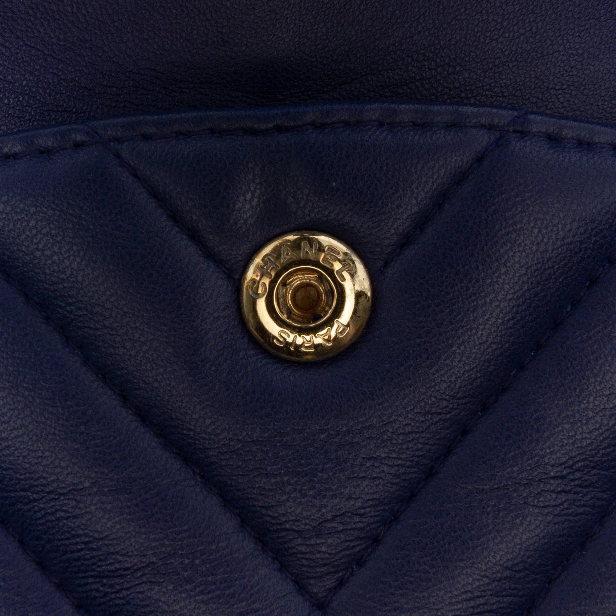 Product Details: Blue Chanel Medium Classic Chevron Lambskin Double Flap Shoulder Bag. This shoulder bag features a quilted lambskin leather body, a leather woven chain shoulder strap, front flaps with interlocking Cs and twist lock closure, an exterior back slip pocket, and interior zip and slip pockets. 6.5" L x 9.8" W x 2.6" D, 7.9" drop. Serial number 21267159.