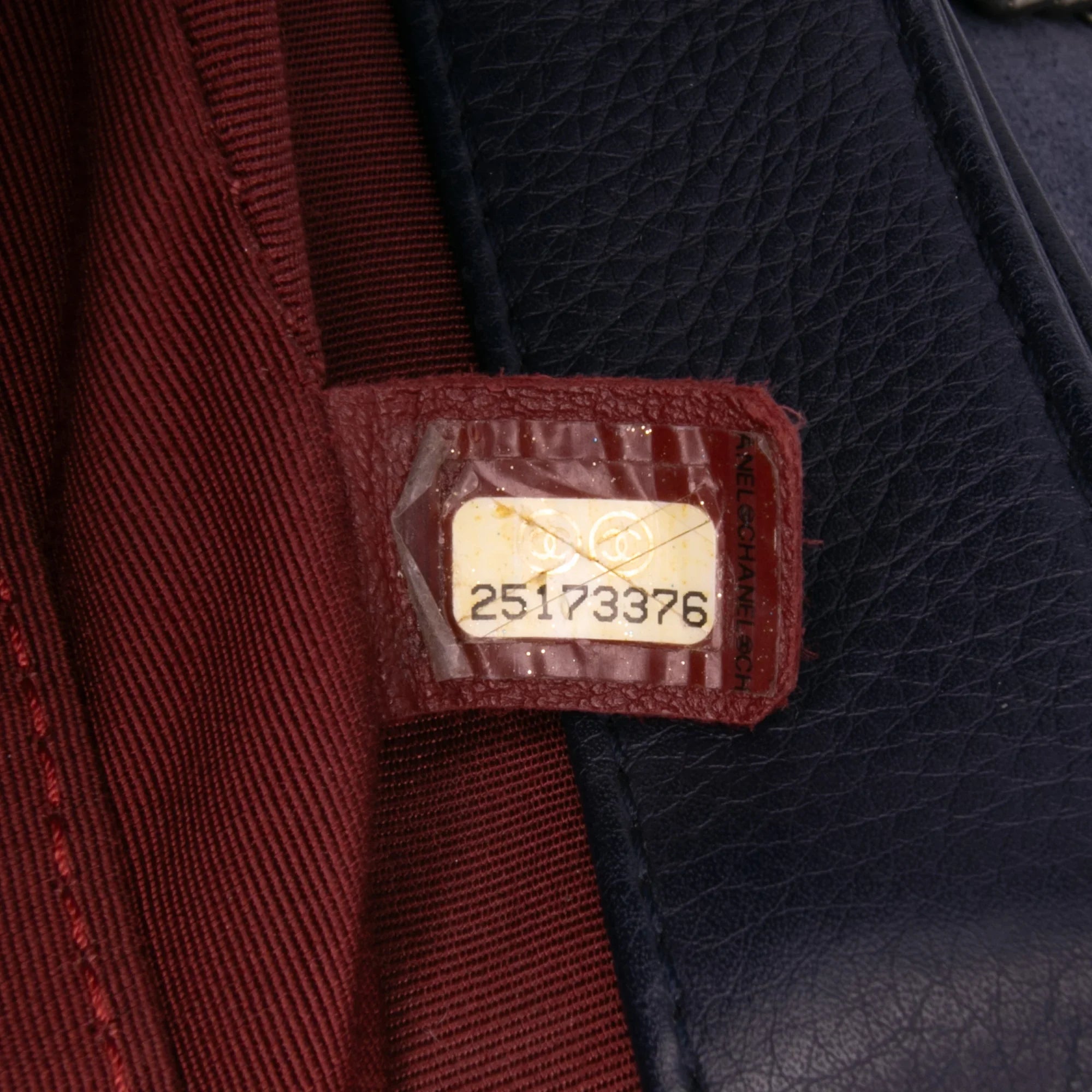 Product Details: Blue Chanel Paris-Greece Calfskin Archi Chic Flap Satchel. This flap bag features a leather body, a chain-link handle, a chain strap with leather shoulder guard, a front flap with CC turn-lock closure, and interior zip and slip pockets. 7.9" L x 10.6" W x 3.5" D, 3.1" drop. Serial number 25173376.