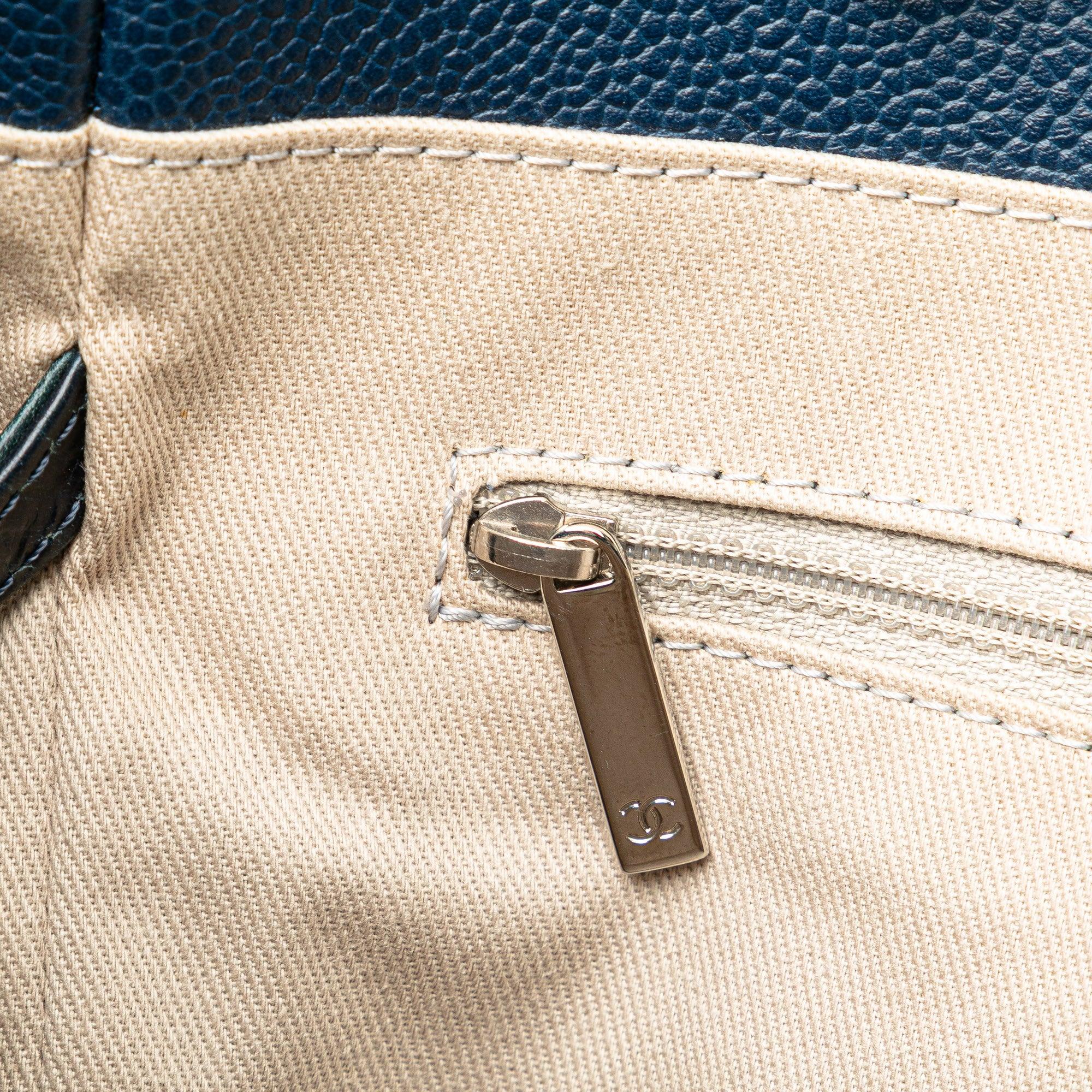Product Details: Blue Chanel Small Glazed Calfskin Deauville Tote. The Deauville features a calfskin leather body with caviar leather trim, leather woven chain handles with leather guards, an open top with a magnetic snap button closure, an exterior back slip pocket, and interior zip and slip pockets. 10.2" L x 13.2" W x 5.5" D, 9.8" drop. Serial number 22203571.