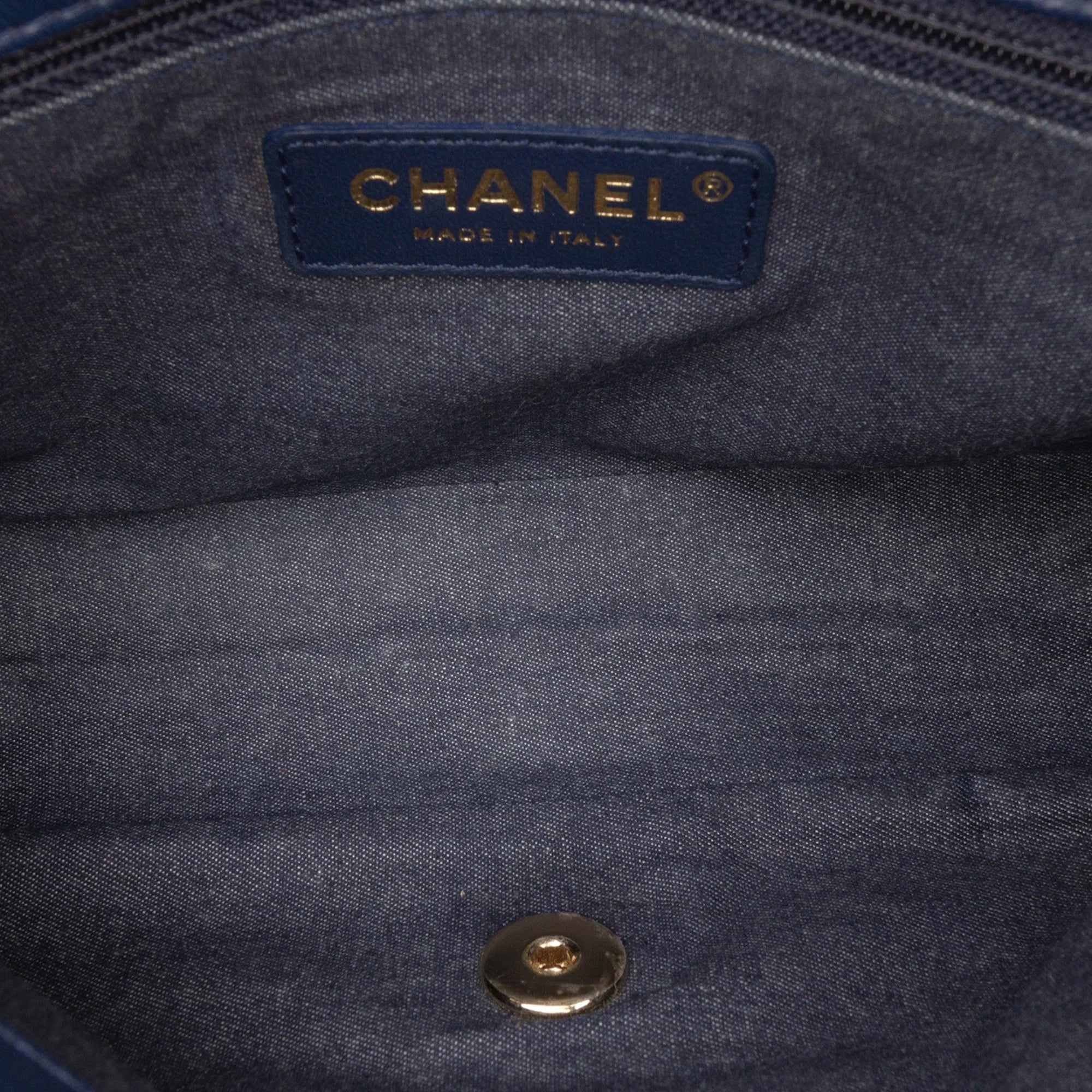 Product Details: Blue Chanel Small Lambskin Elegant Chain Single Flap Satchel. This satchel features a quilted lambskin leather body, a bicolor resin handle, a leather woven chain strap with leather guard, a single front flap with CC turn-lock closure, an exterior back slip pocket, and an interior zip pocket. 5.9" L x 8.9" W x 2.2" D, 3.1" drop. Serial number 29493749.