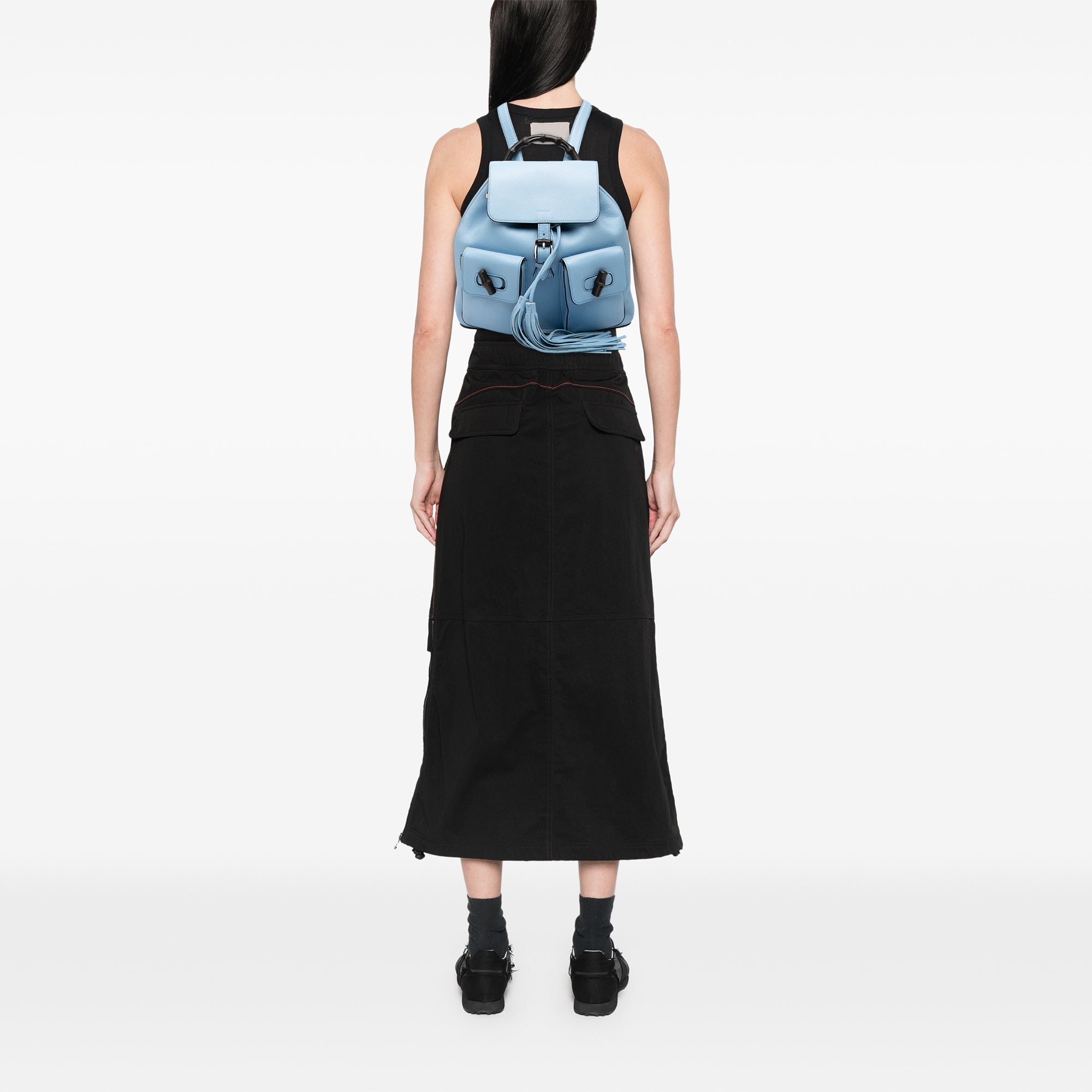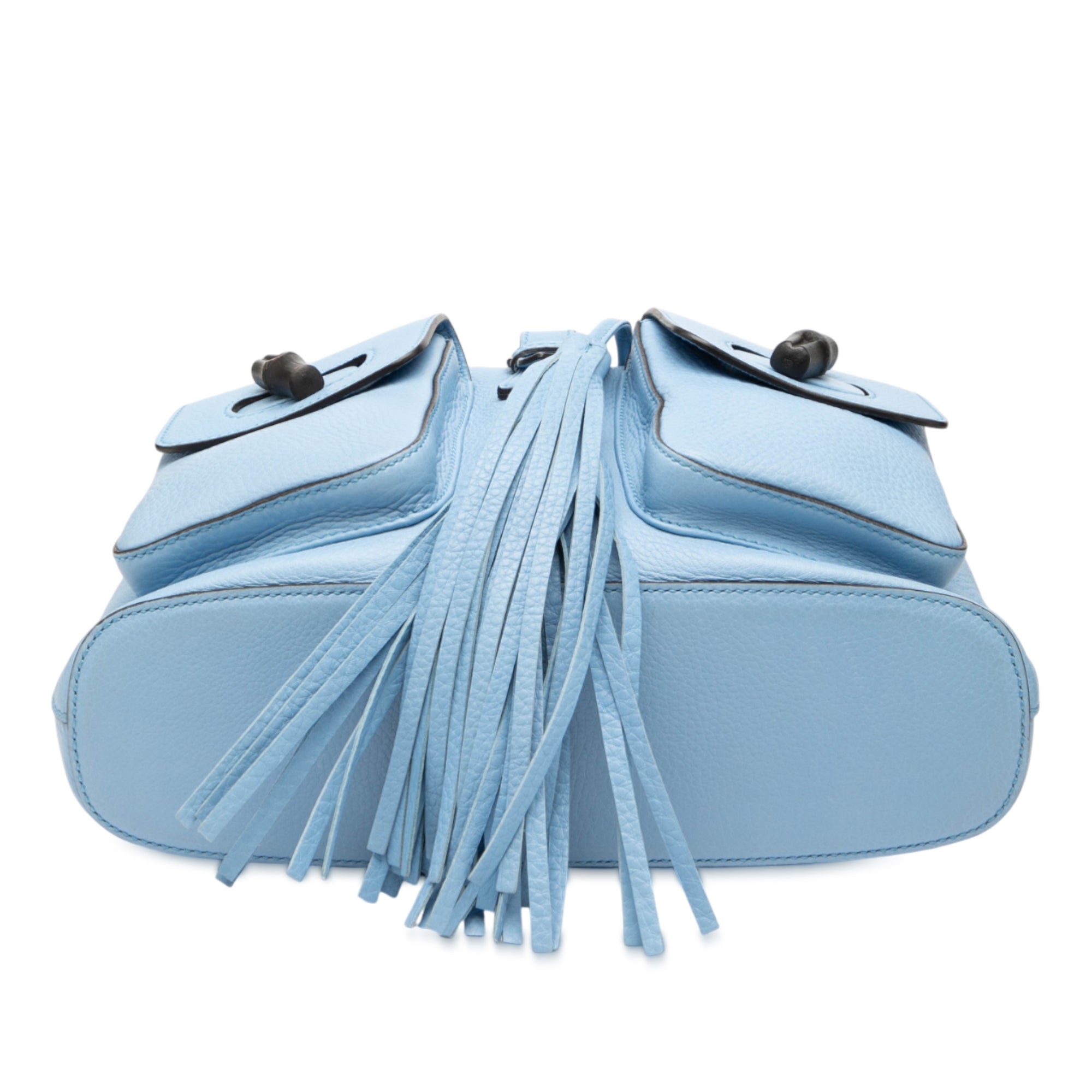 Product Details: Blue Gucci Leather Bamboo Tassel Backpack. This backpack features a leather body, a bamboo top handle, adjustable flat leather back straps, a front flap with buckle closure, a top drawstring closure with leather tassel pulls, exterior flap pockets with bamboo turn-lock closures, and interior slip pockets. 11.8" L x 11.8" W x 3.7" D. Serial number 370833 467891.