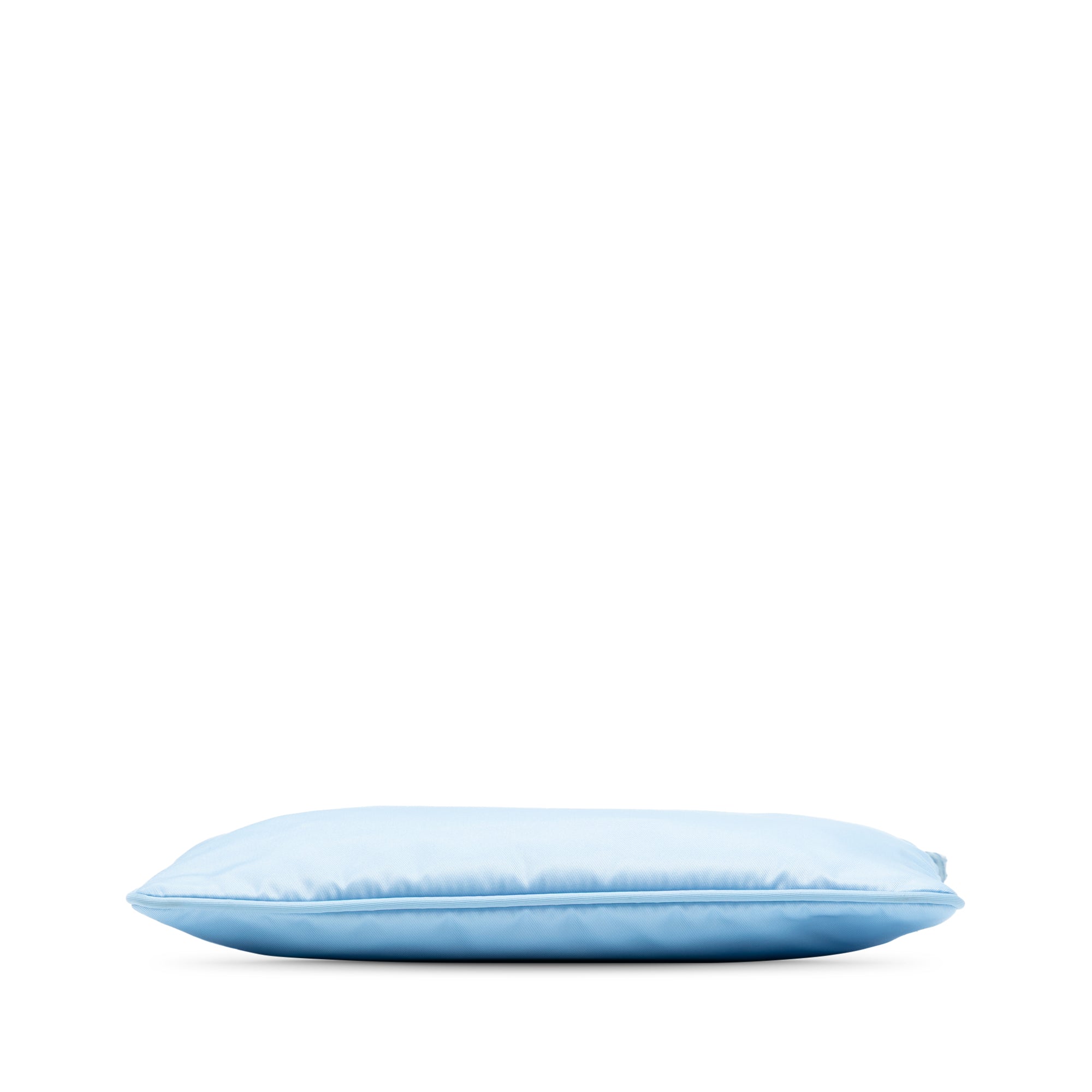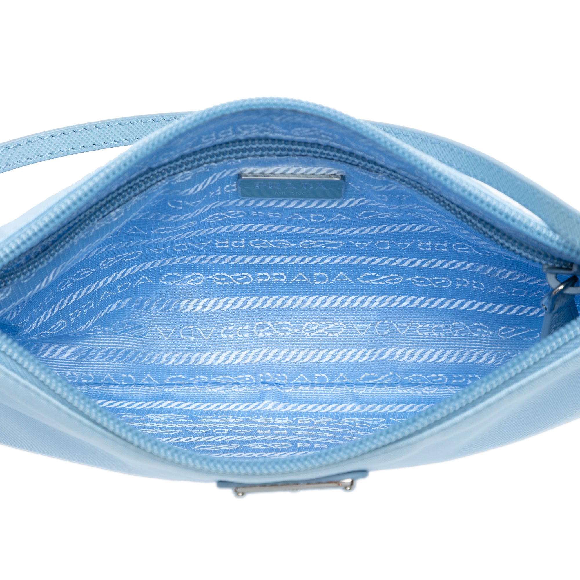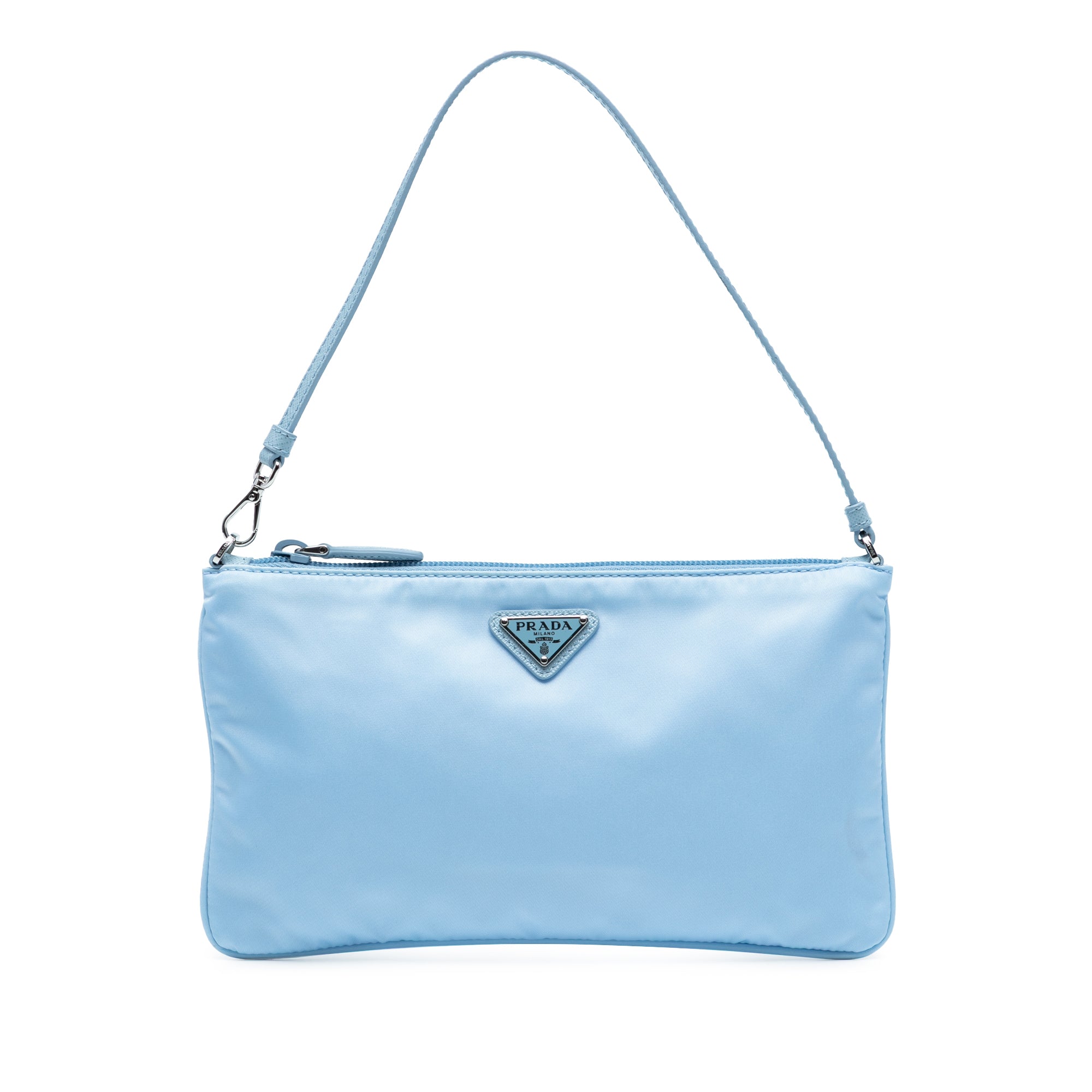 Product Details: Blue Prada Re Nylon Pochette Shoulder Bag. This shoulder bag features a nylon body, a flat saffiano leather strap, a top zip closure, and an interior zip pocket. 5.7" L x 9.4" W x 0.2" D, 6.9" drop.