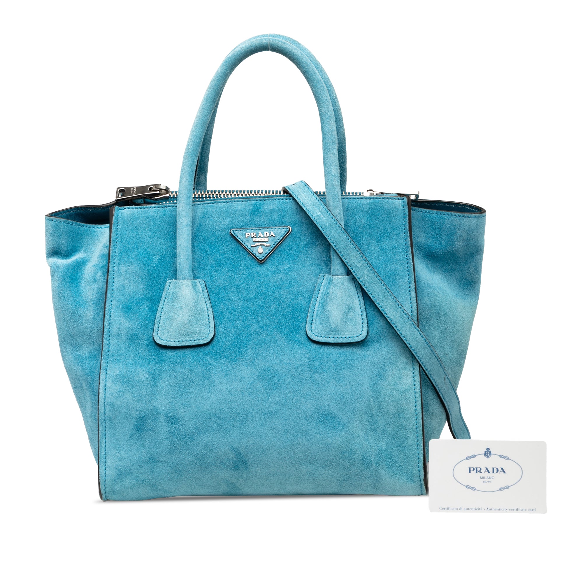 Product Details: Blue Prada Small Scamosciato Twin Pocket Satchel. The Twin Pocket satchel features a suede body, rolled handles, a detachable flat leather strap, an open top with a magnetic closure, top zip compartments, and interior zip and slip pockets. 8.9" L x 9.4" W x 5.5" D, 4.7" drop.