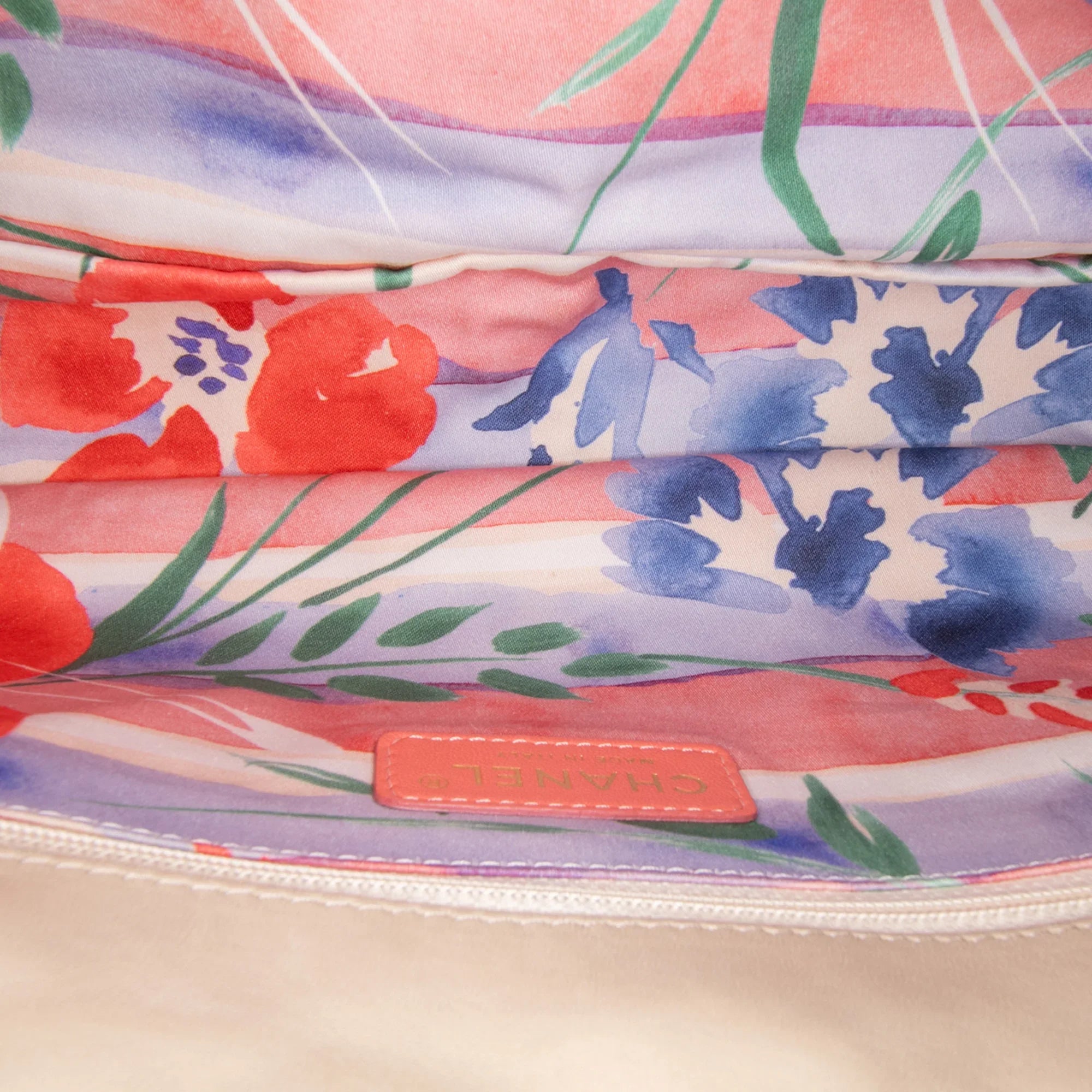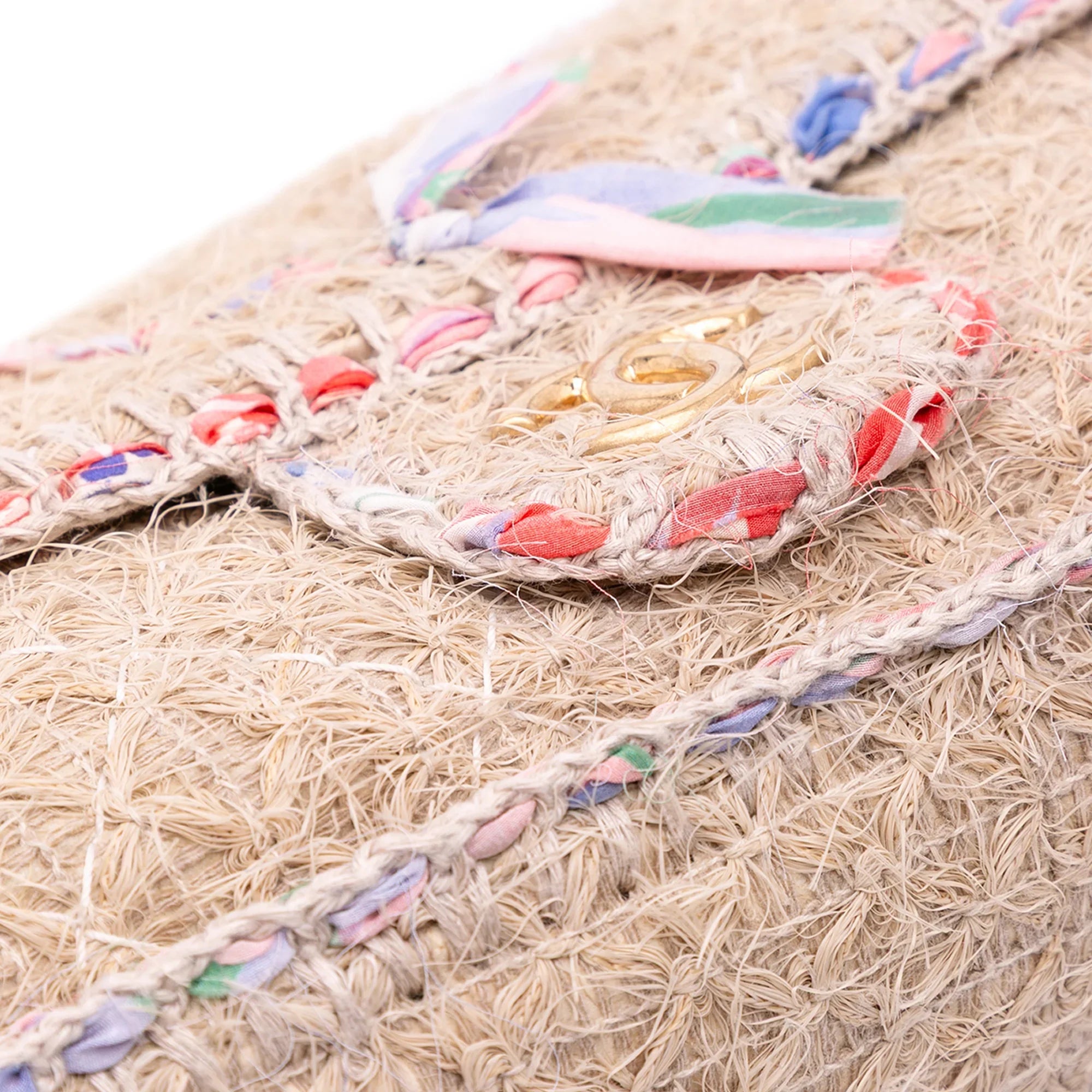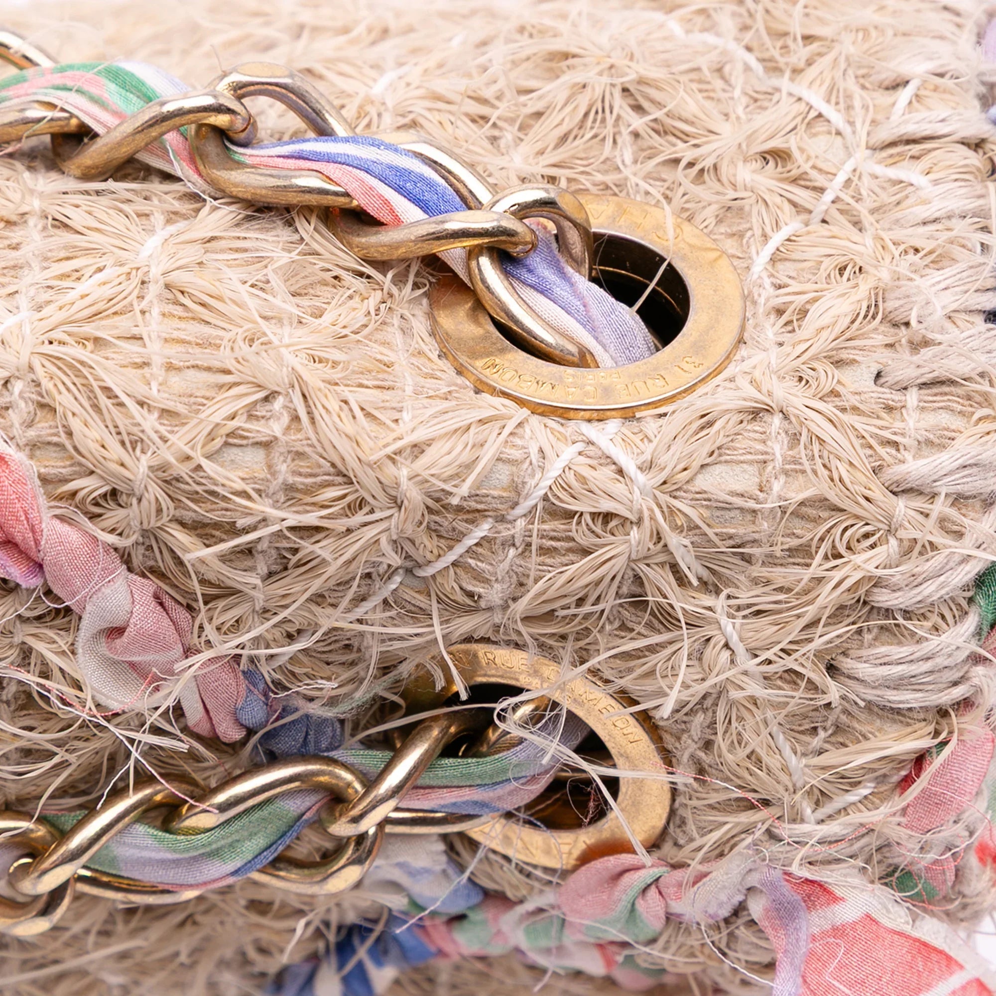 Product Details: Brown Chanel CC Straw Country Flap Shoulder Bag. This crossbody features a straw body with multicolor ribbon details, a fabric-woven chain strap, a flap with magnetic button closure, and an interior zip pocket. 7.5" L x 12.2" W x 3.7" D. Serial number 13565806.