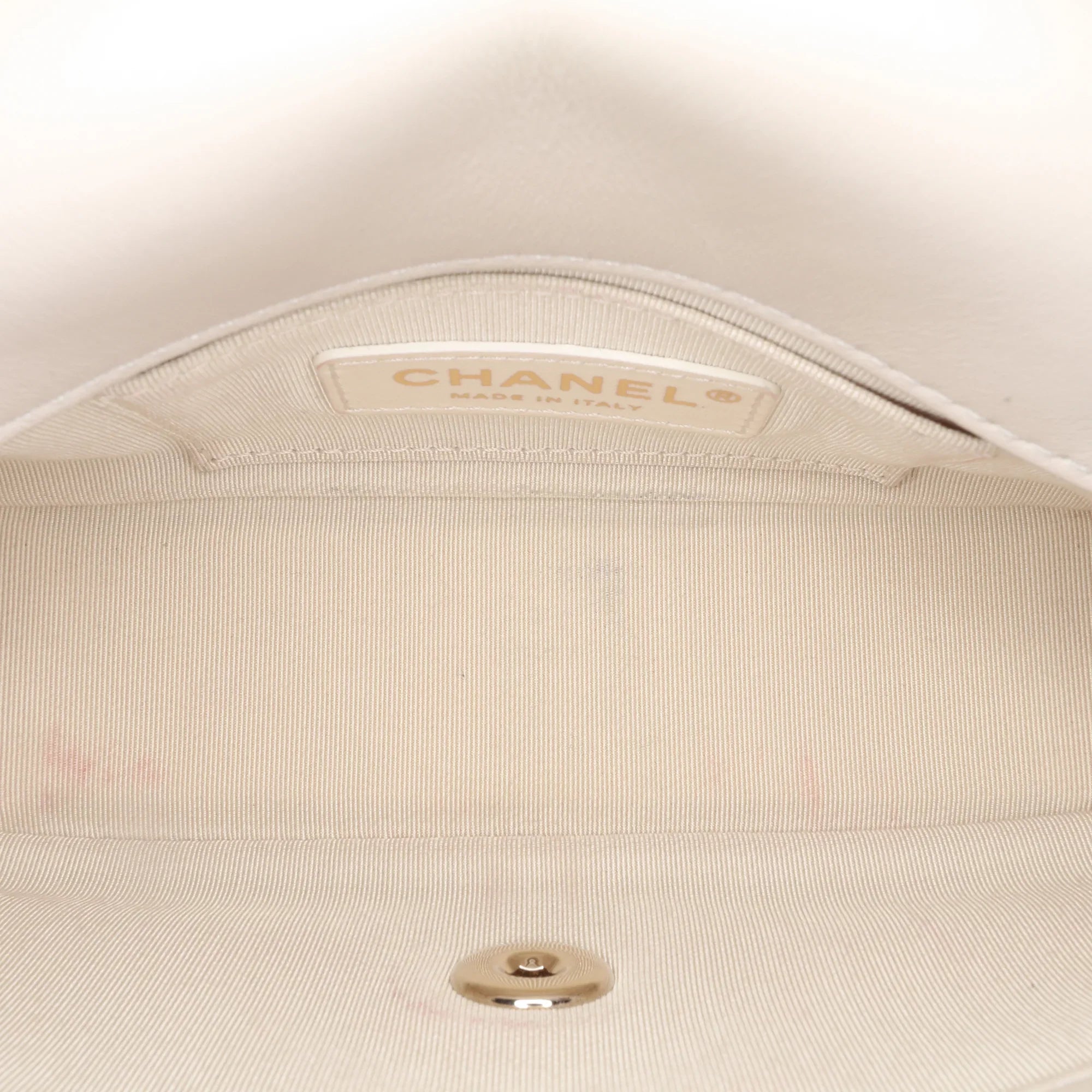 Product Details: Brown Chanel Medium Lambskin Twist Chain Enamel CC Flap Crossbody Bag. This crossbody bag features a quilted leather body, a leather woven chain shoulder strap with leather guard, a front flap with CC turn-lock closure, and an interior zip pocket. 4.9" L x 7.5" W x 2.4" D. Serial number 30863594.
