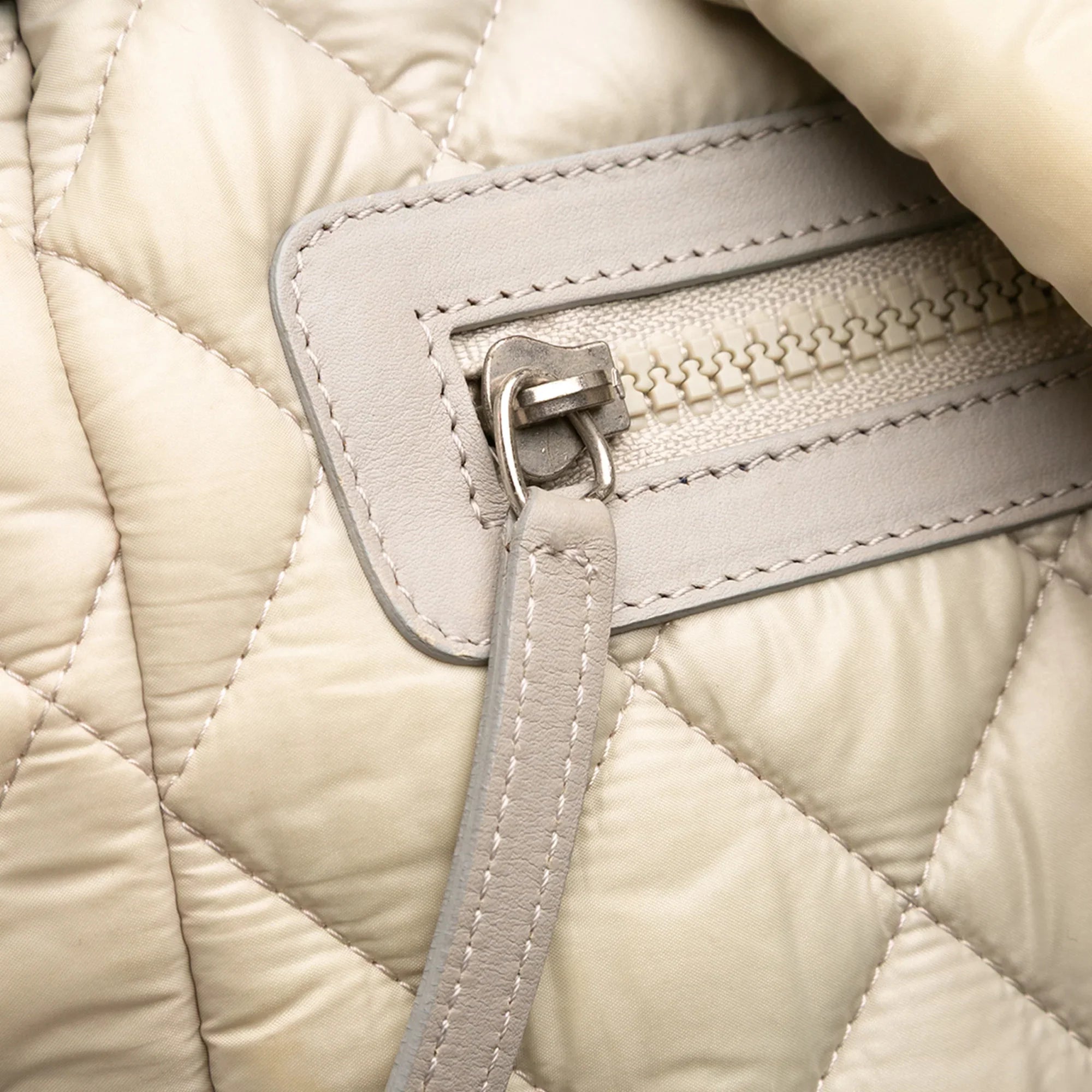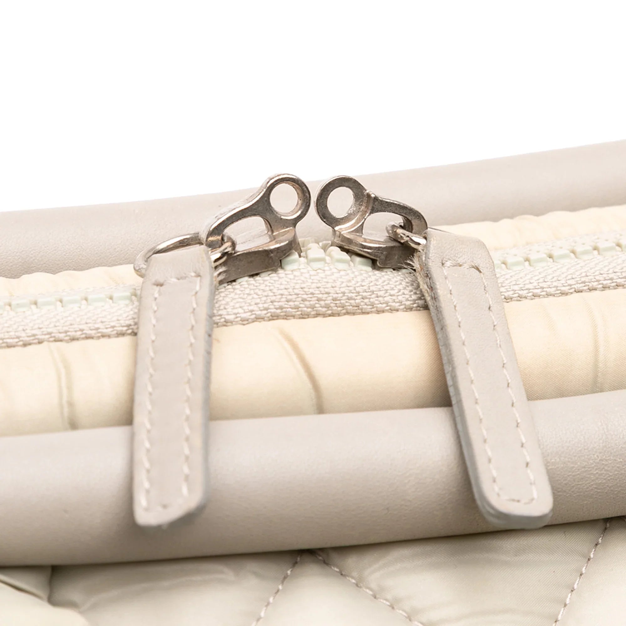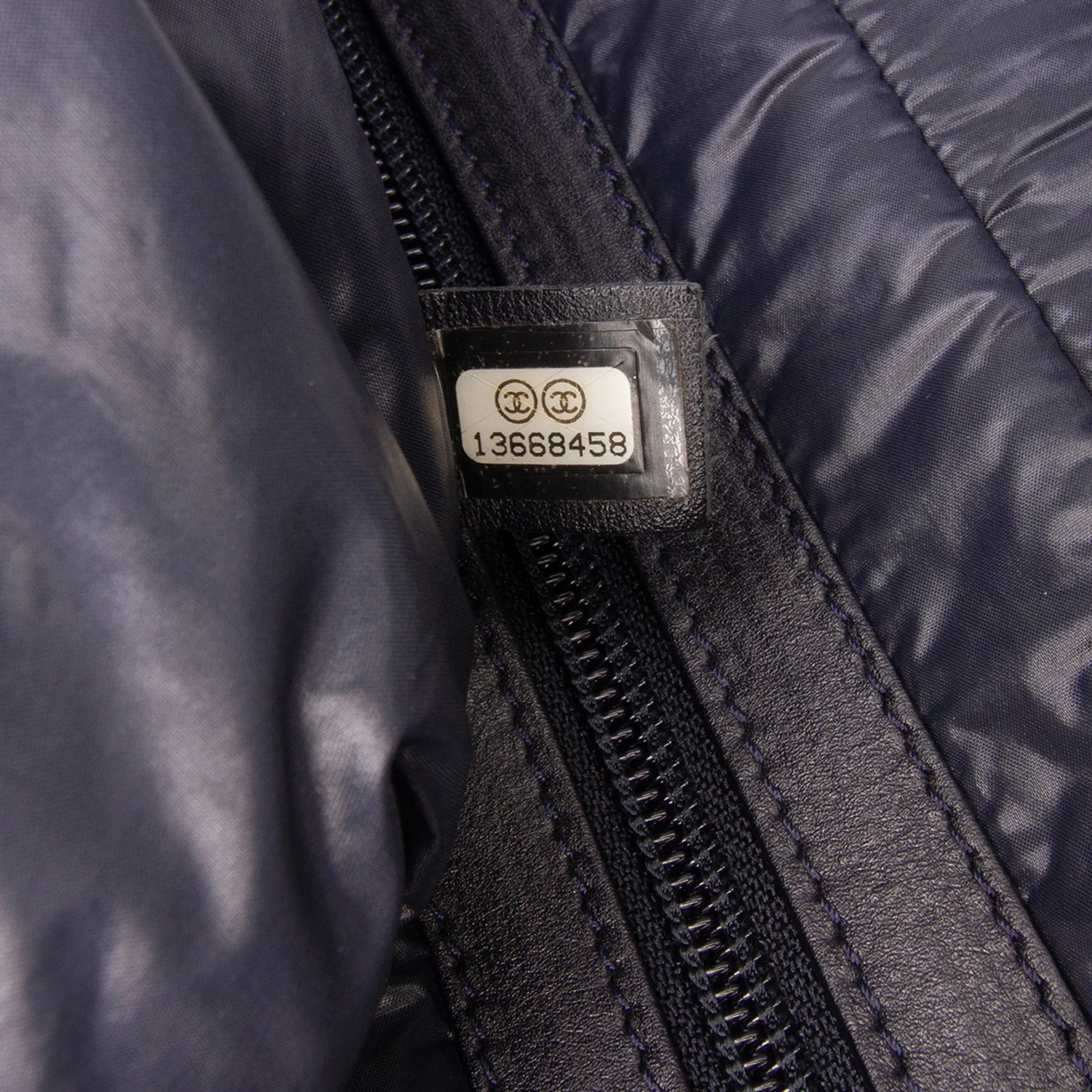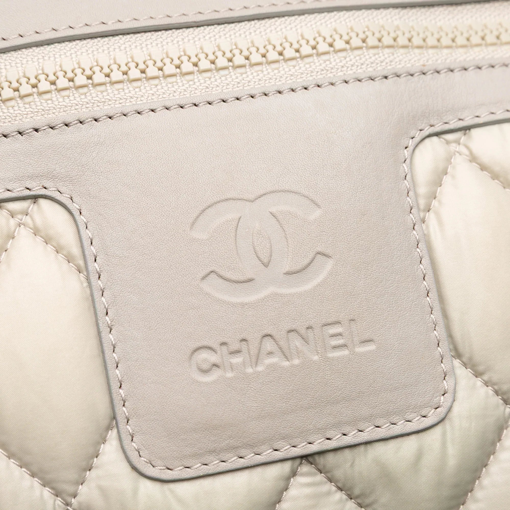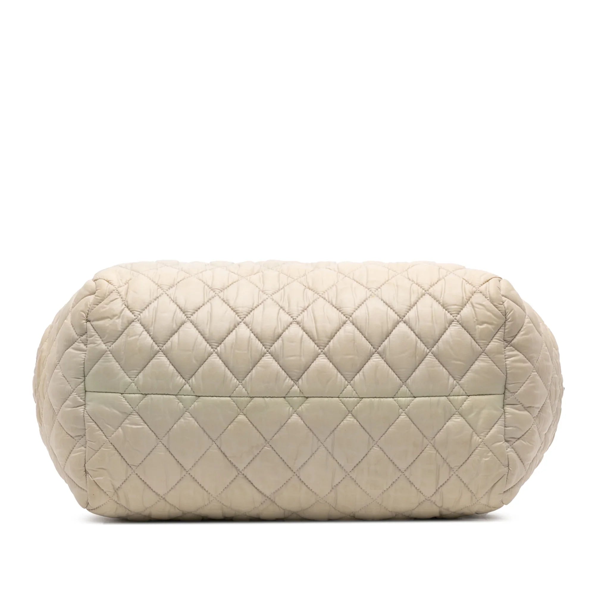 Product Details: Brown Chanel Medium Nylon Coco Cocoon Bowling Bag. This tote bag features a quilted nylon body, rolled nylon handles, a top zip closure, an exterior front zip pocket, and an interior zip pocket. 11.4" L x 12.6" W x 7.7" D, 5.5" drop. Serial number 13668458.