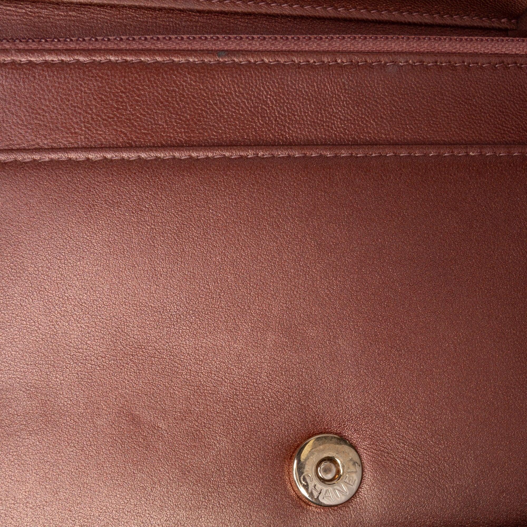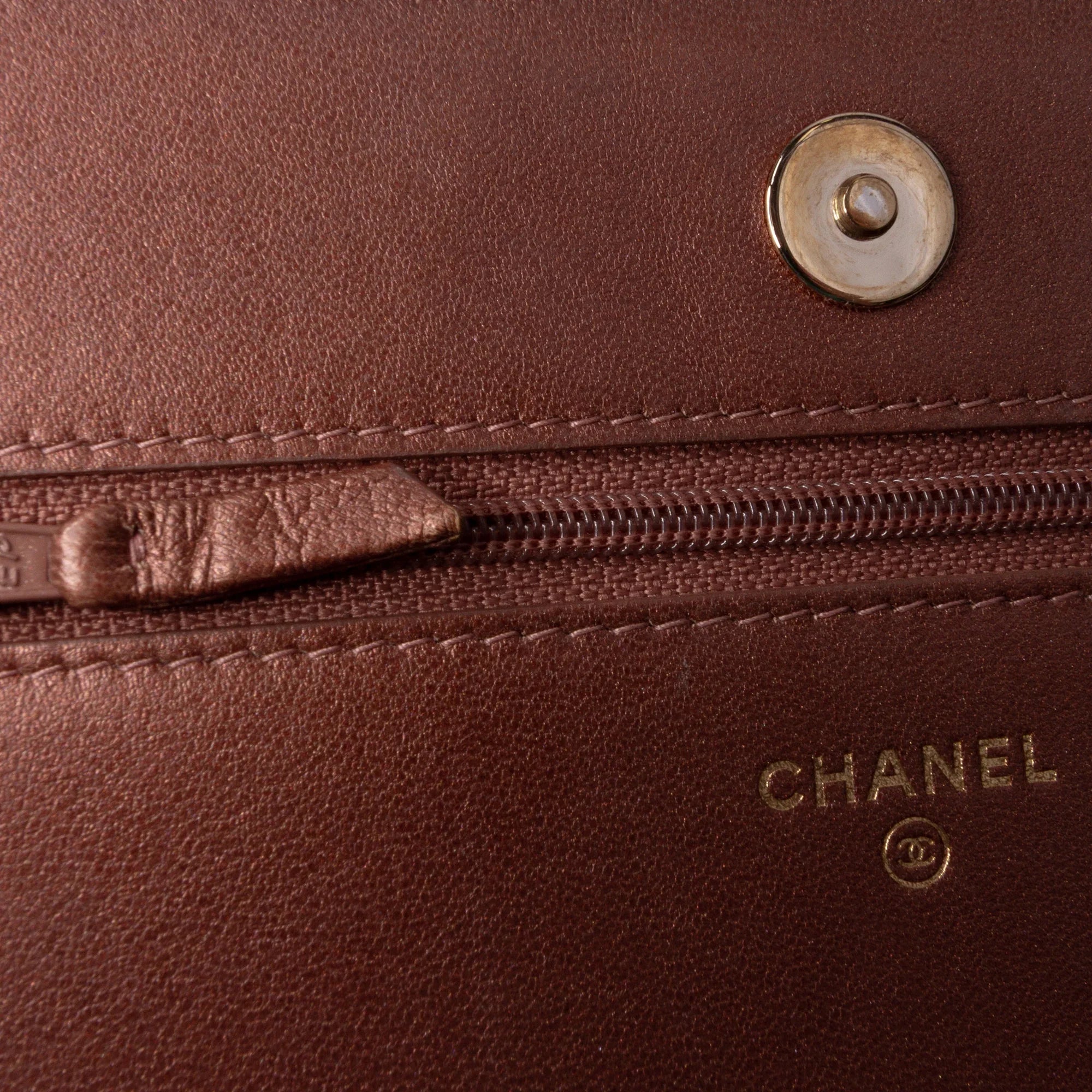 Product Details: Brown Chanel Quilted Metallic Lambskin Enamel CC Wallet On Chain Crossbody Bag. This wallet on chain features a quilted lambskin leather body, a leather woven chain shoulder strap, a front flap with enamel CC and magnetic closure, and interior zip and slip compartments. 5.1" L x 7.5" W x 1.2" D. Serial number 24601113.