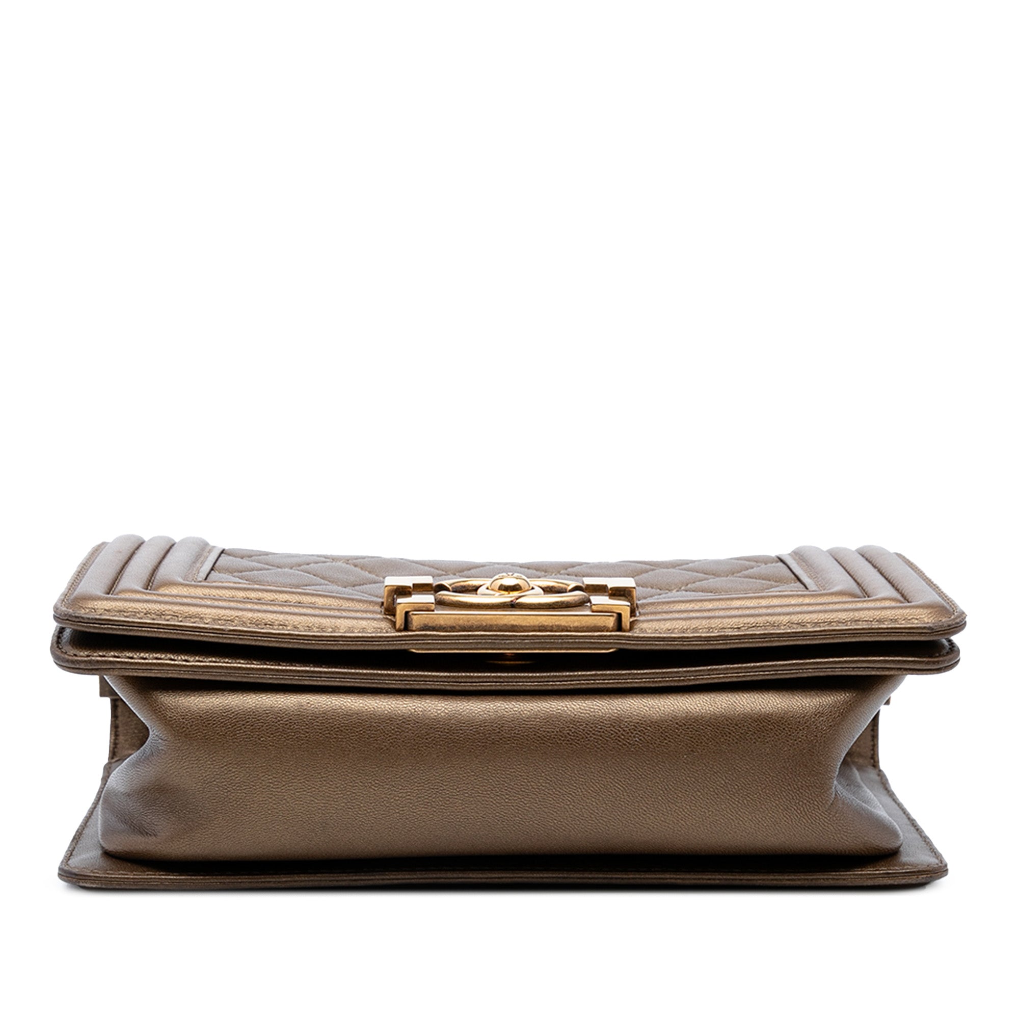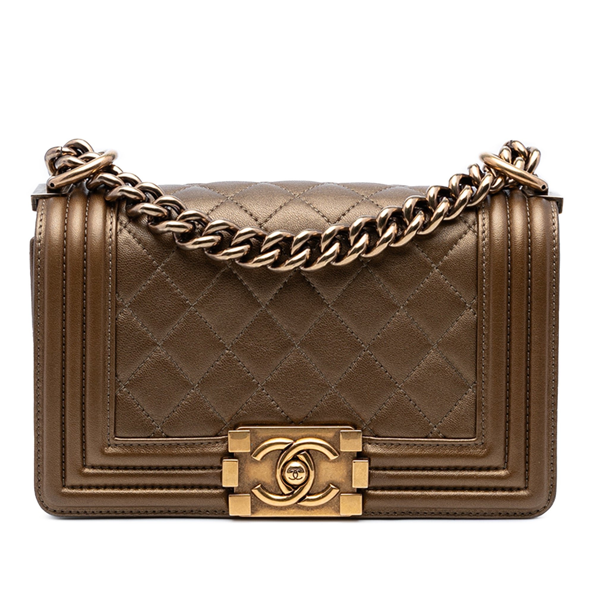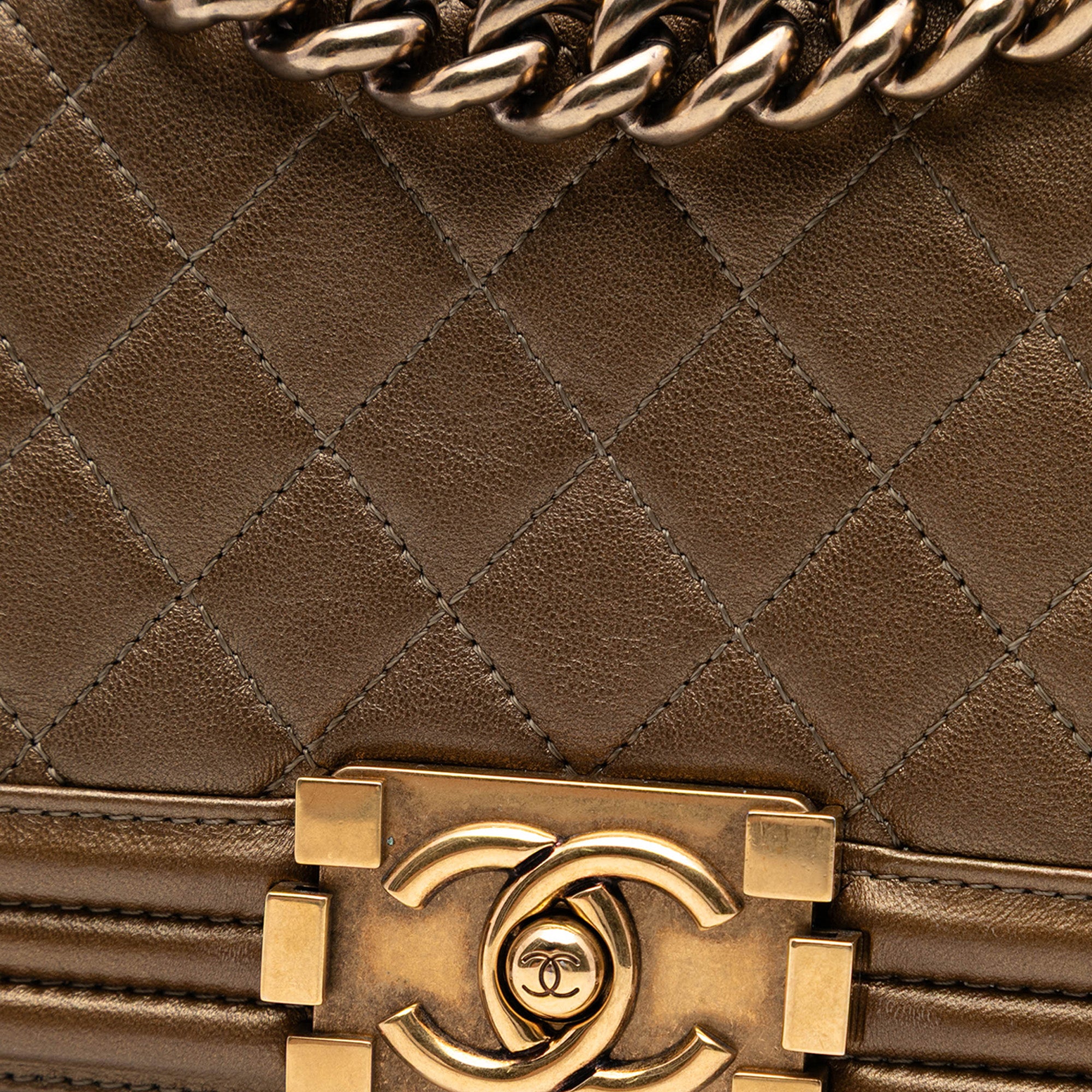 Product Details: Brown Chanel Small Quilted Metallic Calfskin Boy Flap Crossbody Bag. This crossbody bag features a quilted calf leather body, a curb chain strap with leather guard, a front flap with a CC push-lock closure, and an interior slip pocket. 4.7" L x 7.9" W x 2.4" D. Serial number 16269843.