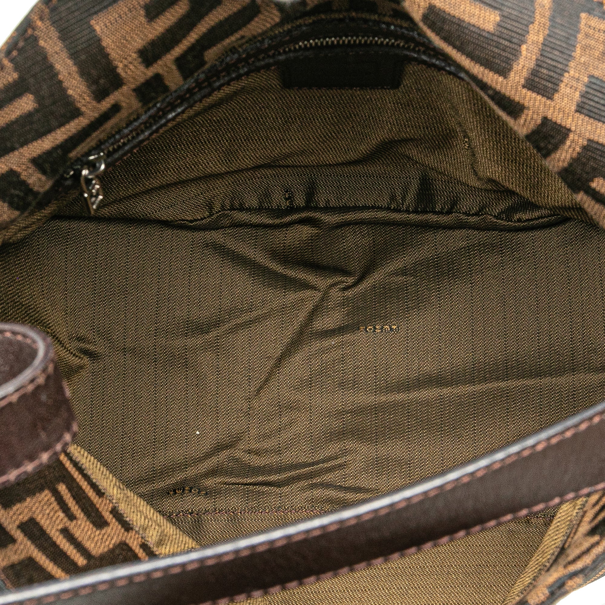 Product Details: Brown Fendi Zucca Canvas Double Flap Mamma Shoulder Bag. This shoulder bag features a canvas body, a flat leather strap, a top flap with magnetic snap closure, and an interior zip pocket. 9.1" L x 9.4" W x 4.9" D, 6.3" drop. Serial number 2228 25426 099.
