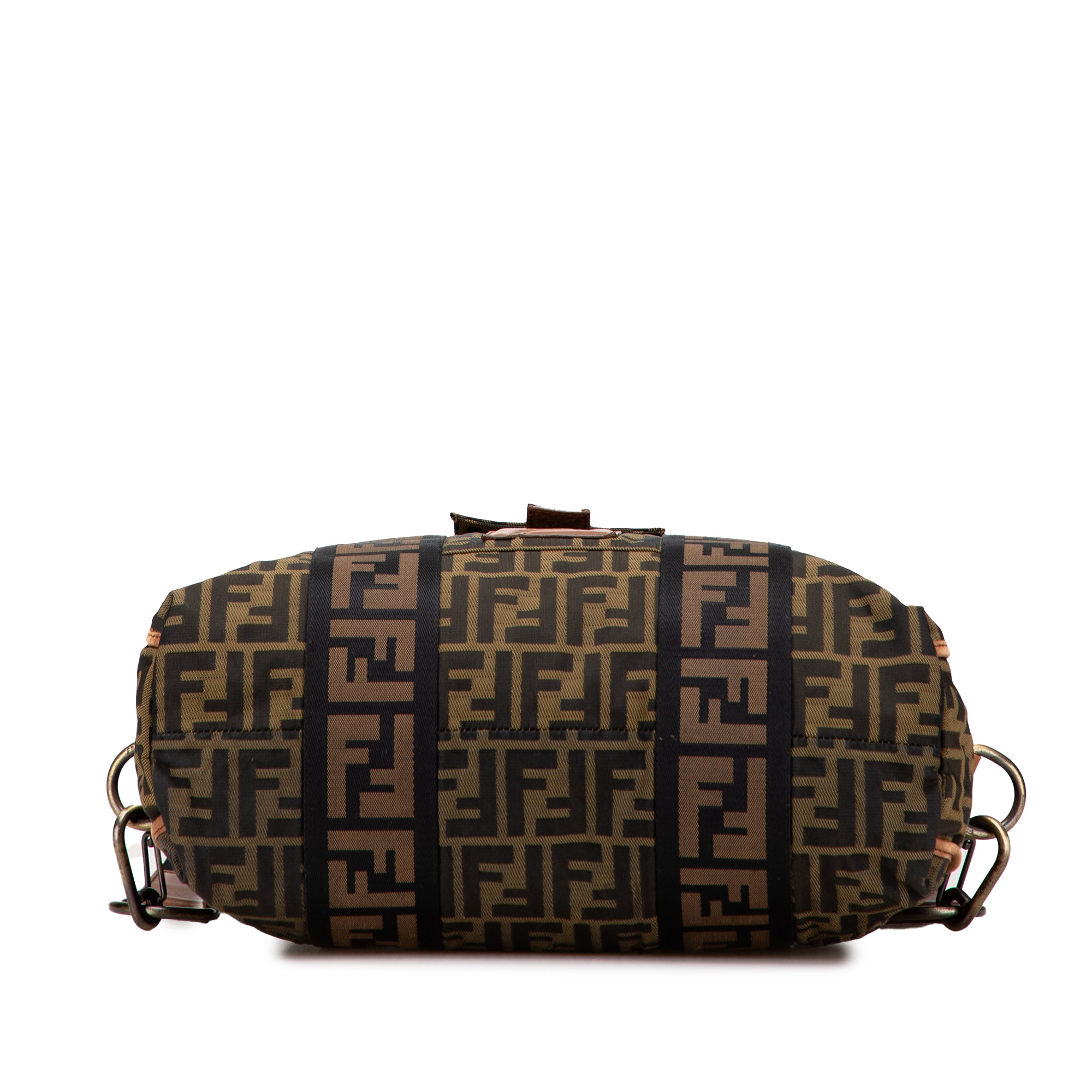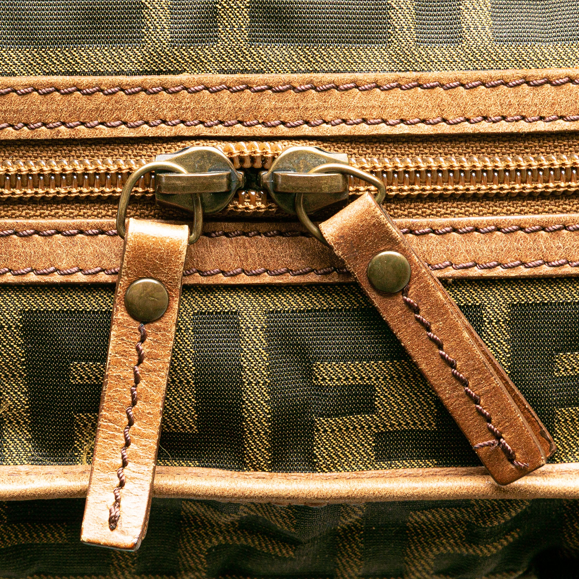 Product Details: Brown Fendi Zucca Canvas FF Satchel. This satchel bag features a canvas body with leather trim, flat top handles, a detachable flat canvas shoulder strap, a top zip closure, and an interior slip pocket. 11.8" L x 13.4" W x 4.3" D, 3.9" drop. Serial number 2288 7VA158 MX7 069.