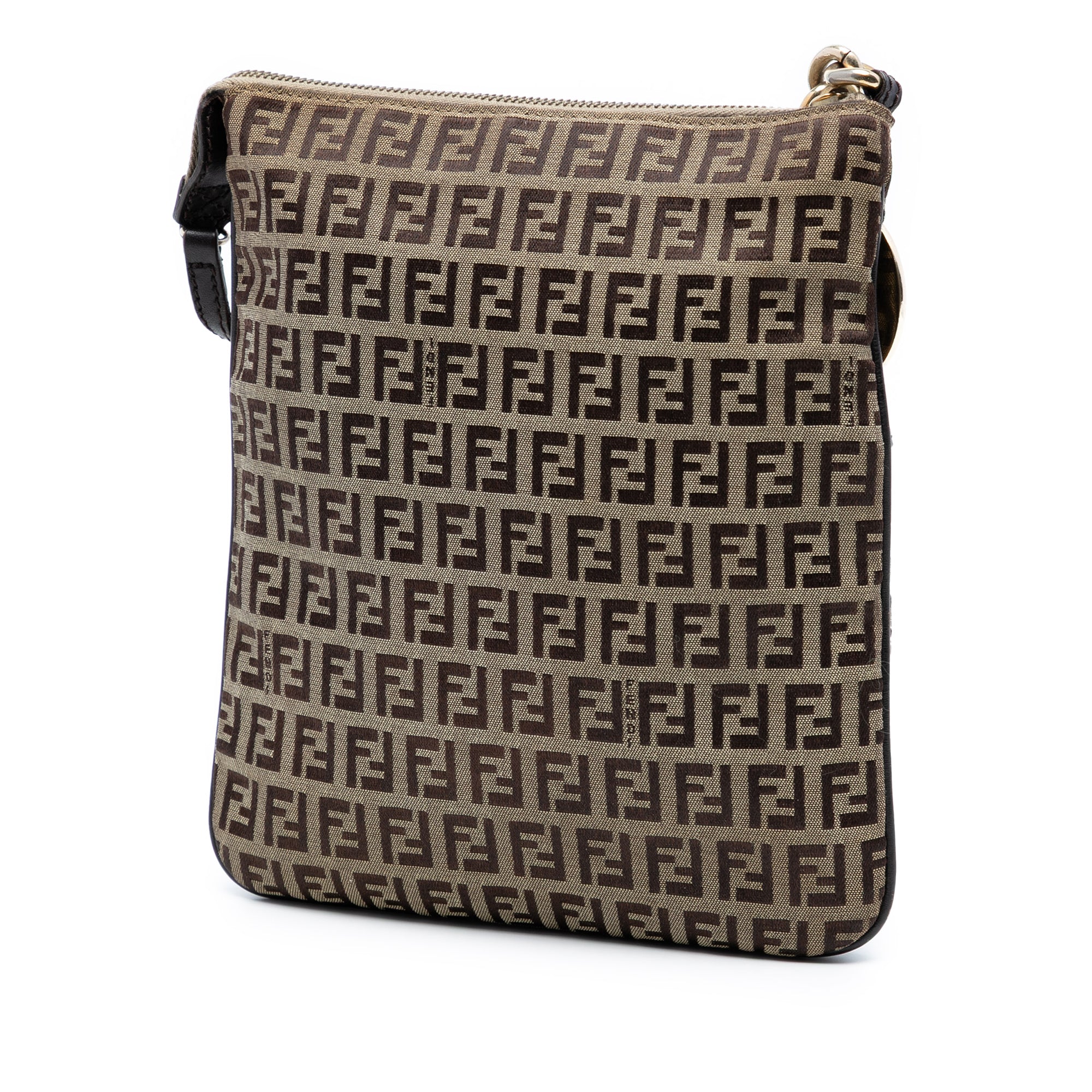 Product Details: Brown Fendi Zucchino Canvas Forever Crossbody. This crossbody bag features a canvas body, an adjustable flat leather strap, a top zip closure, an exterior slip pocket, and an interior slip pocket. 9.4" L x 8.3" W x 0.2" D. Serial number 2415-8BT150-YNV-098.