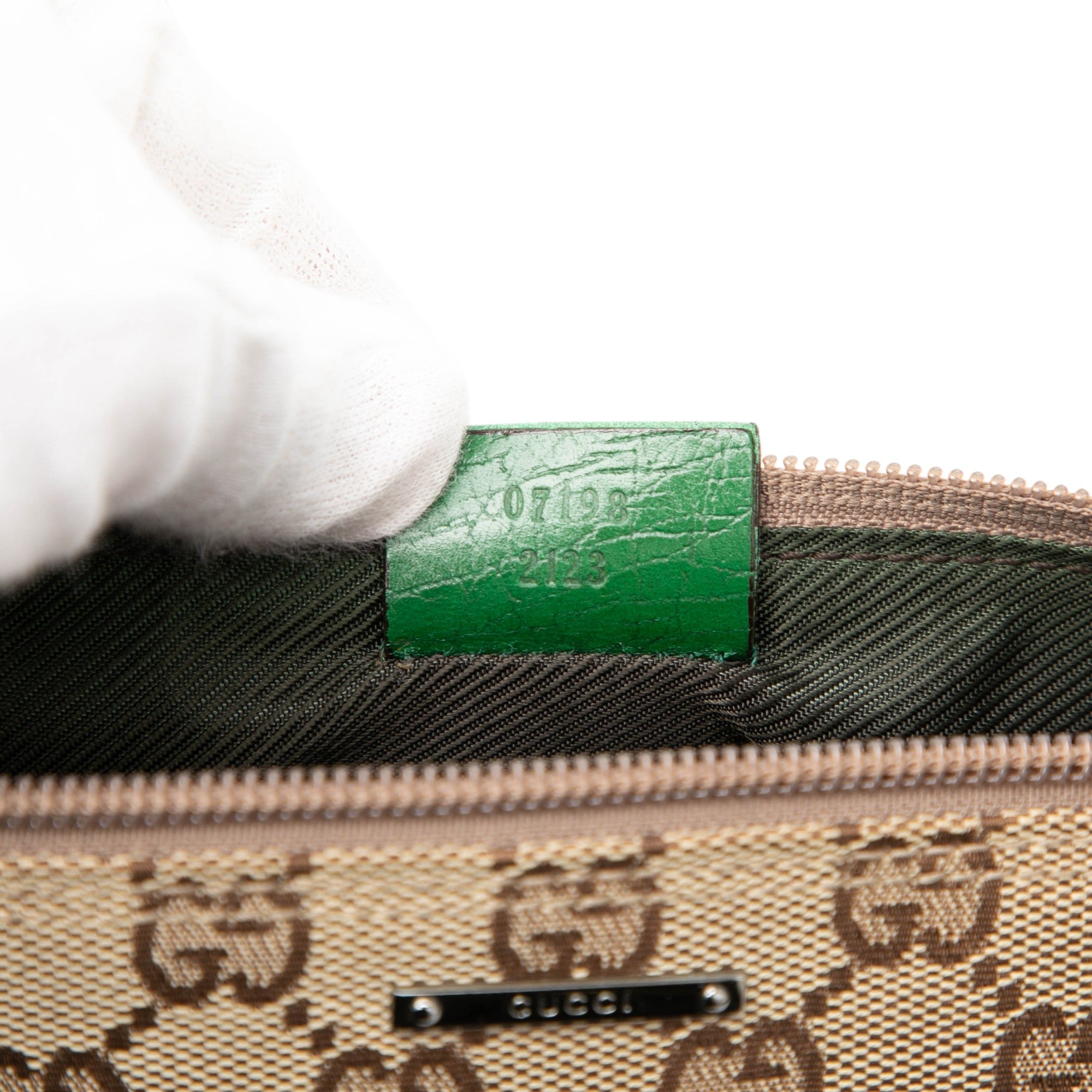 Product Details: Tan Gucci GG Canvas Boat Shoulder Bag. This shoulder bag features a canvas body with leather trim, a flat leather strap, and a top zip closure. 4.3" L x 8.5" W x 3.9" D, 4.3" drop. Serial number 07198 2123.