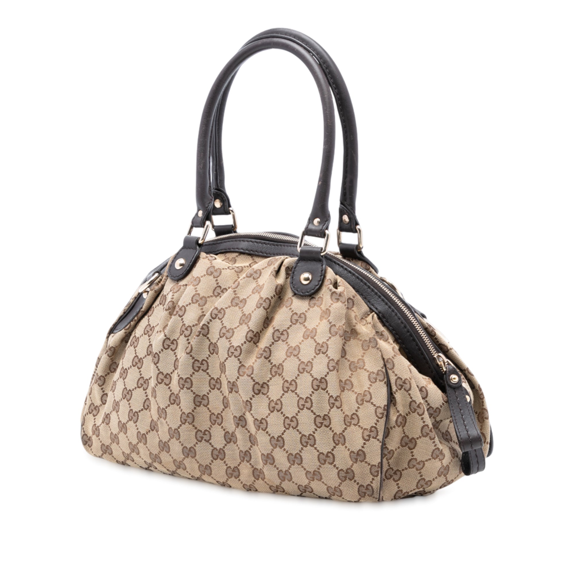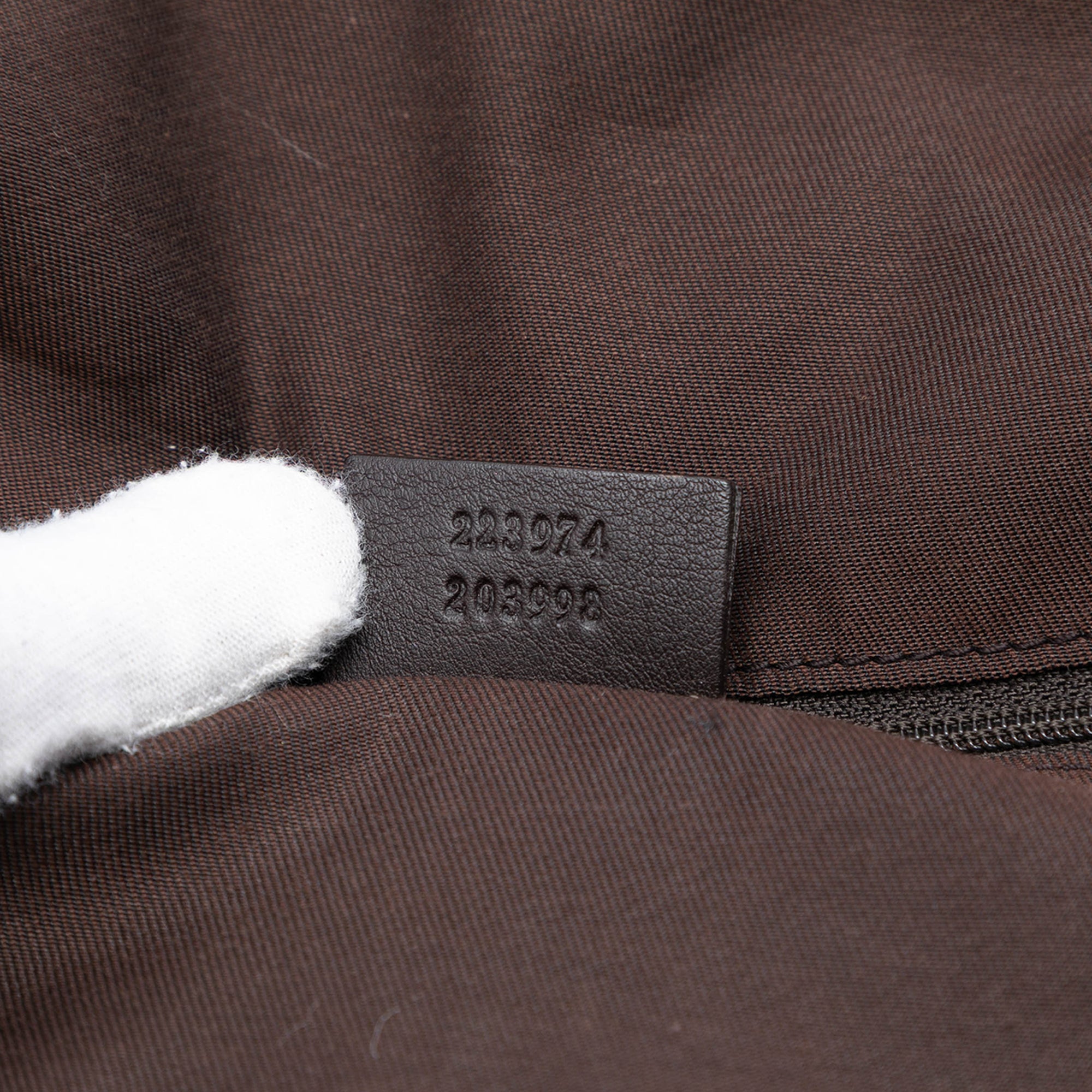Product Details: Brown Gucci GG Canvas Sukey Satchel. The Sukey satchel features a canvas body with leather trim, rolled leather handles, a top zip closure, and an interior zip pocket. 11.8" L x 13.4" W x 6.9" D, 6.7" drop. Serial number 223974 203998.