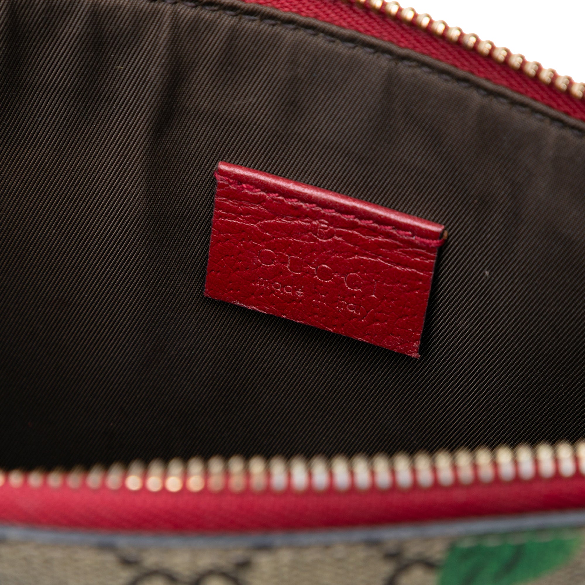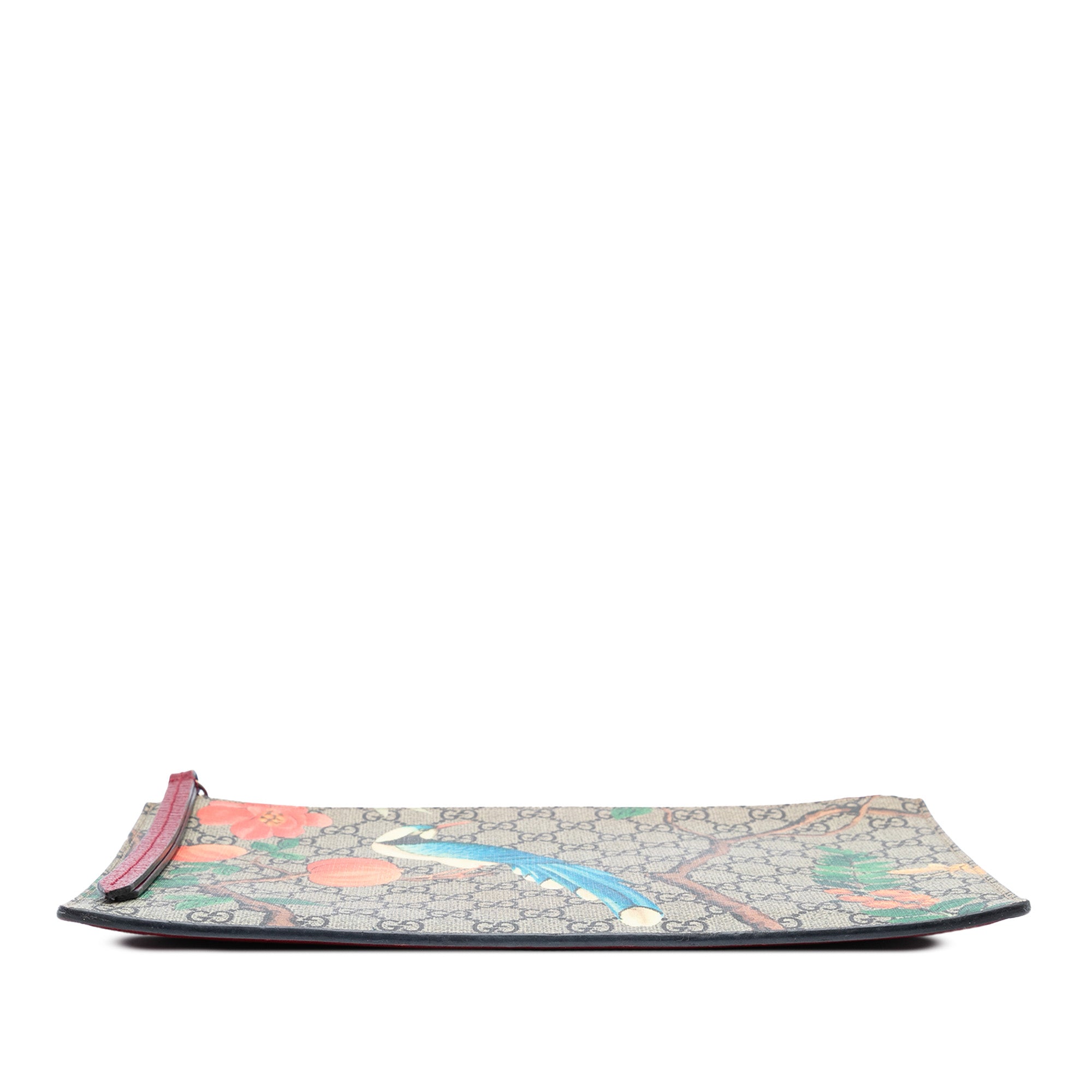 Product Details: Brown Gucci Large GG Supreme Tian Clutch. This clutch bag features a printed coated canvas body with leather trim and a top zip closure. 7.9" L x 11.8" W x 0.4" D. Serial number 424900 0959.