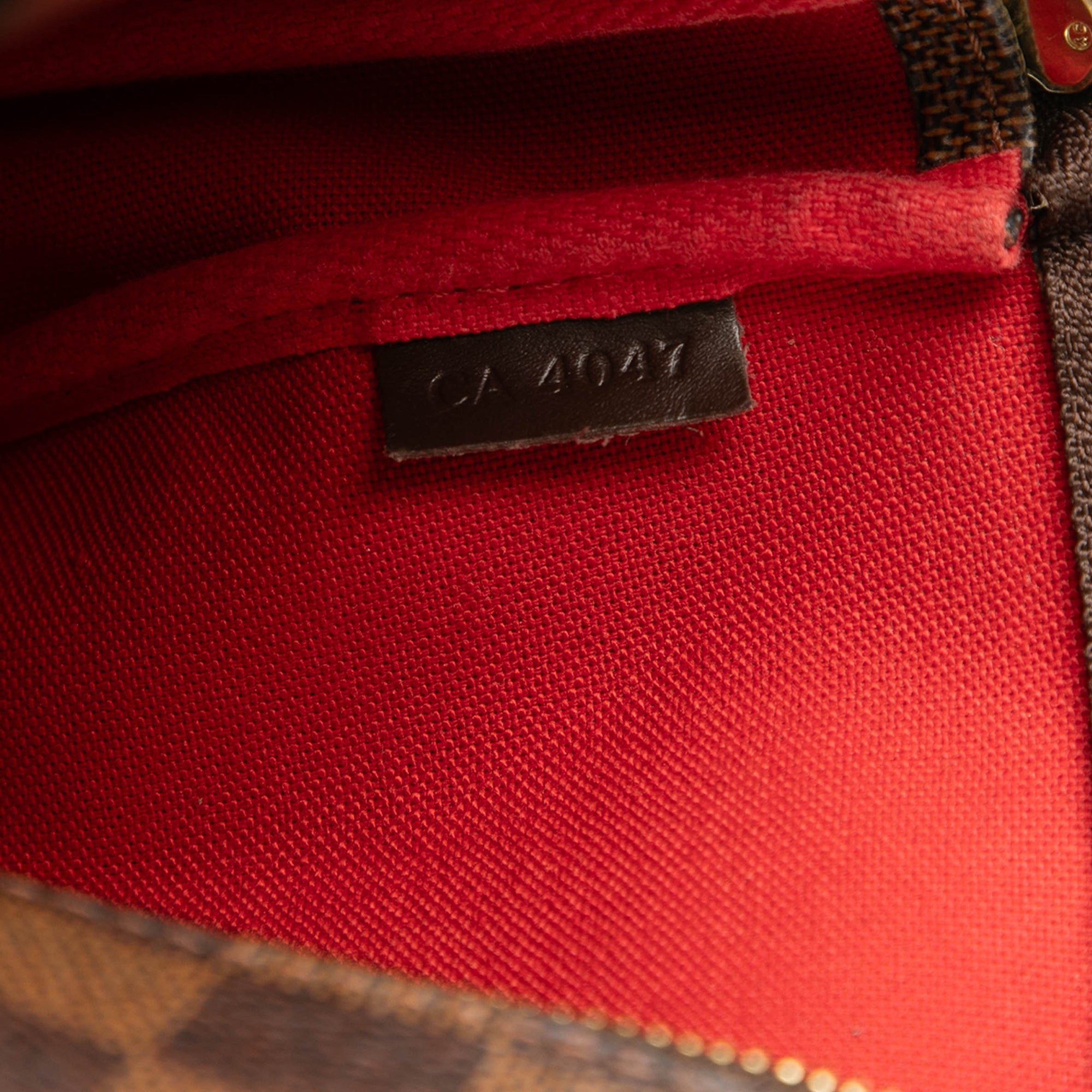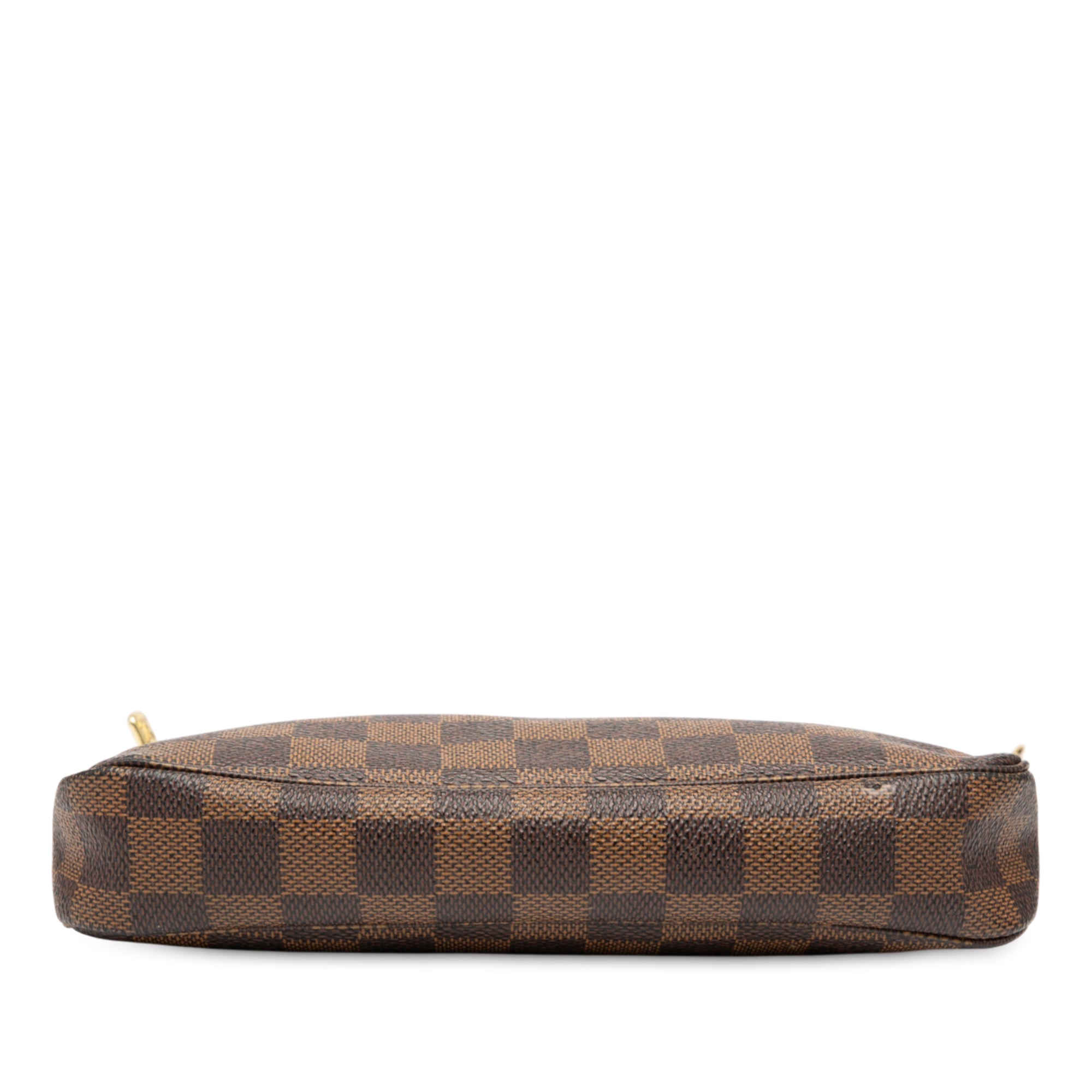 Product Details: Brown Louis Vuitton Damier Ebene Pochette Accessoires Shoulder Bag. The Pochette Accessoires features a damier ebene canvas body, a flat leather handle, and a top zip closure. 5.1" L x 8.3" W x 1.4" D. Serial number CA4047.