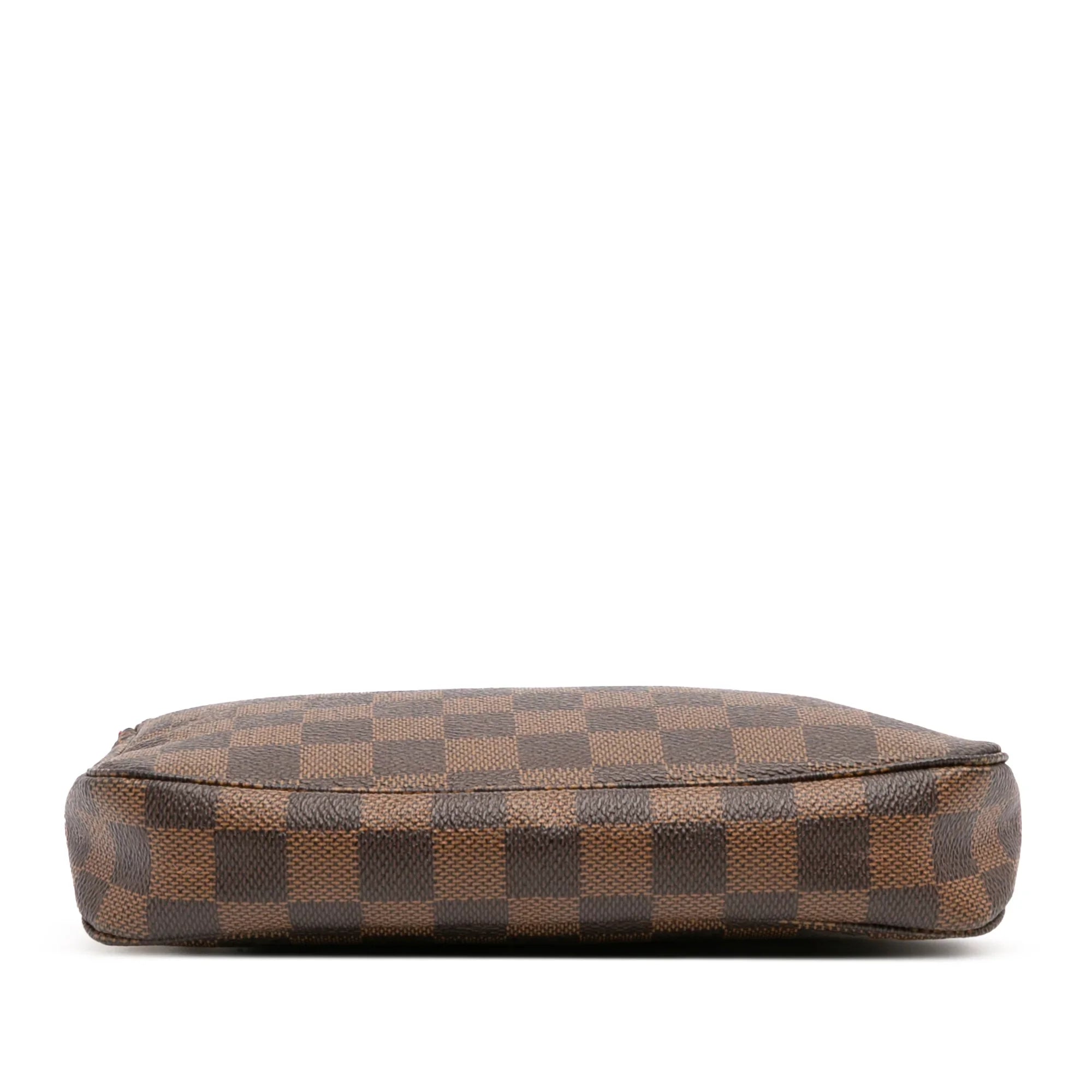 Product Details: Brown Louis Vuitton Damier Ebene Pochette Accessoires Shoulder Bag. The Pochette Accessoires features a damier ebene canvas body, a flat leather strap, and a top zip closure. 5.1" L x 8.7" W x 1.4" D. Serial number CA0079.
