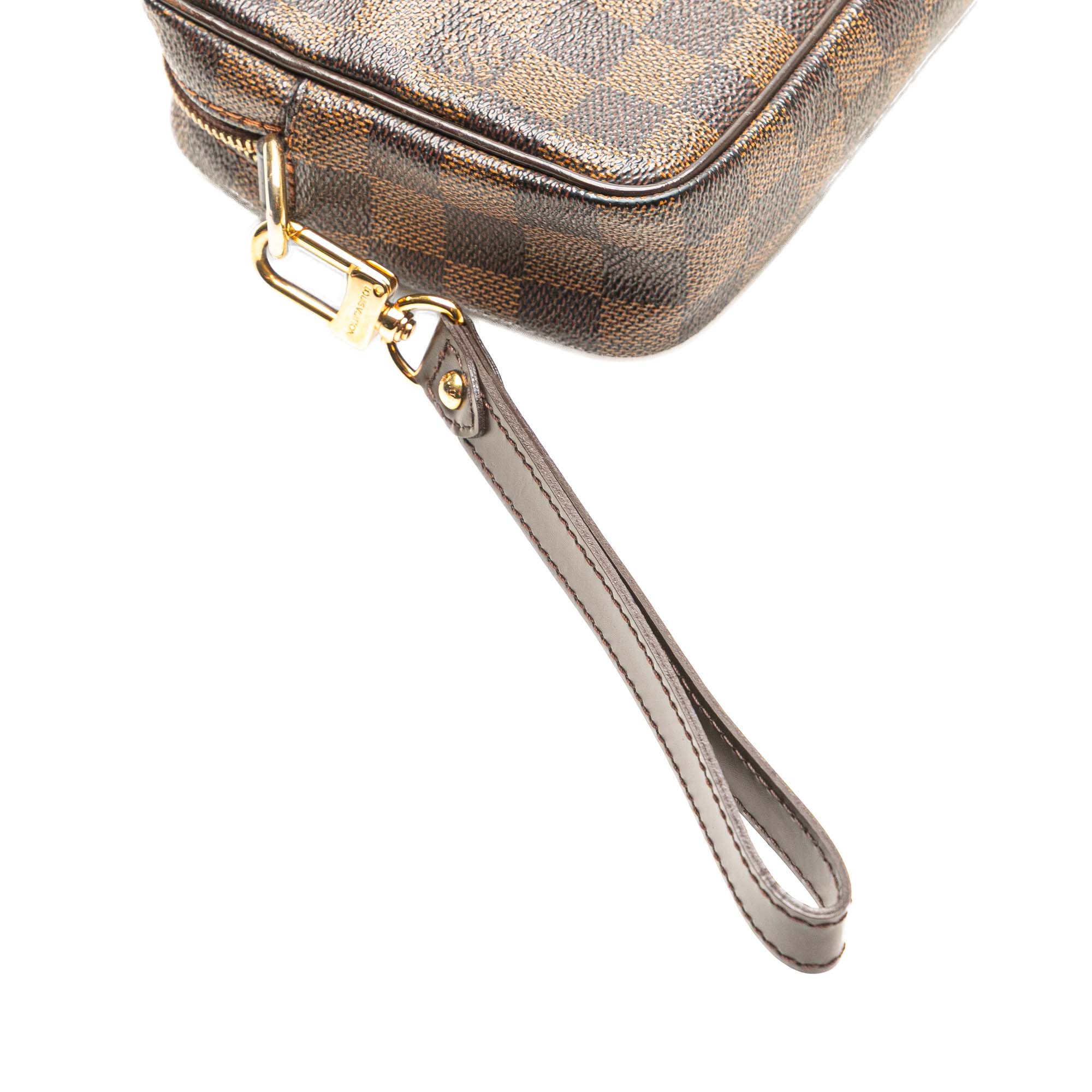 Product Details: Brown Louis Vuitton Damier Ebene Pochette Billets Macao Clutch Bag. The Billets Macao features a damier ebene canvas body with leather trim, a detachable flat leather wrist strap, a top zip closure, an exterior front zip pocket, an exterior back slip pocket, and interior slip pockets. 5.1" L x 7.9" W x 1.8" D, 8.3" drop. Serial number TR1121.