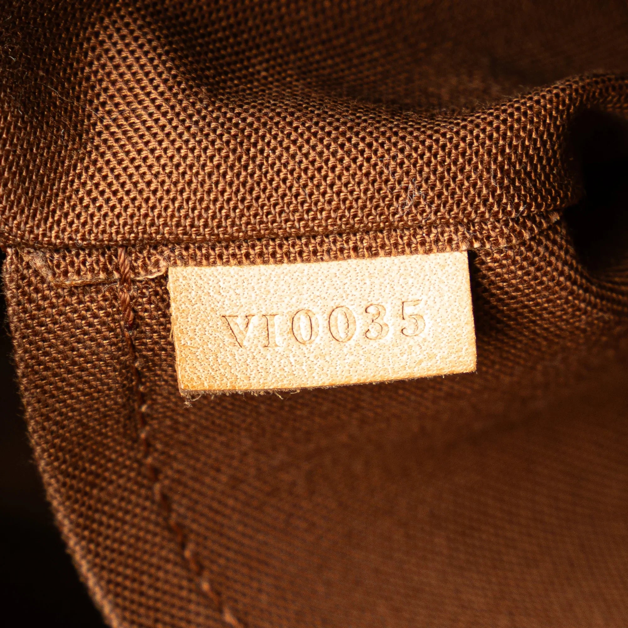 Product Details: Brown Louis Vuitton Monogram Batignolles Vertical PM Handbag. The Batignolles Vertical PM features a monogram canvas body with vachetta leather trim, flat vachetta leather handles, an open top, and interior slip pockets. 8.7" L x 9.4" W x 5.5" D. Serial number VI0035.