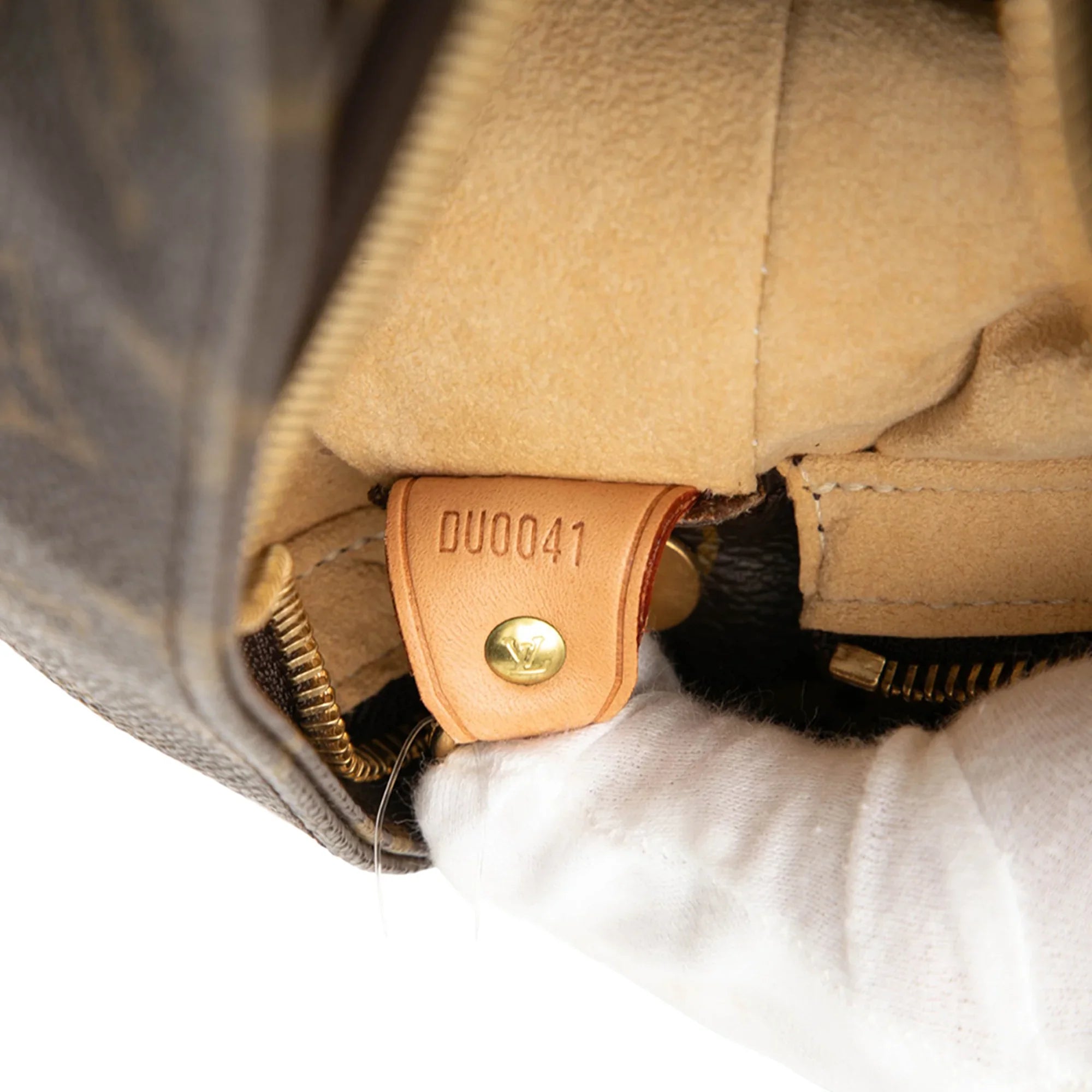 Product Details: Brown Louis Vuitton Monogram Looping GM Shoulder Bag. The Looping GM features a monogram canvas body, a rolled vachetta leather shoulder strap, a top zip closure, and interior zip and slip pockets. 12.2" L x 11.2" W x 4.1" D, 9.6" drop. Serial number DU0041.