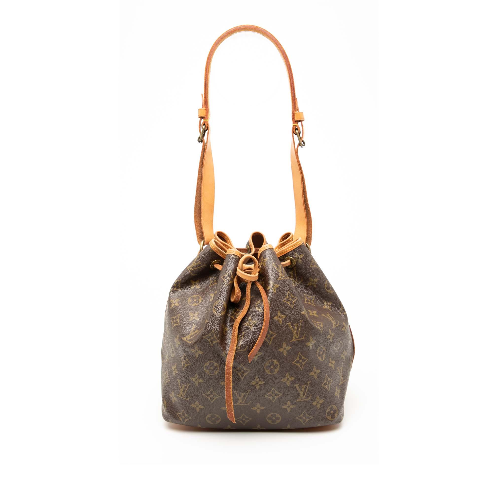 Product Details: Brown Louis Vuitton Monogram Petit Noe Bucket Bag. The Petit Noe features a monogram canvas body, an adjustable flat vachetta leather strap, and an open top with drawstring closure. 10.6" L x 9.8" W x 7.1" D.
