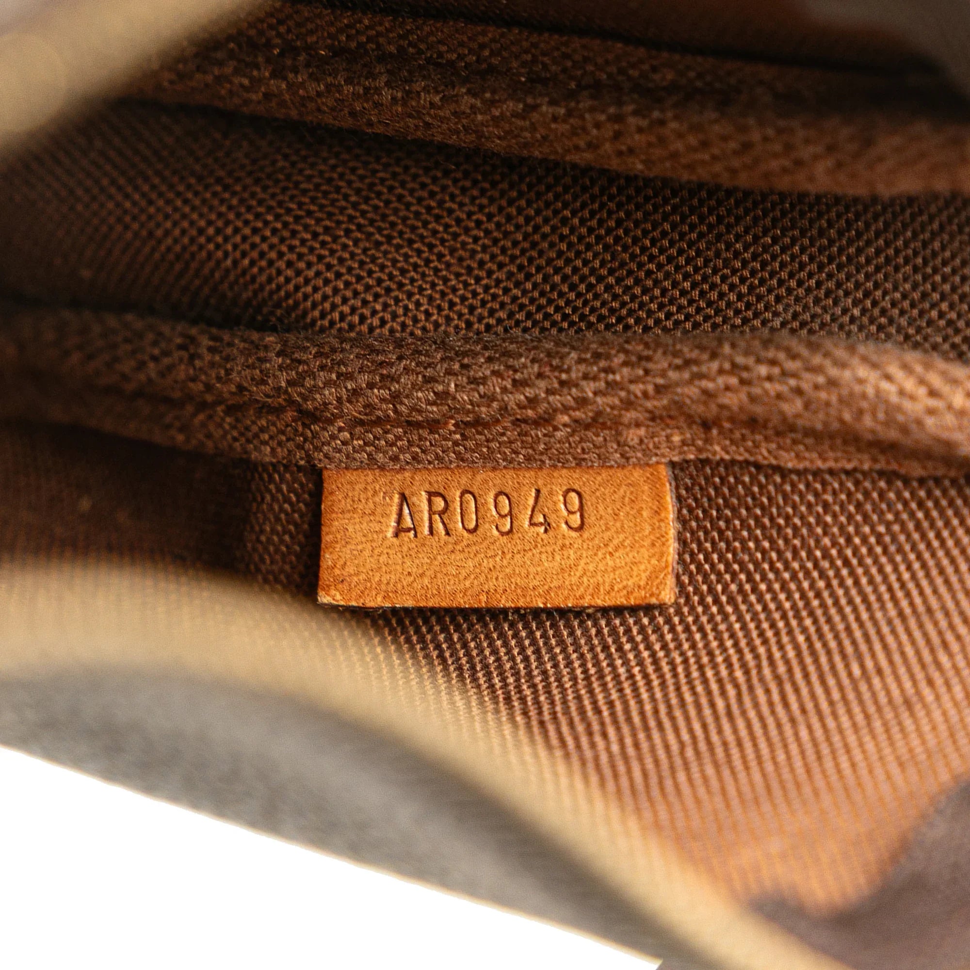 Product Details: Brown Louis Vuitton Monogram Pochette Accessoires Shoulder Bag. The Pochette Accessoires features a monogram canvas body, a flat vachetta leather handle, and a top zip closure. 5.1" L x 8.3" W x 1.2" D. Serial number AR0949.