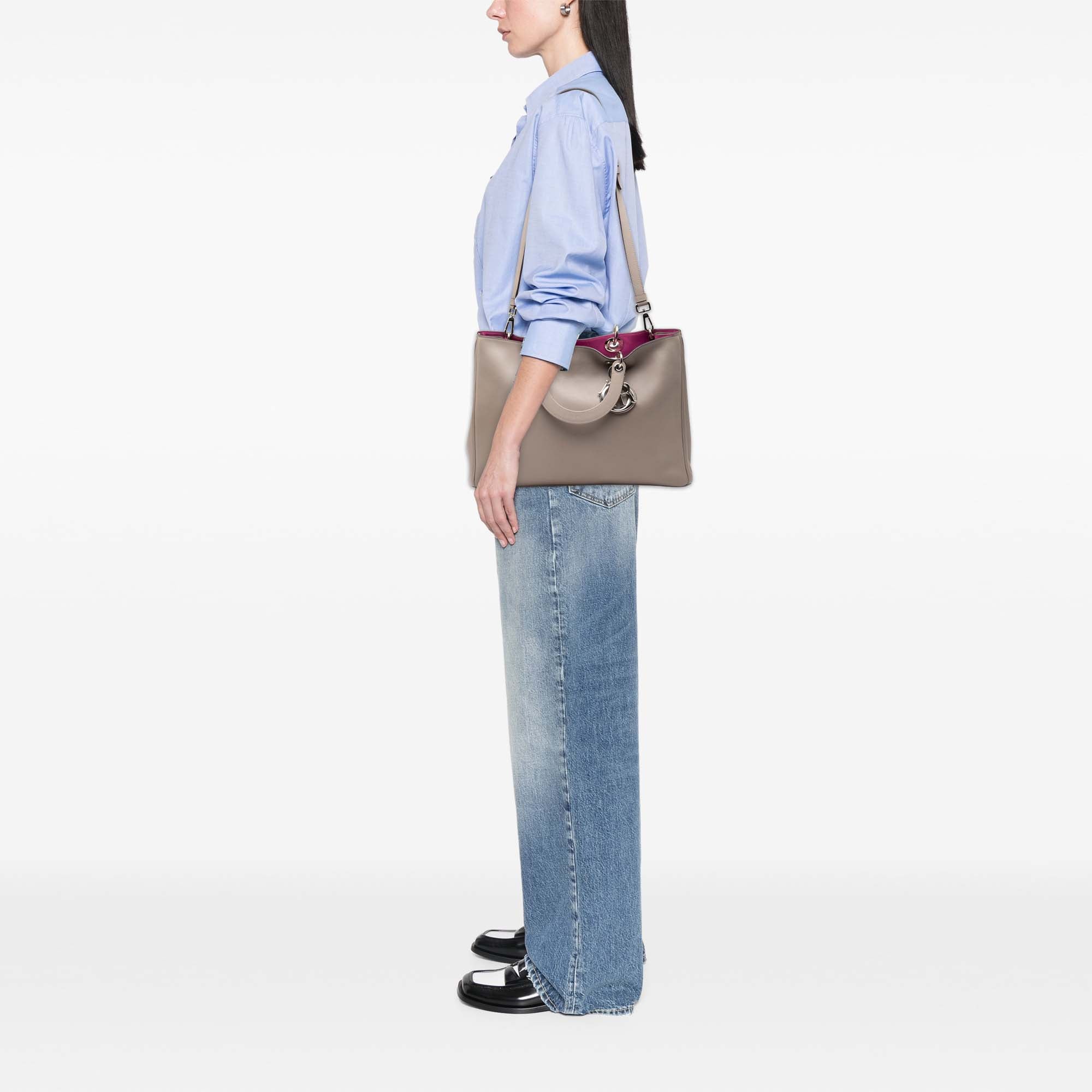 Product Details: Gray Dior Large Leather Diorissimo Satchel. The Diorissimo features a leather body, flat leather top handles, a detachable and adjustable flat leather shoulder strap, an open top with magnetic snap closure, and interior slip pockets. 9.8" L x 14.6" W x 4.7" D, 3.9" drop. Serial number 09-MA-0112.
