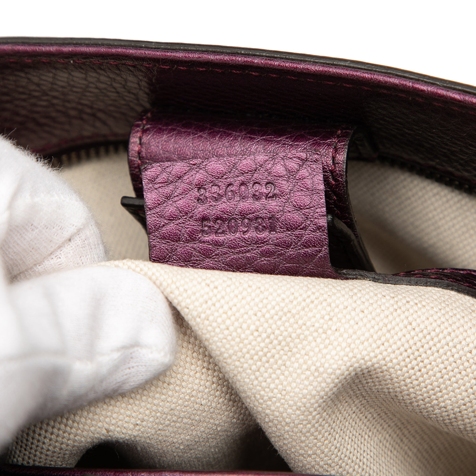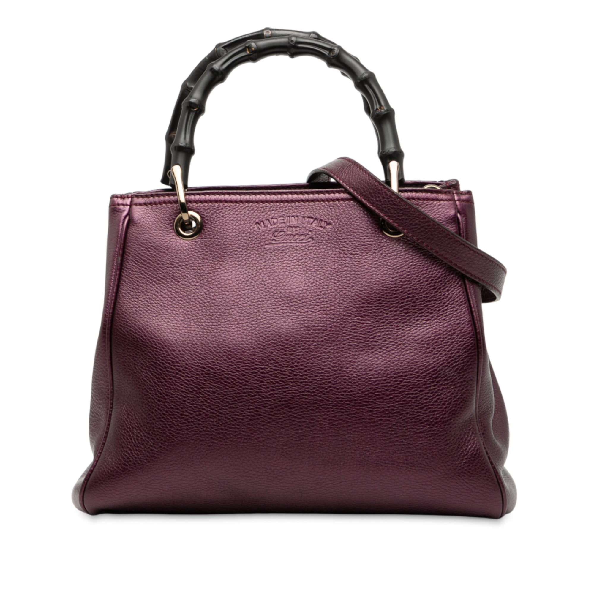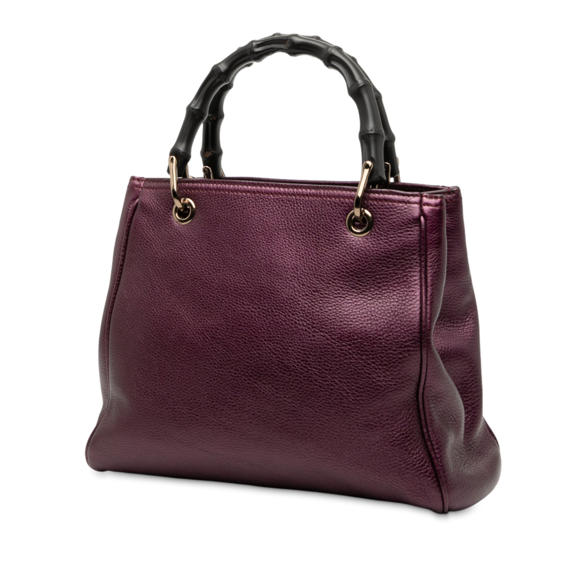 Product Details: Purple Gucci Small Metallic Calfskin Bamboo Shopper Satchel. The Bamboo Shopper satchel features a metallic leather body, bamboo top handles, a detachable flat leather strap, an open top with magnetic snap closure, and interior zip and slip pockets. 8.7" L x 11" W x 4.7" D, 3.5" drop. Serial number 336032 520981.