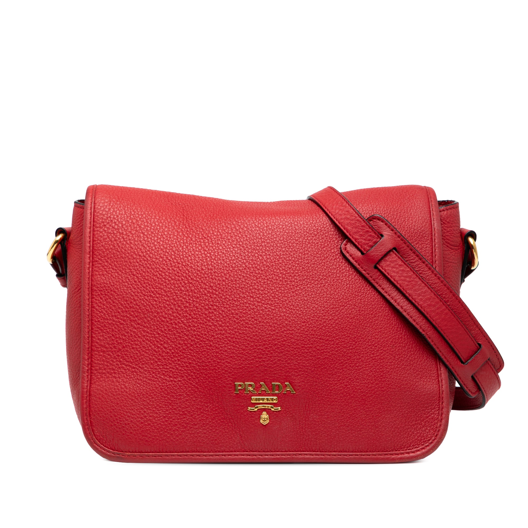 Product Details: Red Prada Vitello Phenix Flap Crossbody. This crossbody bag features a leather body, an adjustable leather strap, a front flap with a magnetic closure, and an interior slip pocket. 7.1" L x 9.4" W x 4.3" D.