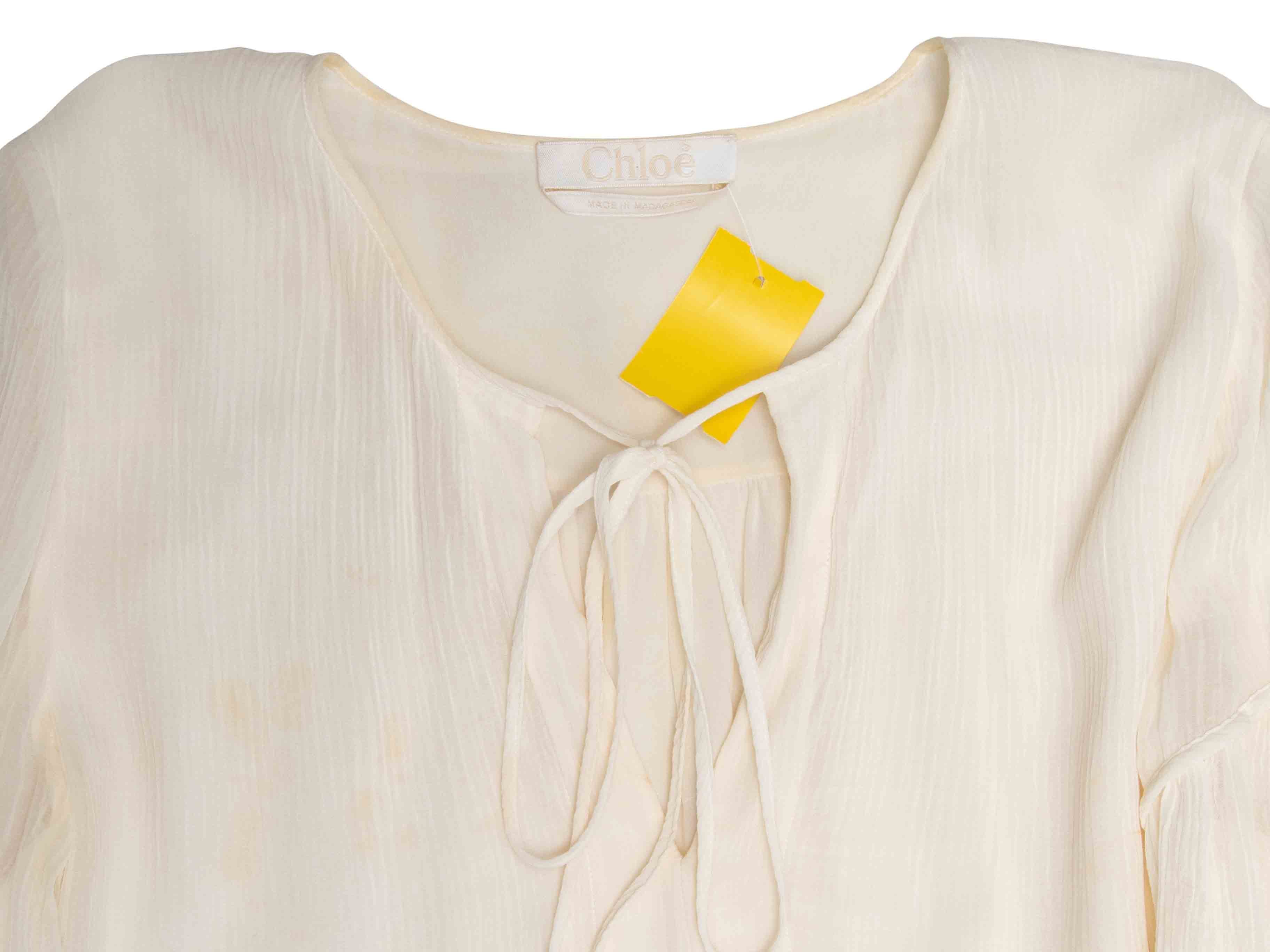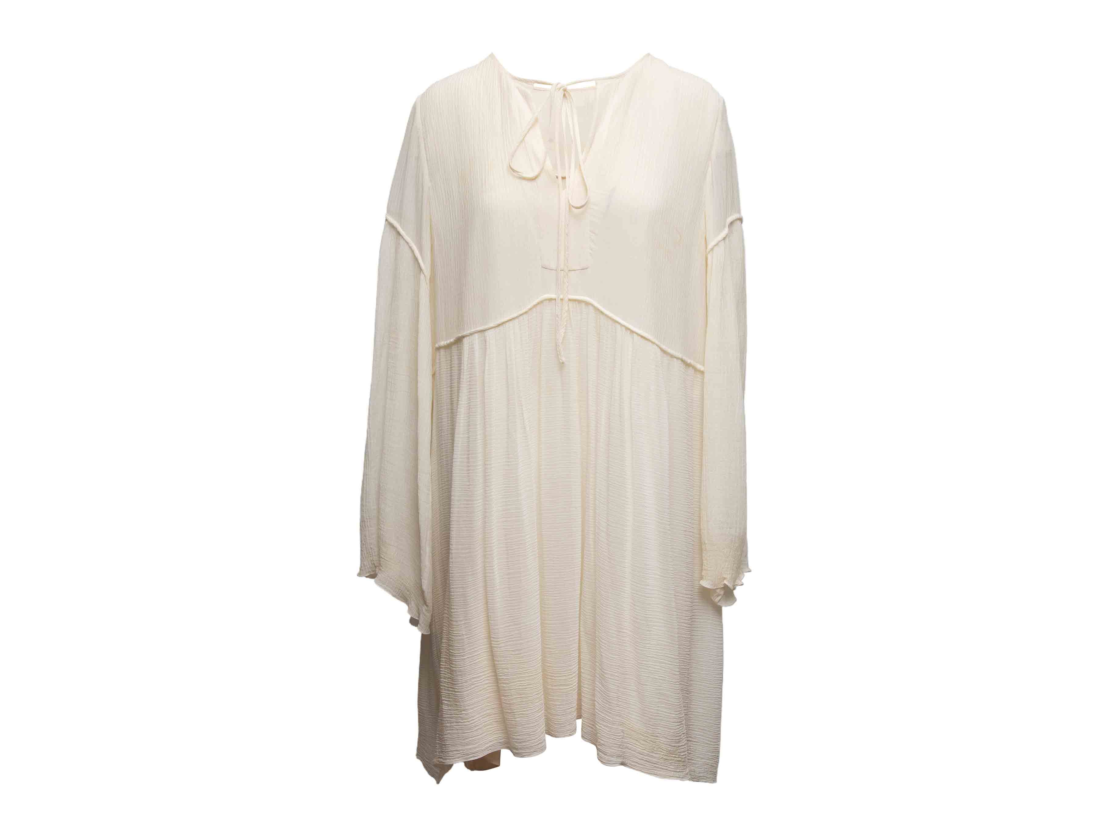 Product Details: White cotton and silk loose long sleeve knee-length dress by Chloe. V-neck featuring tie accent. 44" bust, 43" waist, 38" length, 17" shoulder width.