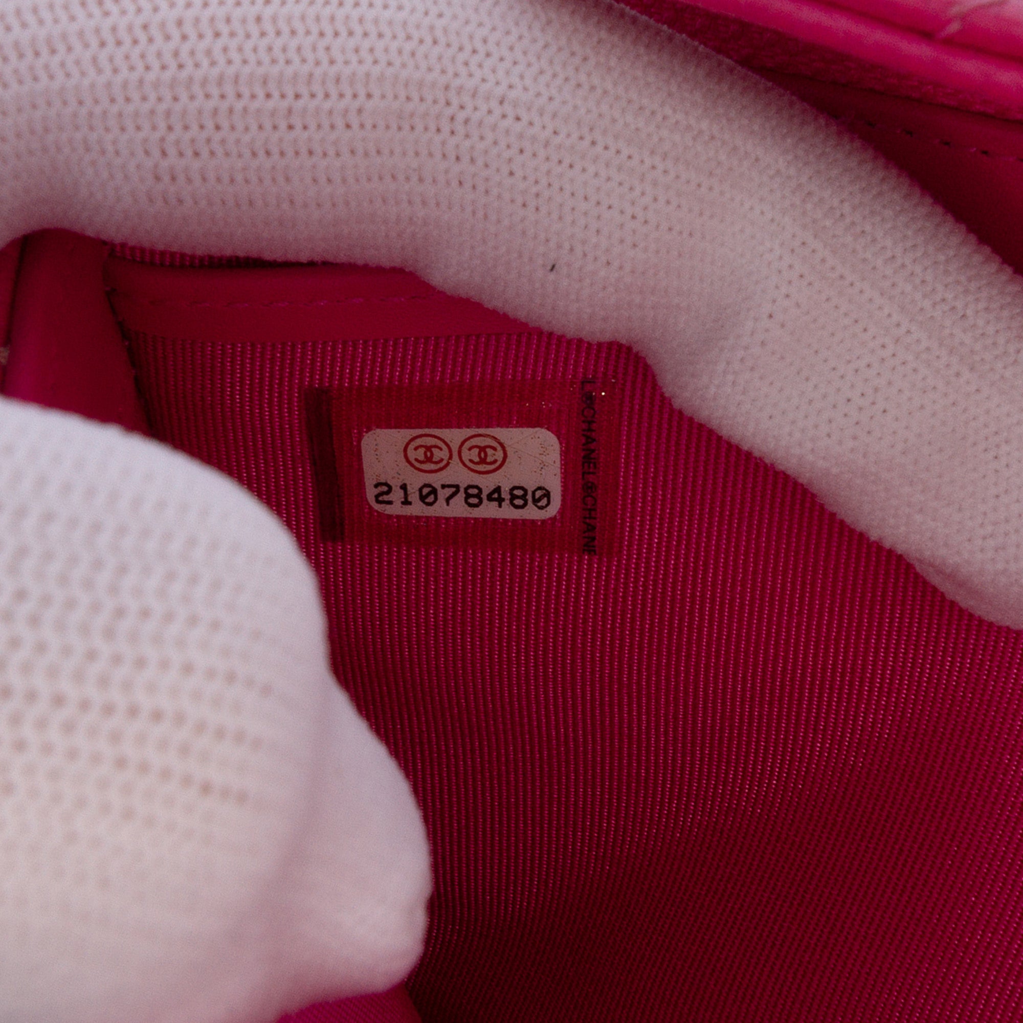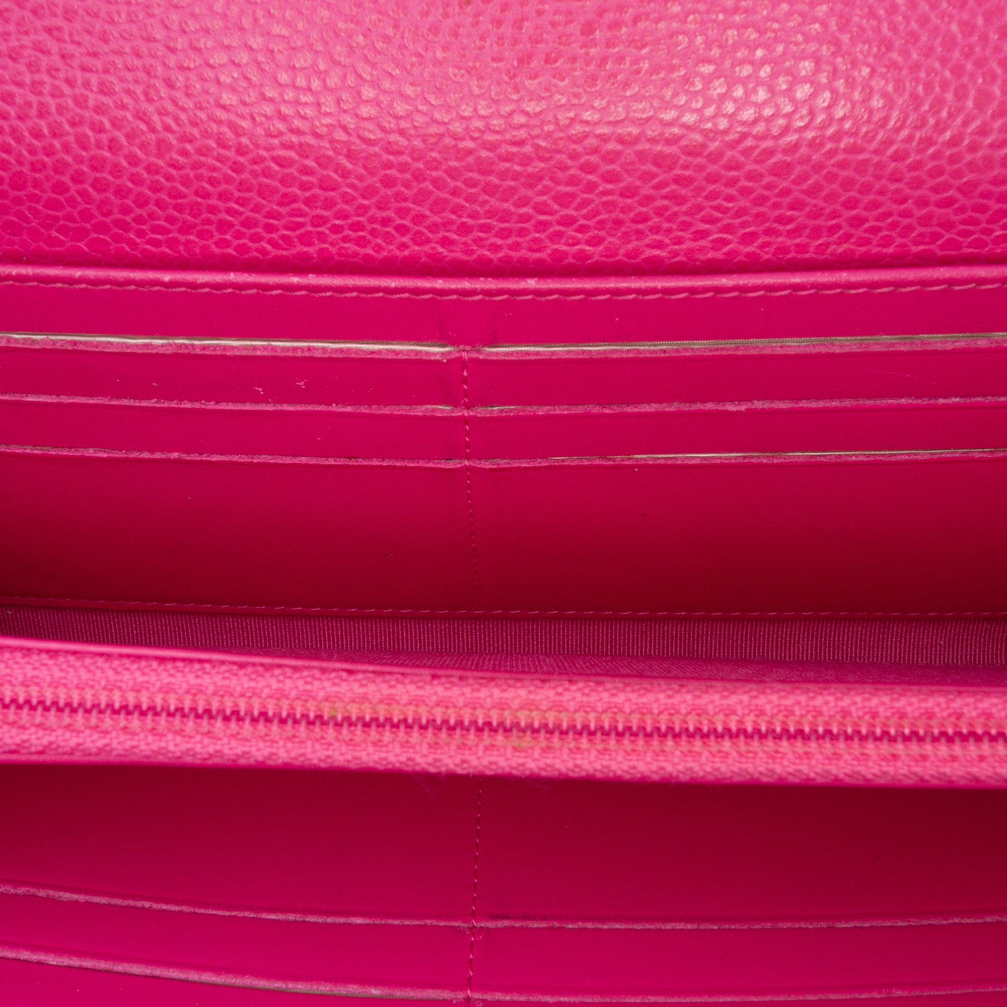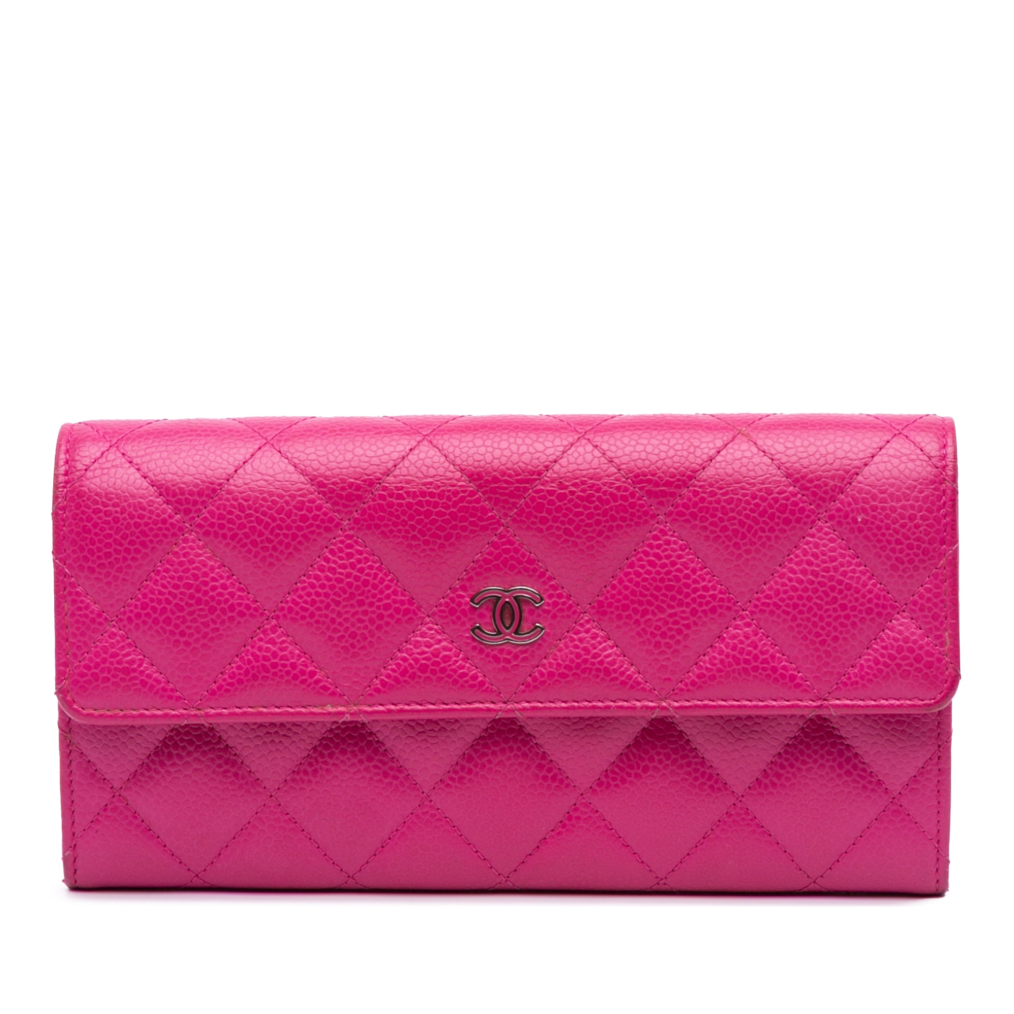 Product Details: Pink Chanel CC Quilted Caviar Long Wallet. This wallet features a caviar leather body, a front flap with snap button closure, and interior zip and slip compartments. 4.3" L x 7.7" W x 1.2" D. Serial number 21078480.
