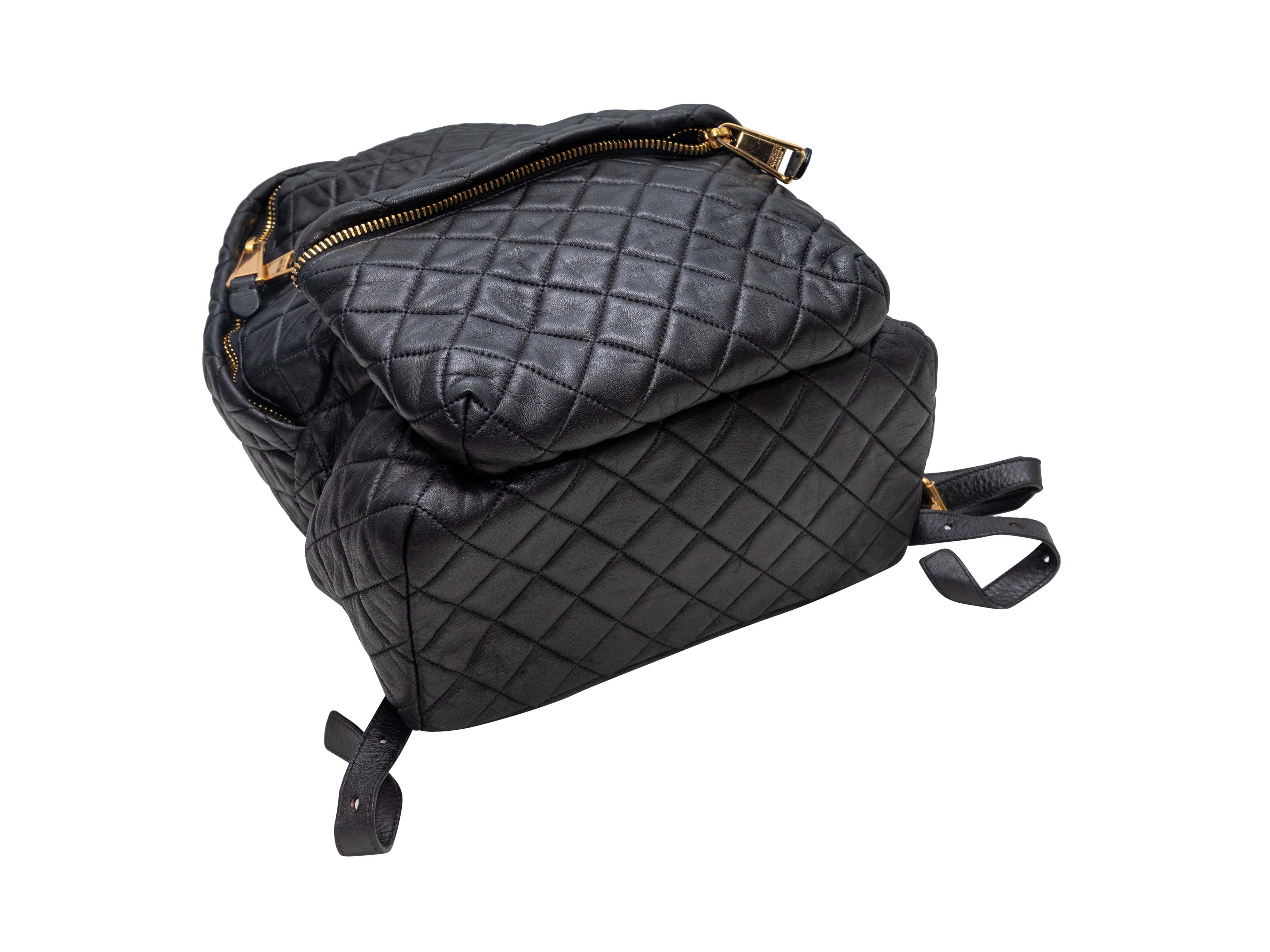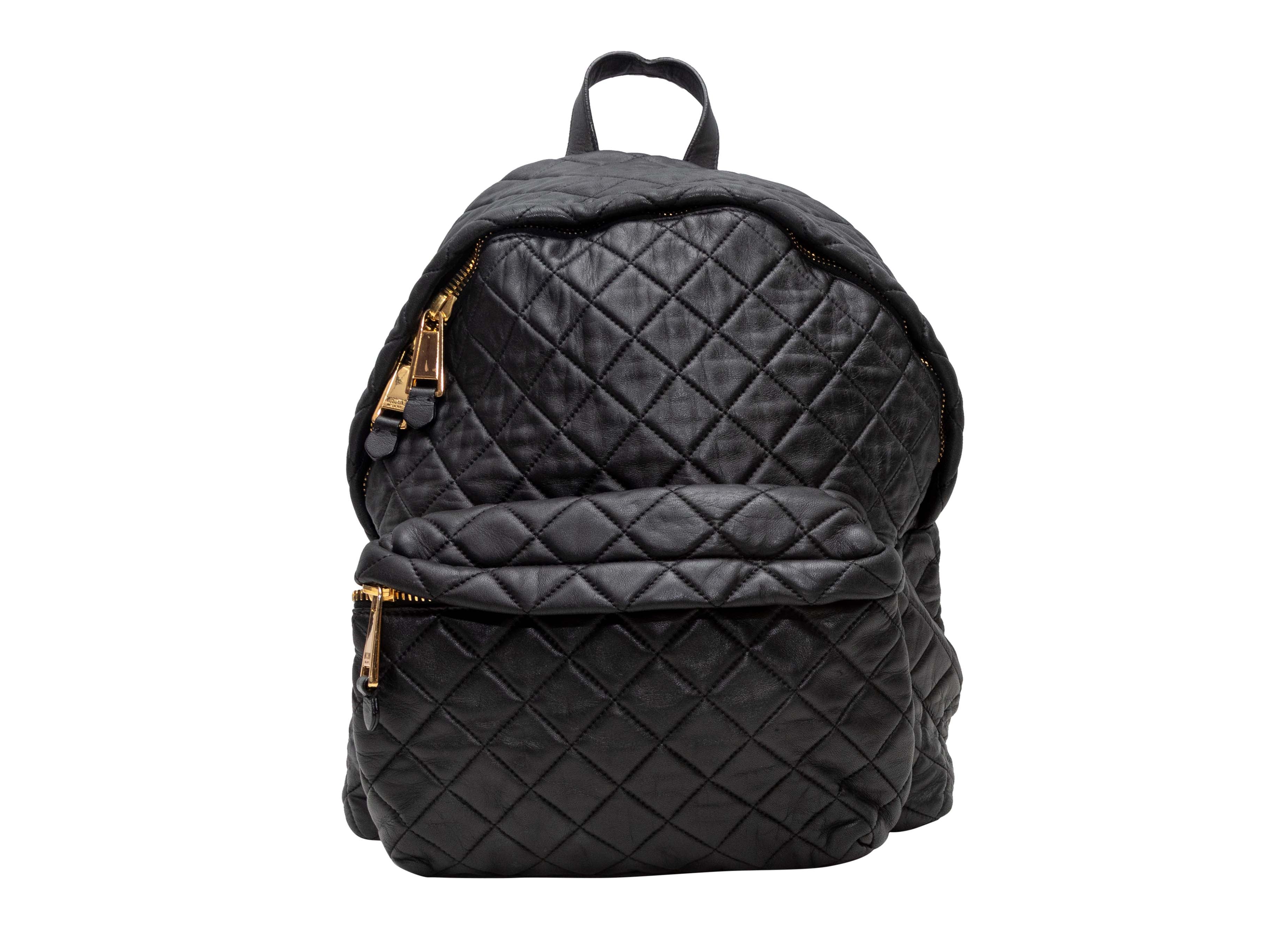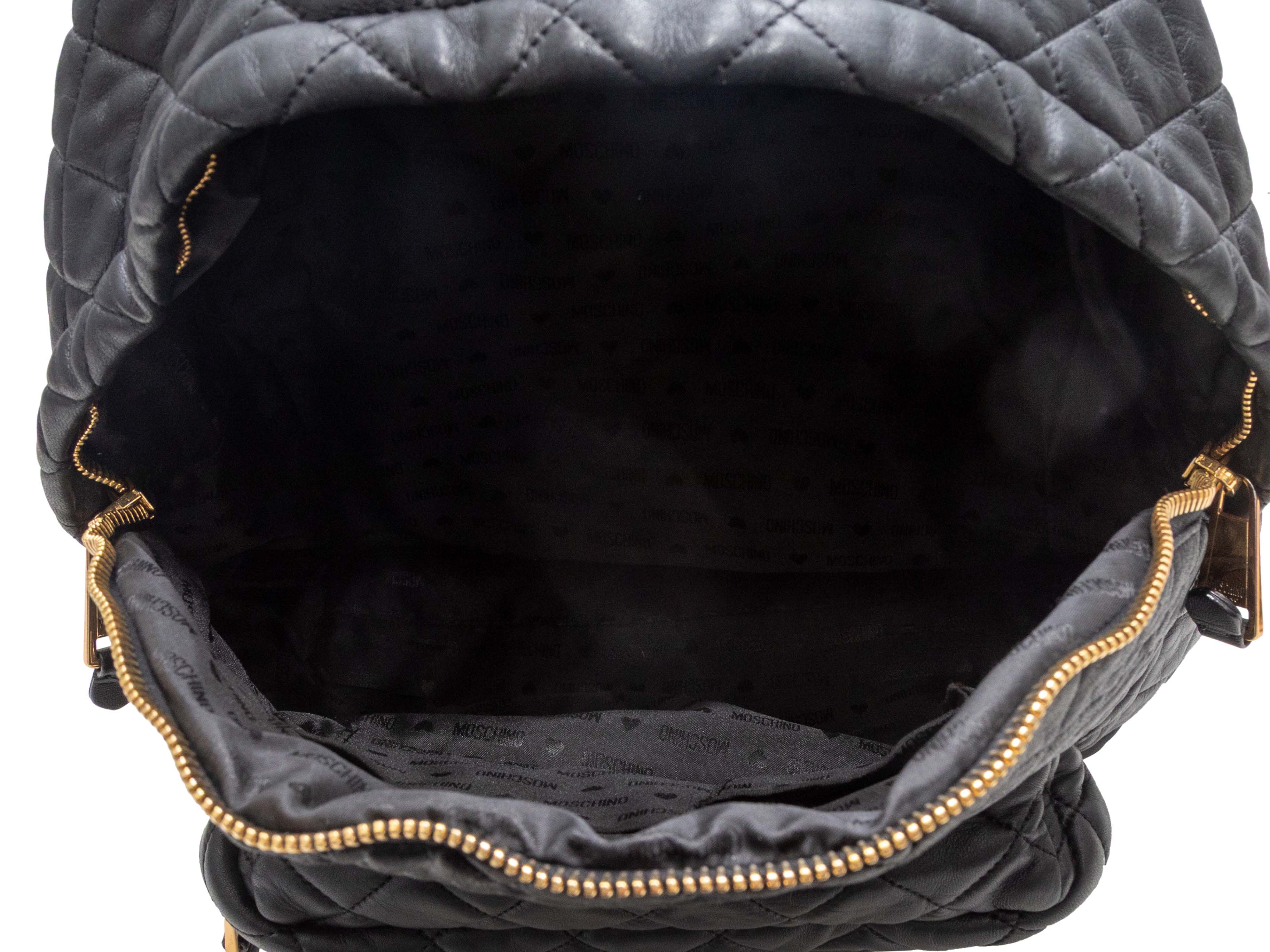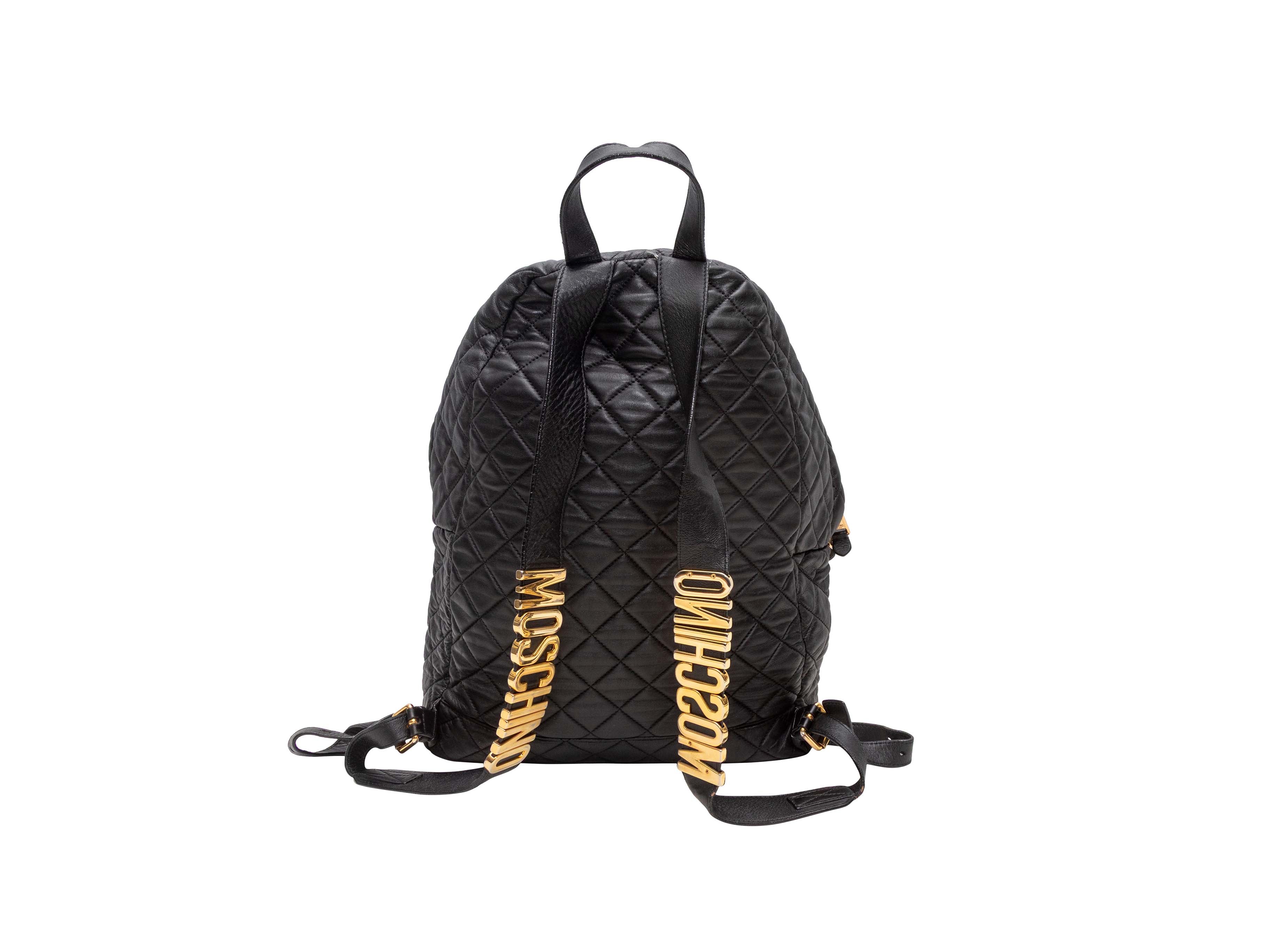 Product Details: Black Moschino Quilted Leather Backpack. This backpack features a quilted leather body, gold-tone hardawre, a front zip pocket, dual adjustable shoulder straps, and a top zip closure. 143" L x 16" H x 7" D, 10" shoulder strap drop.