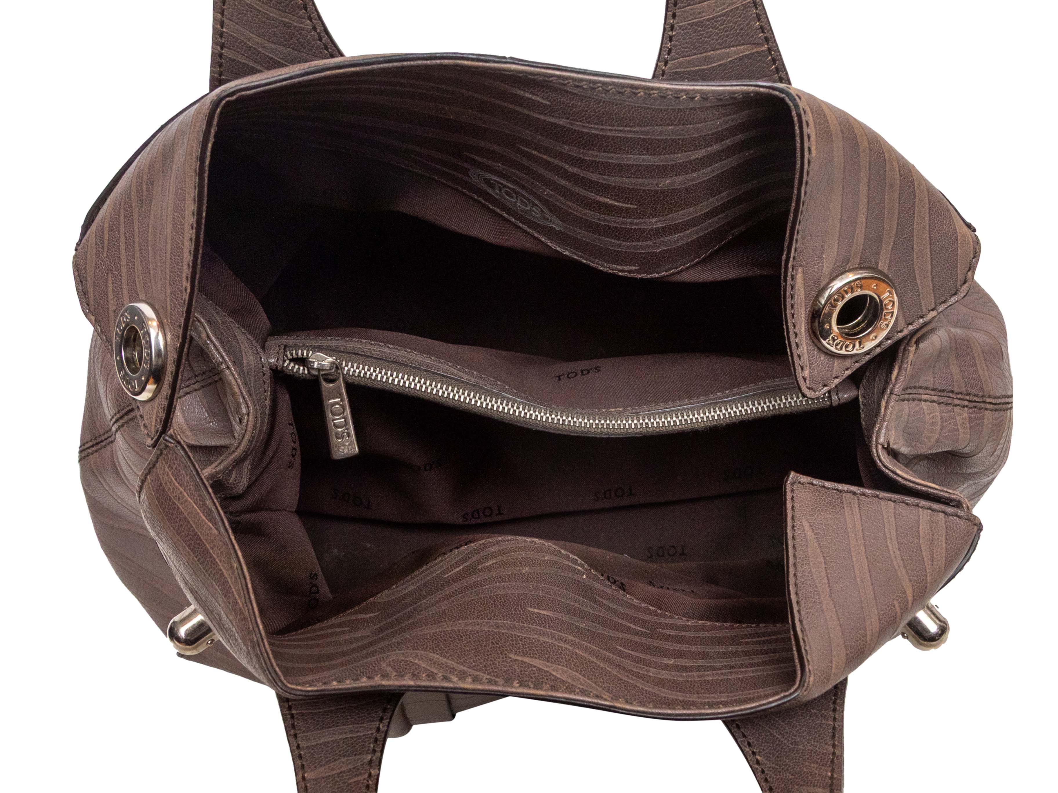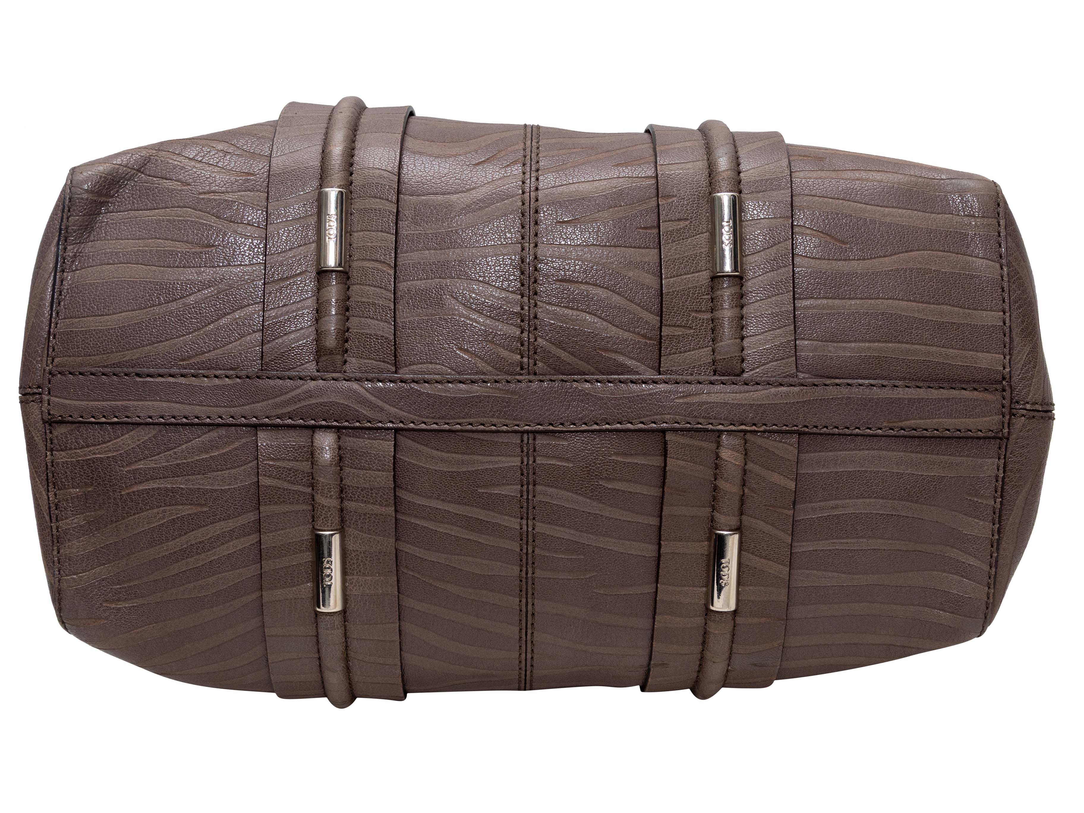 Product Details: Brown Tod's Zebra Embossed Leather Handbag. This handbag features an embossed leather body, silver-tone hardware, dual flat shoulder straps, and dual top closures. 14" L x 11.5" H x 8" D, 9" shoulder strap drop.