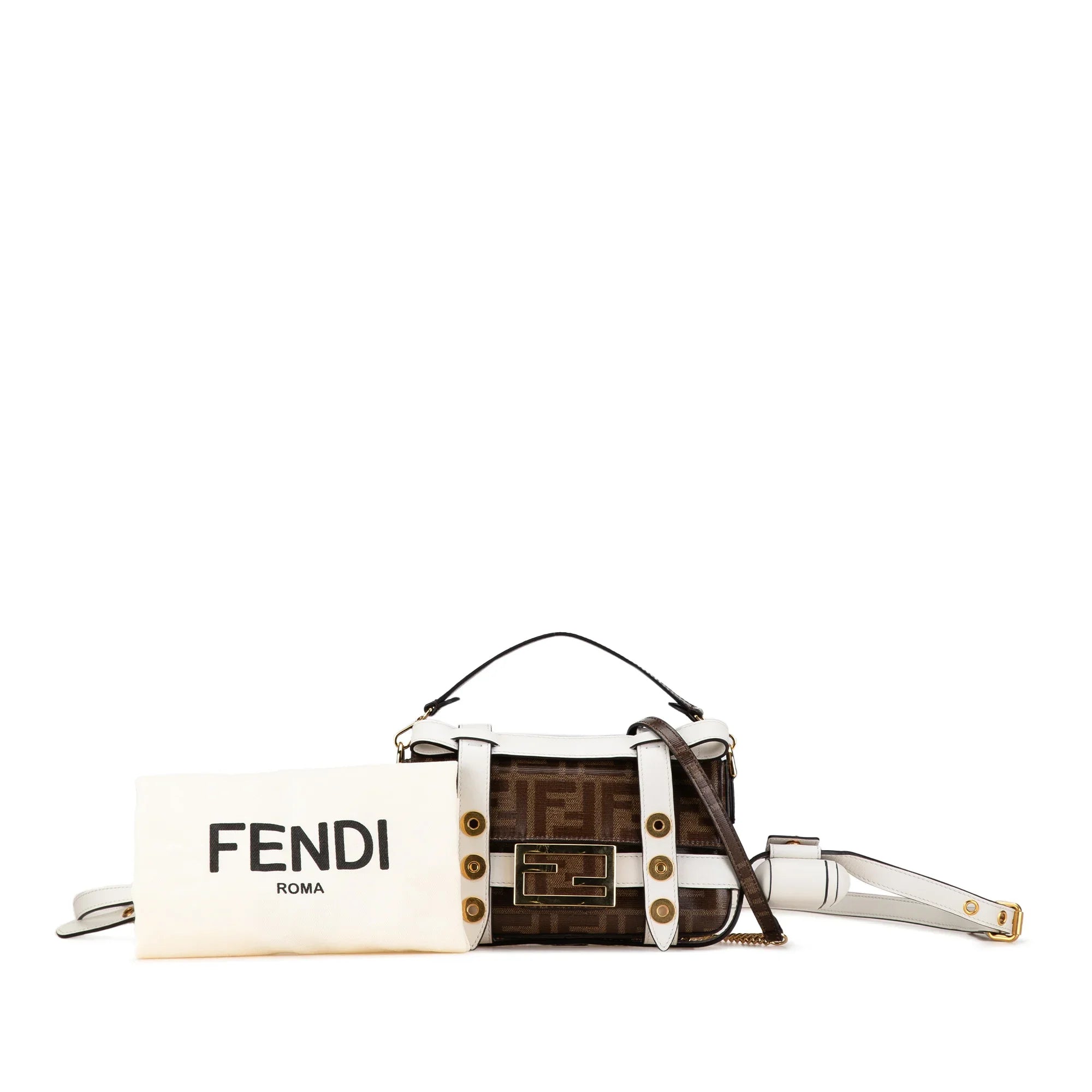 Product Details: Brown Fendi Mini Zucca Glazed Fabric Cage Baguette Satchel. This satchel features a coated canvas body with leather trim, a removable flat coated canvas handle, a flat leather shoulder strap, a detachable curb chain strap, a front flap with magnetic snap closure, a detachable exterior flap pouch, and an interior slip pocket. 4.7" L x 7.9" W x 2" D, 2" drop. Serial number 8BS034 A6V0 199 8241.