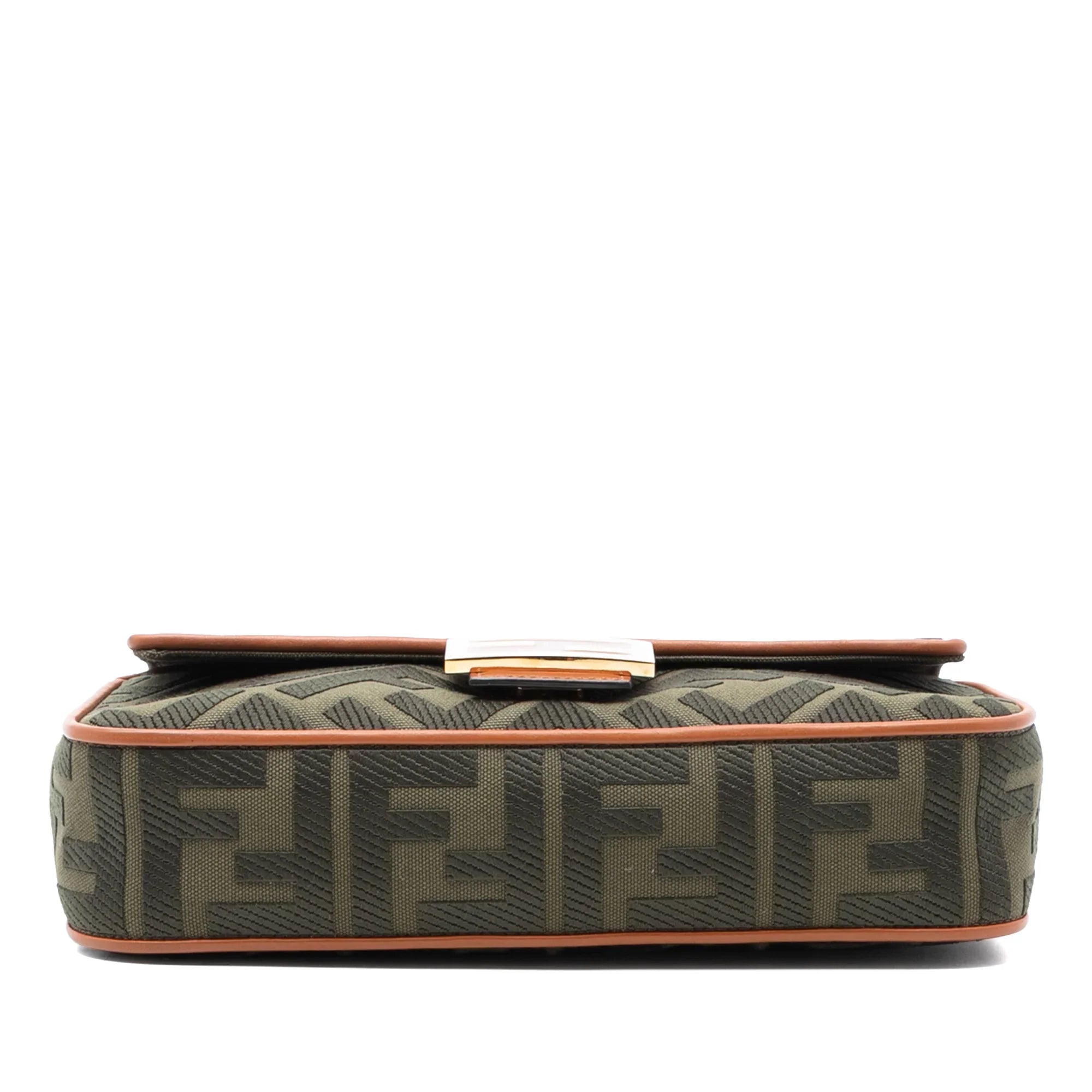 Product Details: Brown Fendi Zucca Embroidered Canvas Baguette Satchel. The Baguette features an embroidered canvas body with leather trim, a detachable flat leather top handle, a detachable flat canvas strap, a front flap with magnetic snap closure, and an interior zip pocket. 6.7" L x 10.6" W x 2.4" D, 3.1" drop. Serial number 8BR600 A9P6 208 10429.